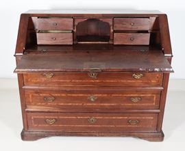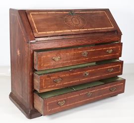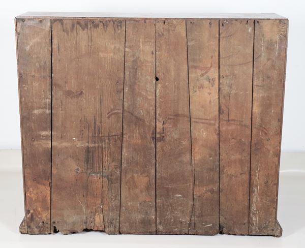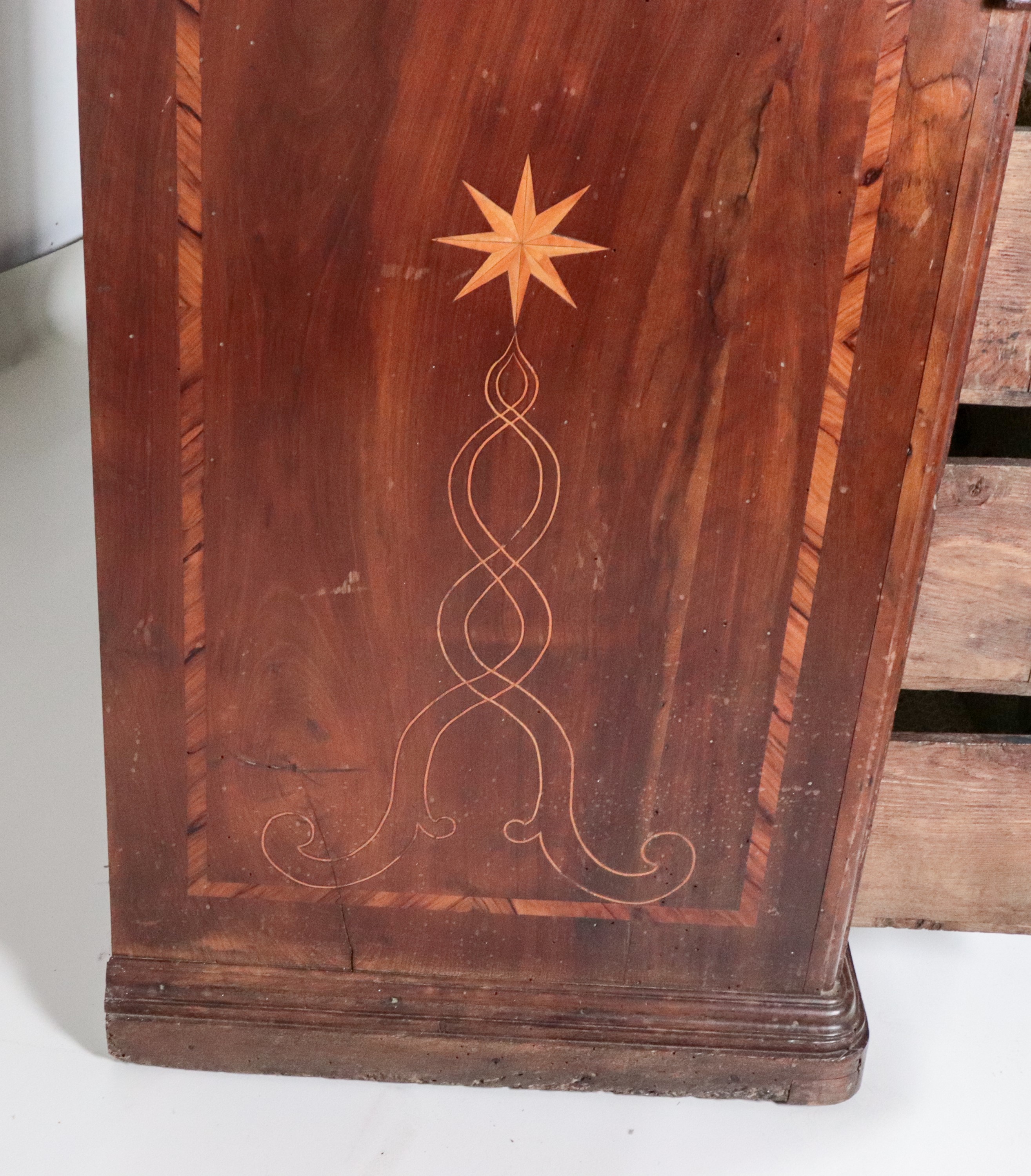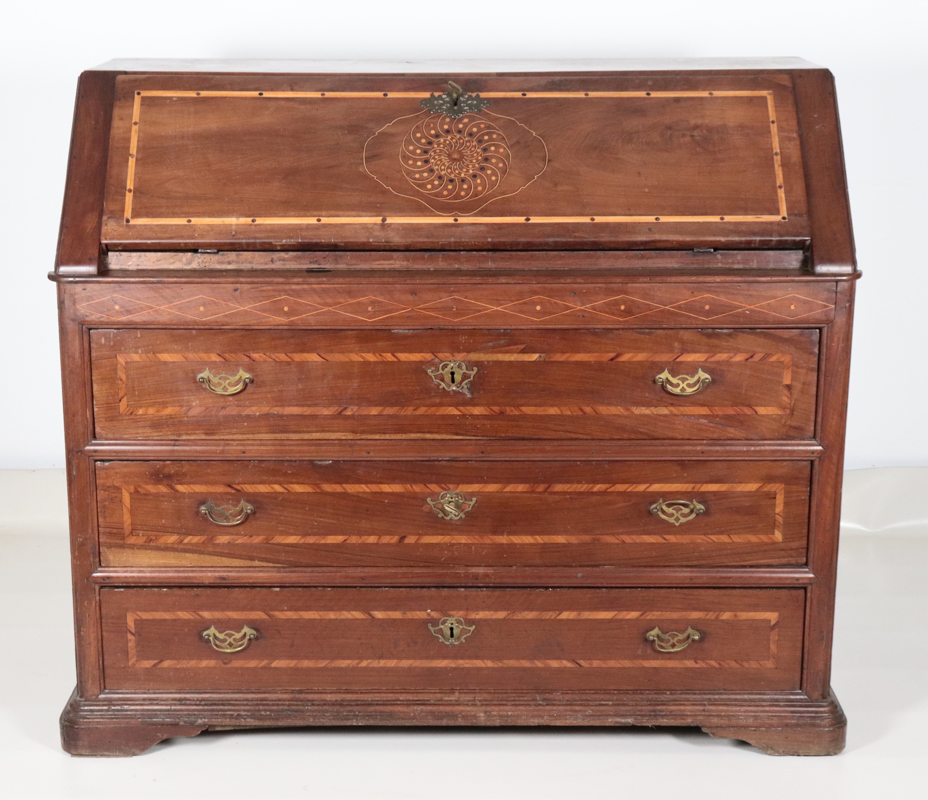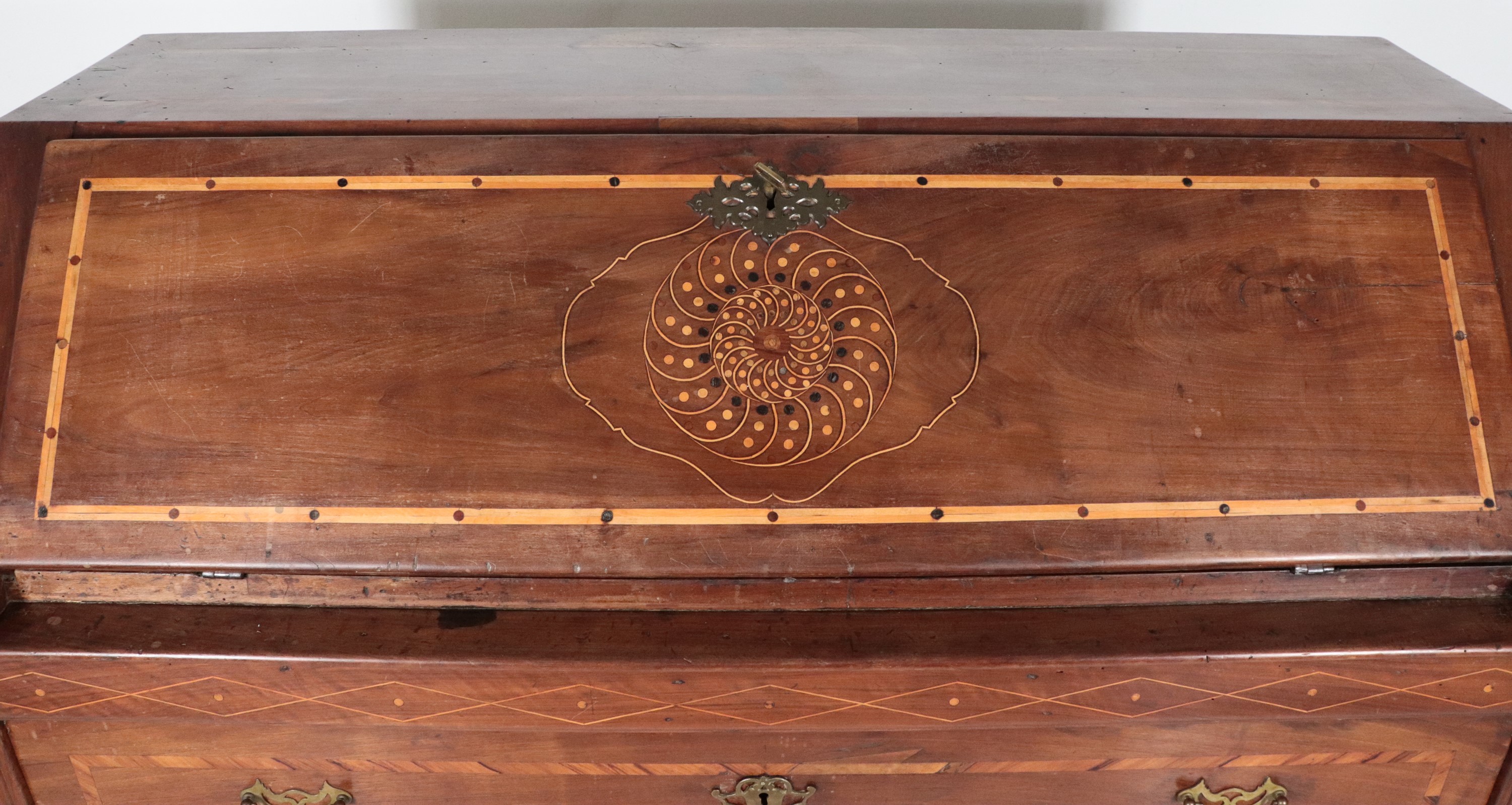 Antica ribalta napoletana Luigi XV in noce, con intarsi in bosso, ulivo e acero a motivi geometrici, rosone e stelle