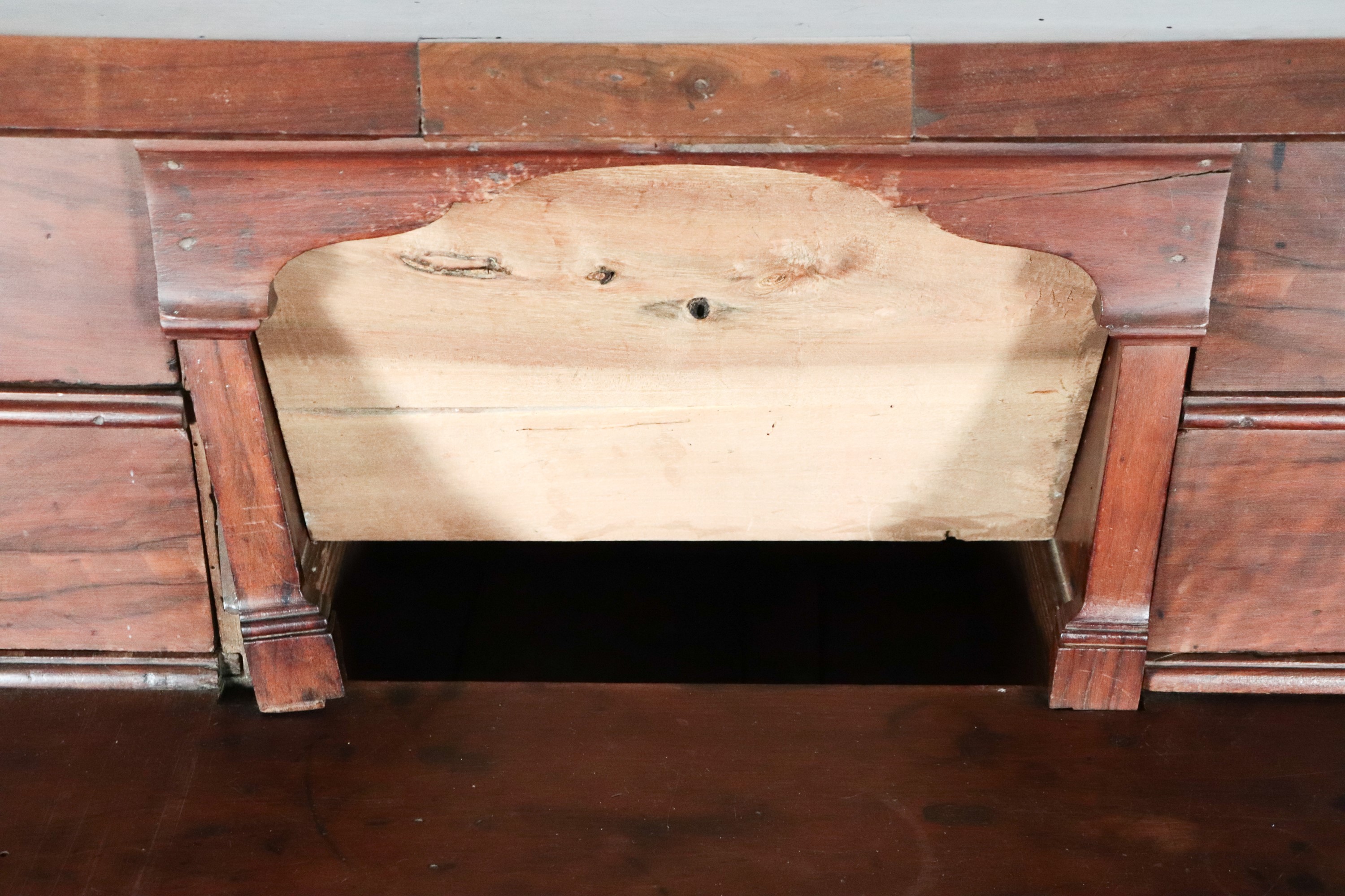 calatoia formante scrittoio e tre tiretti sottostanti. La serratura del primo tiretto è danneggiata, cm 138 x 60 x 114 h.