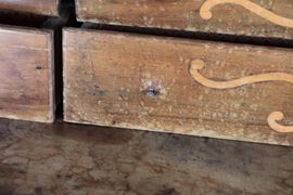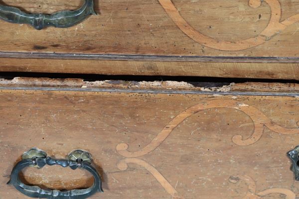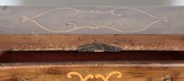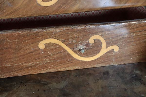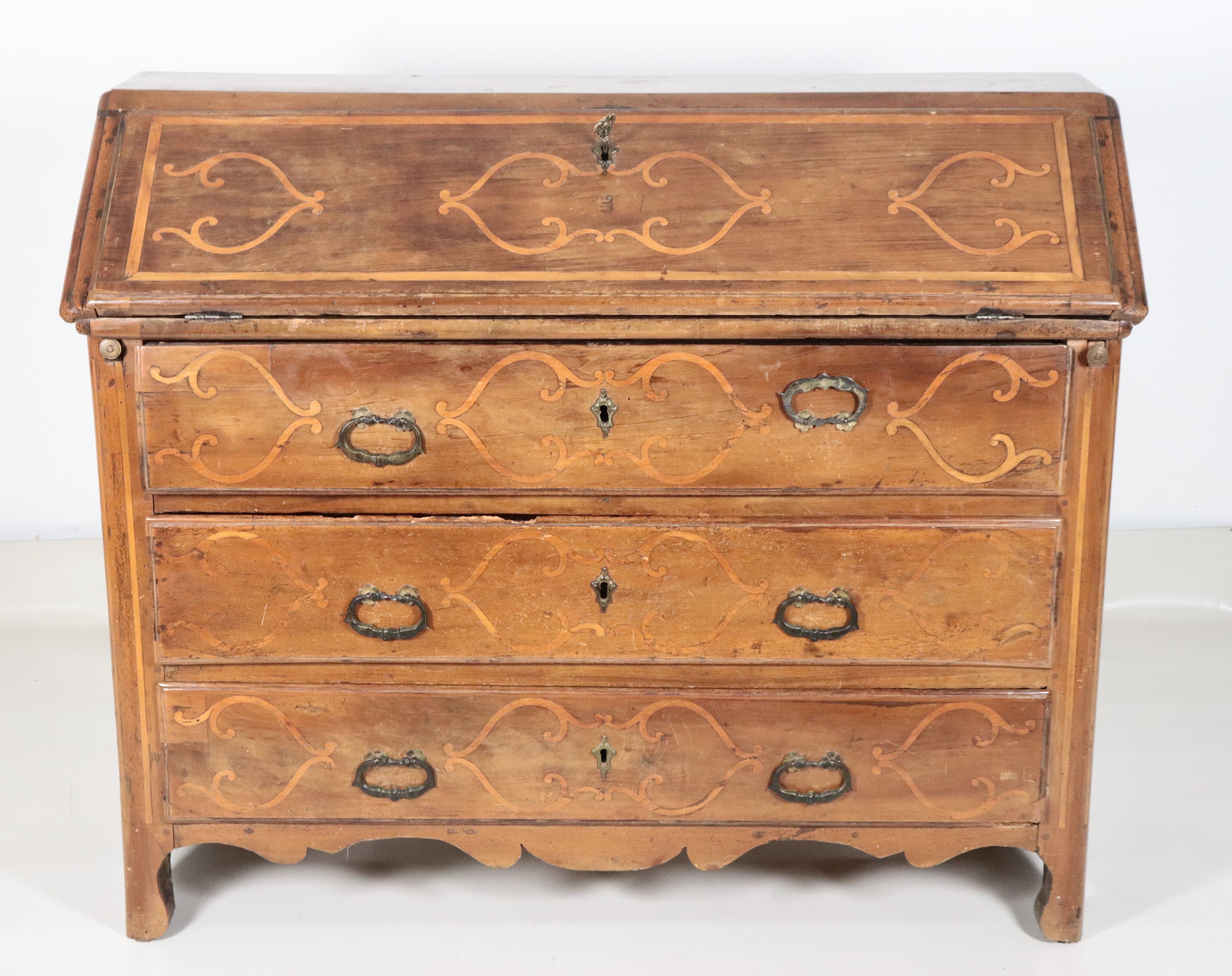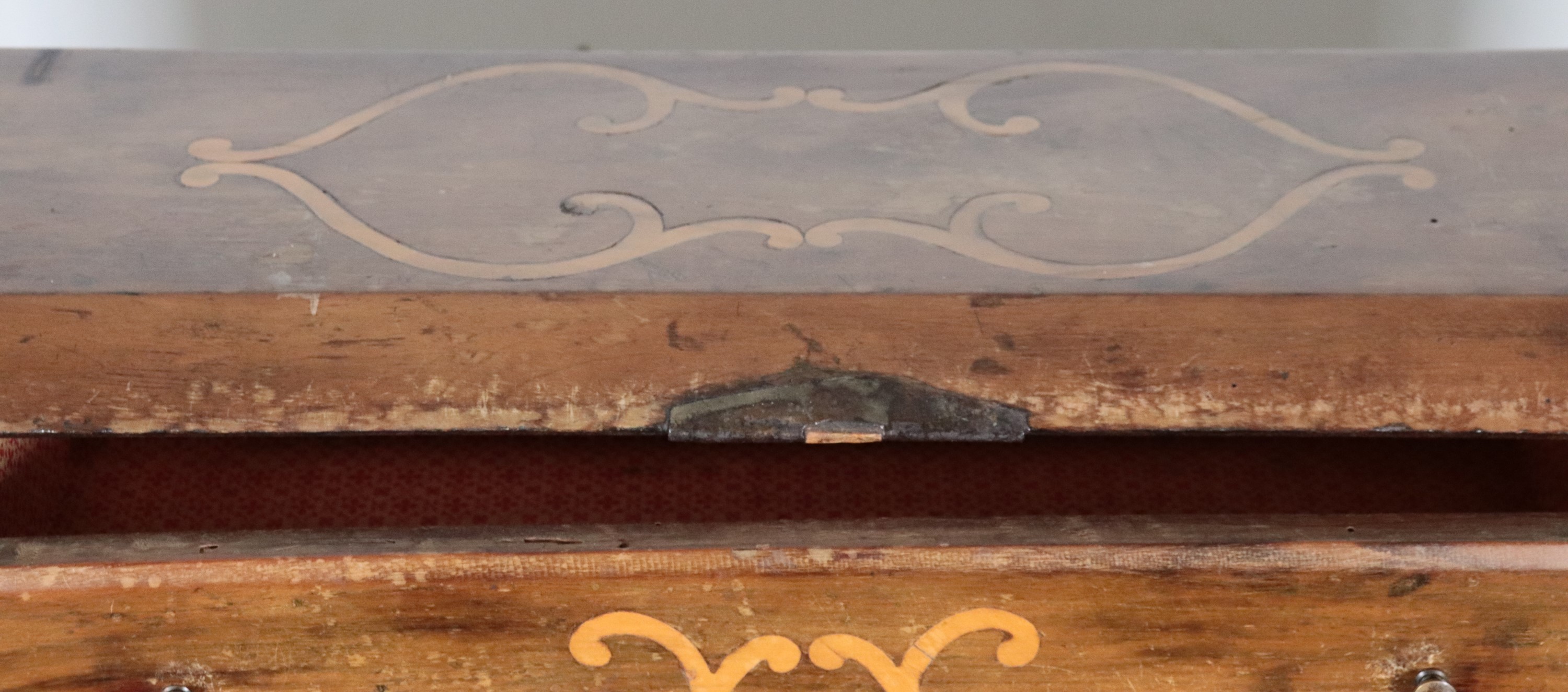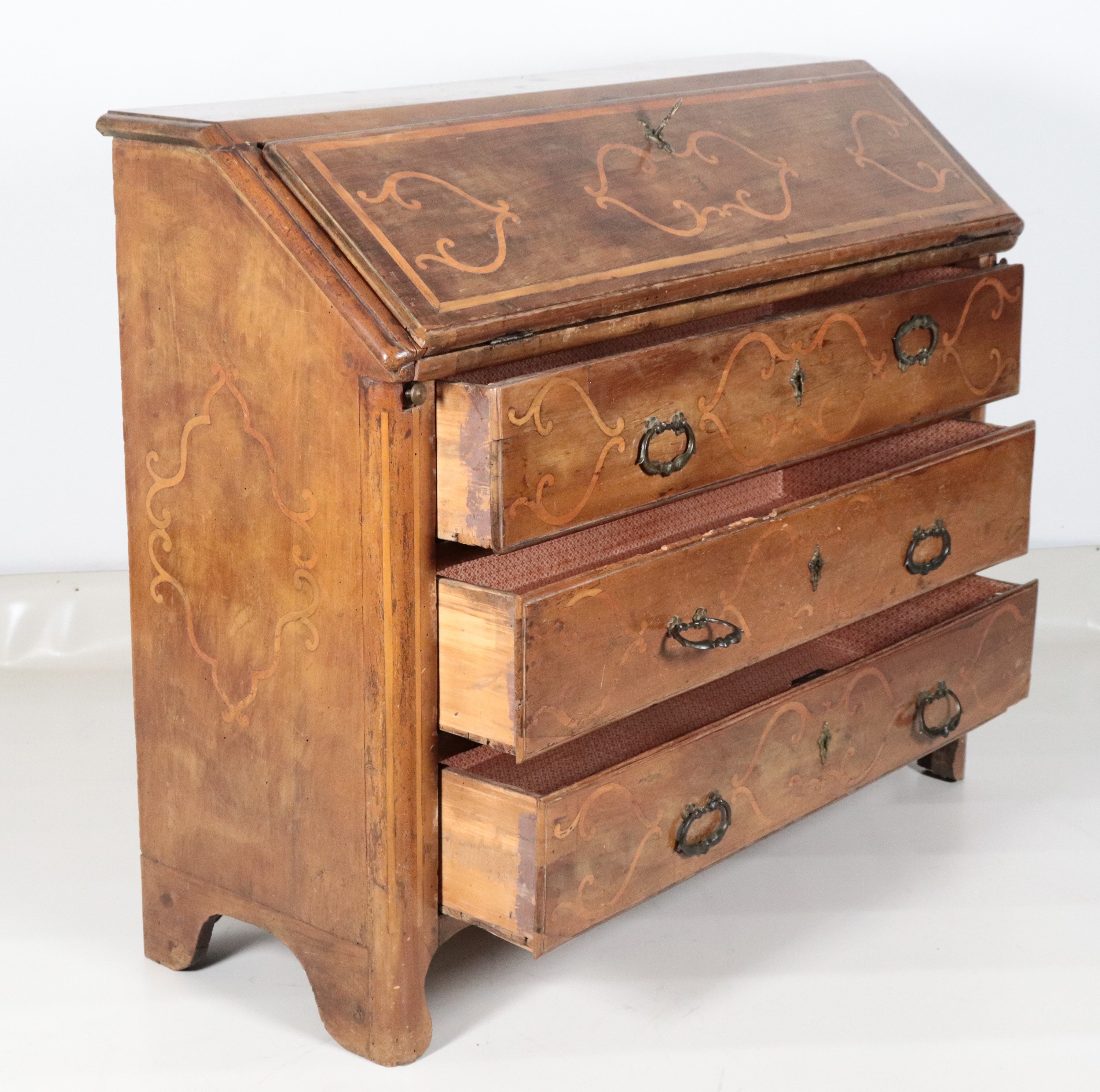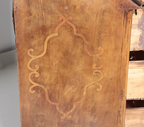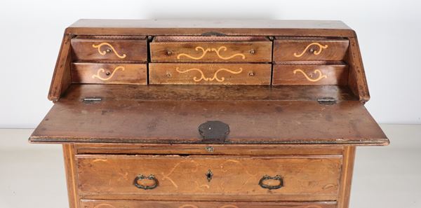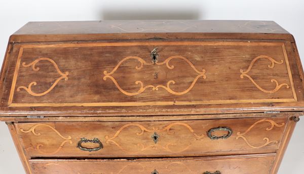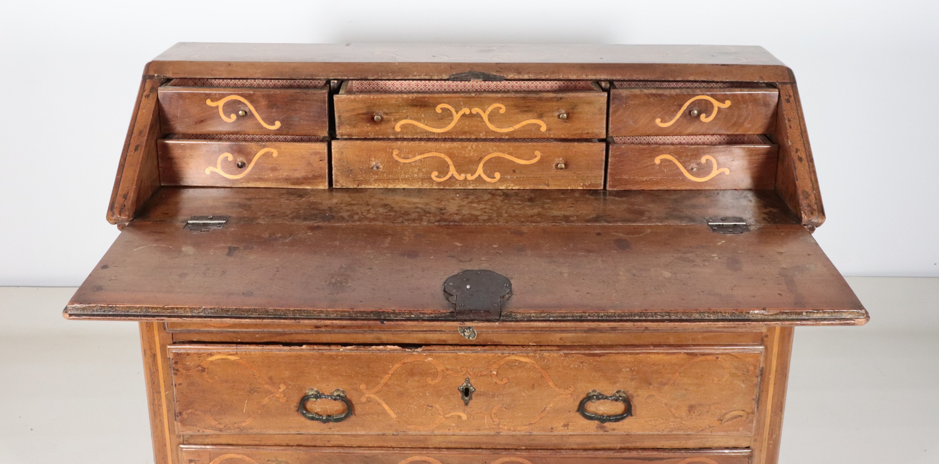 Antica ribalta piemontese Luigi XV in noce, con intarsi in bosso a motivi di volute e filettature