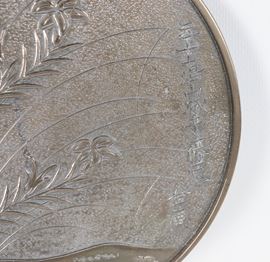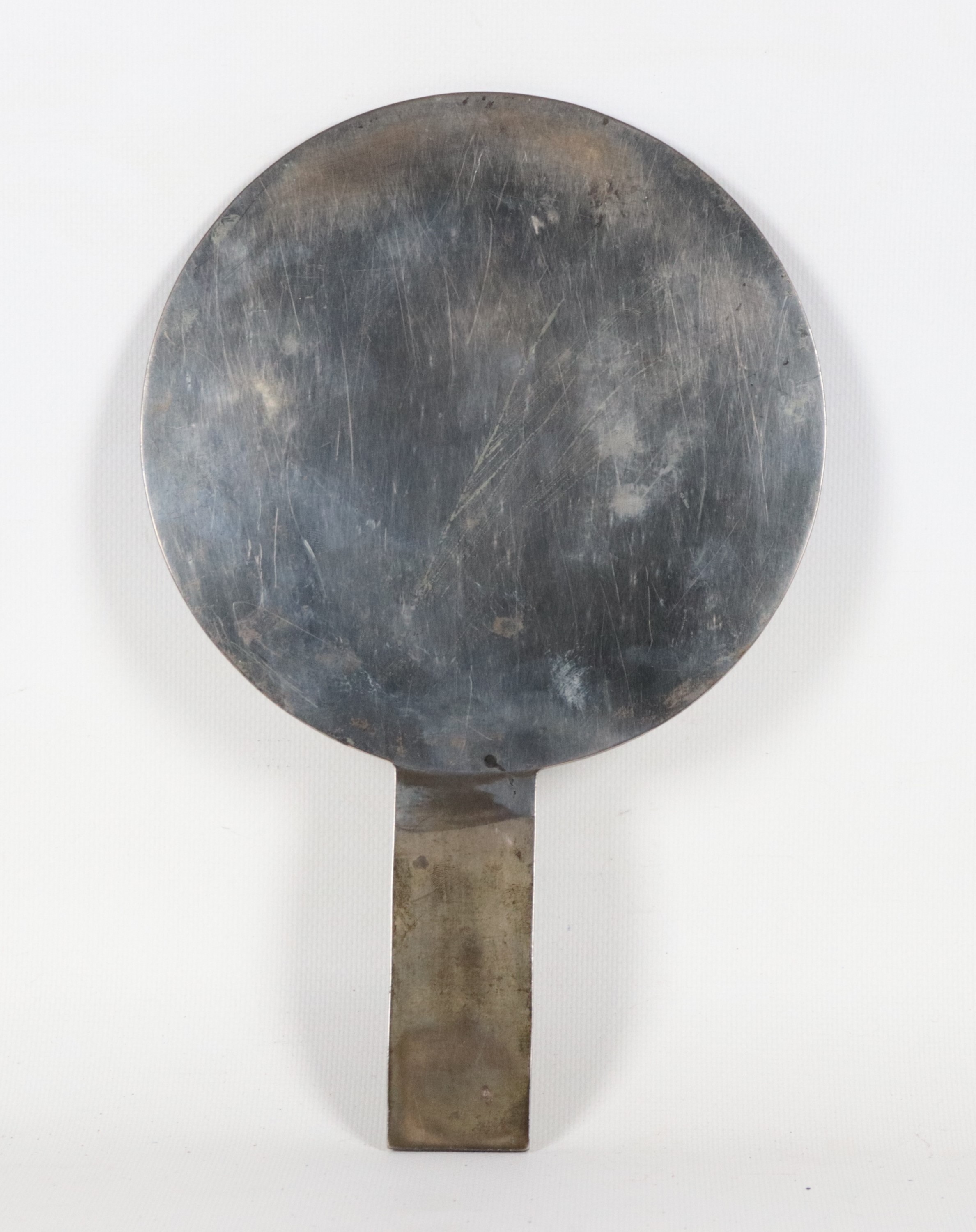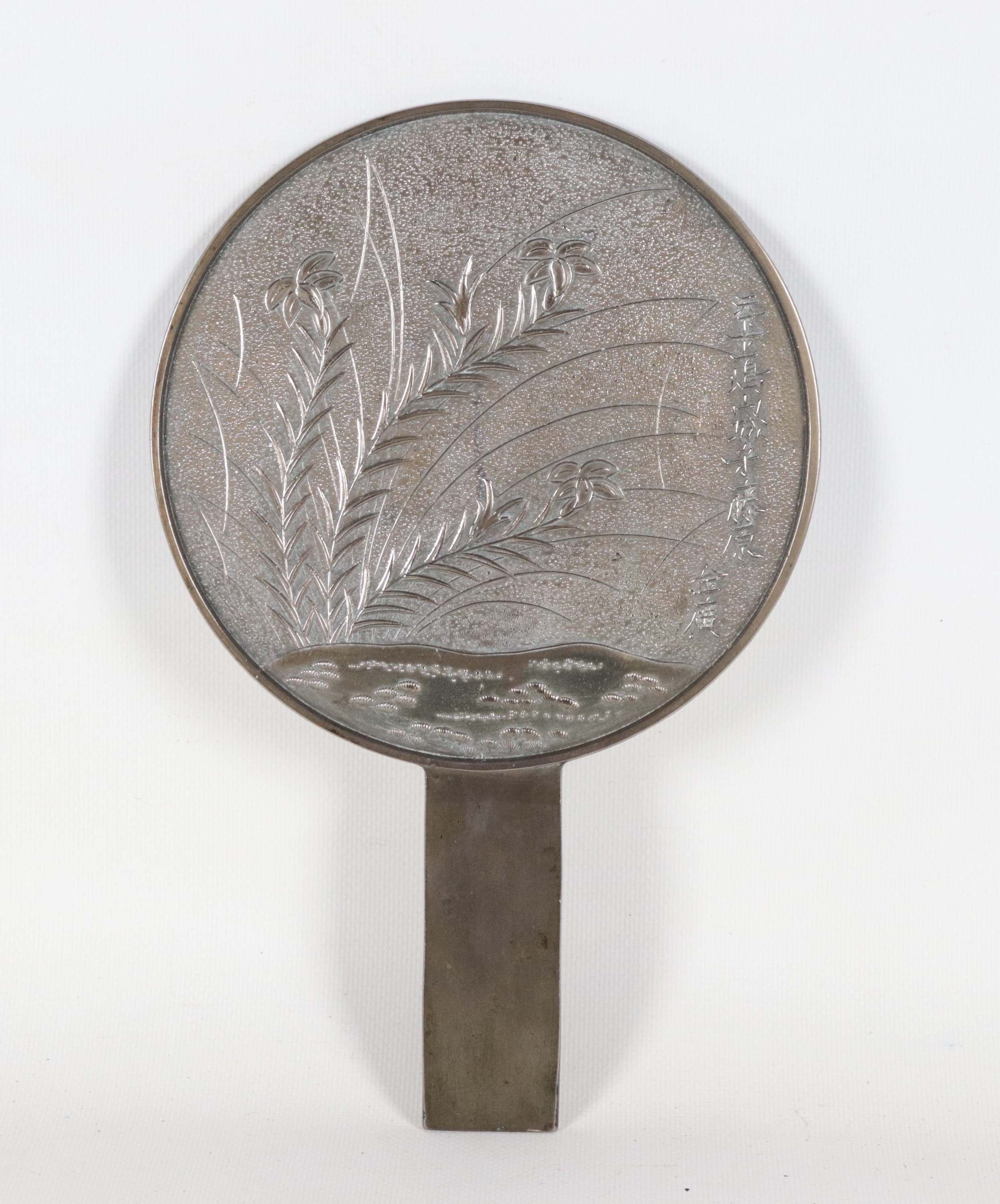 Antico parascintille cinese a forma di ventaglio in metallo argentato e sbalzato a motivi orientali