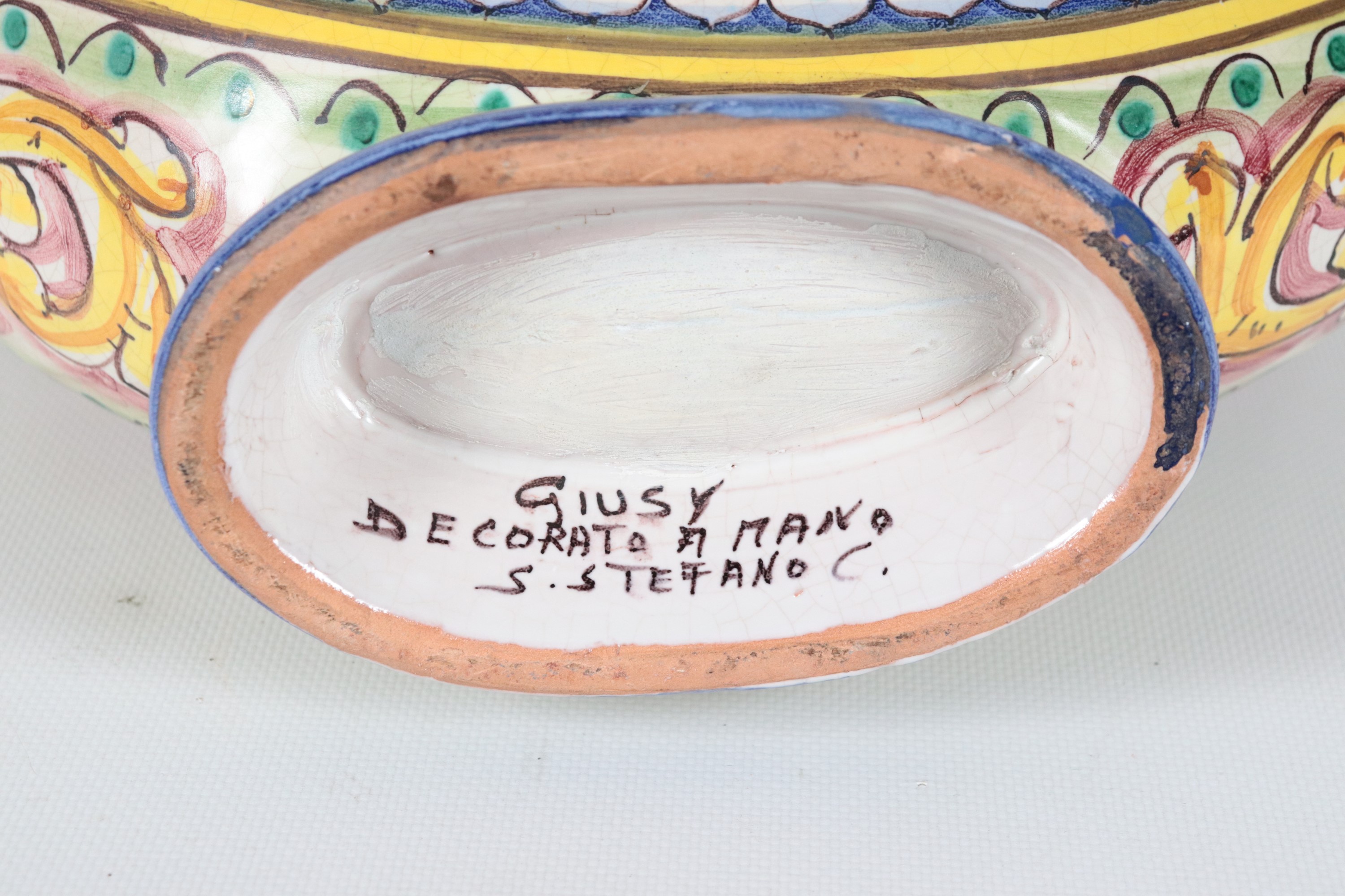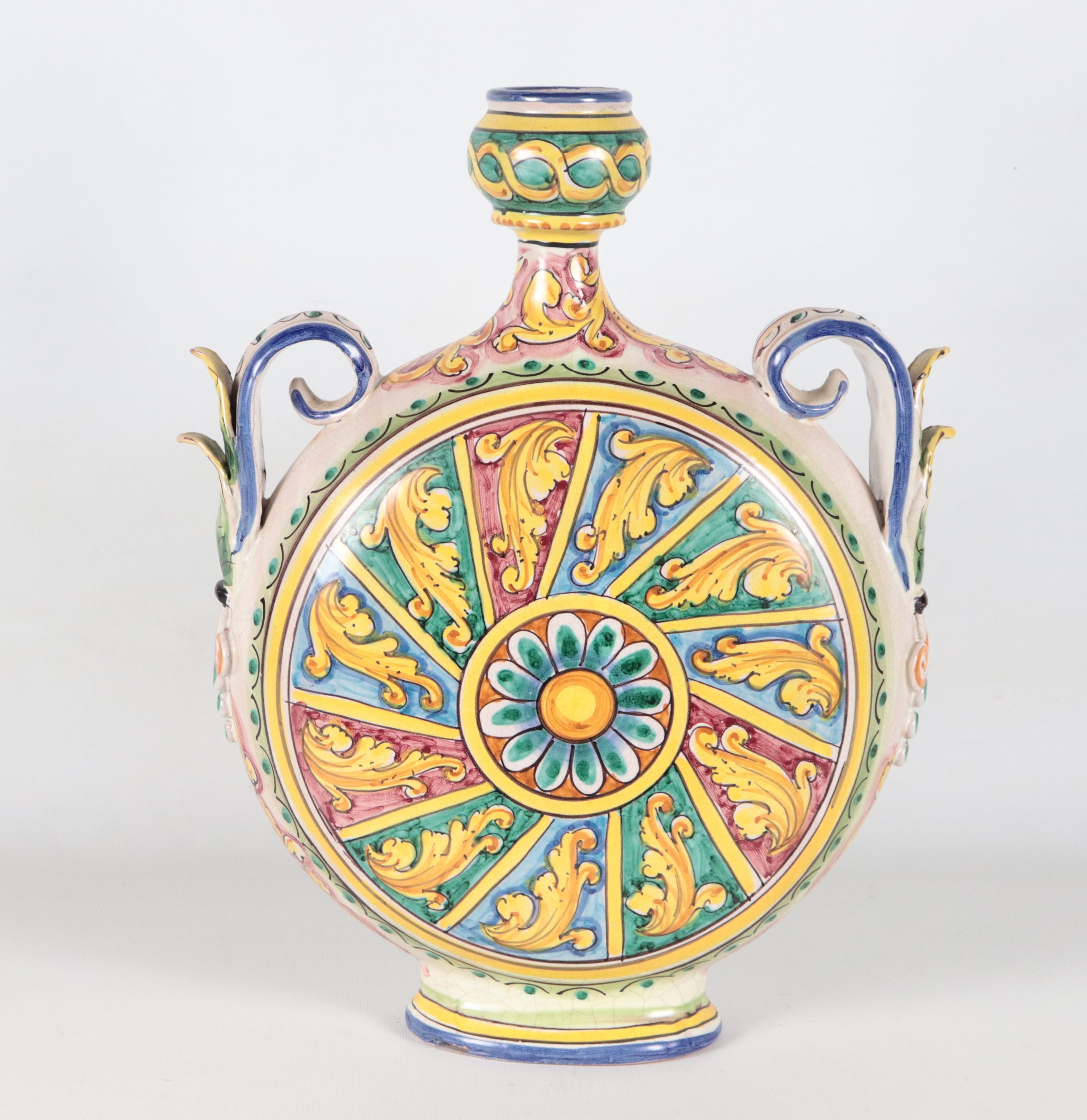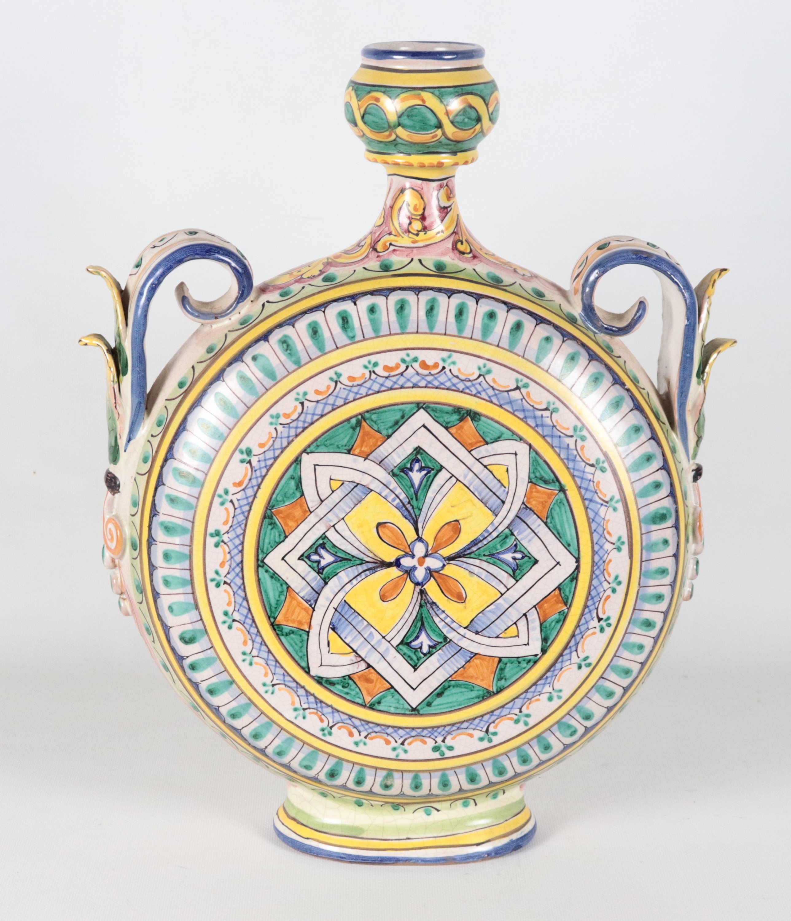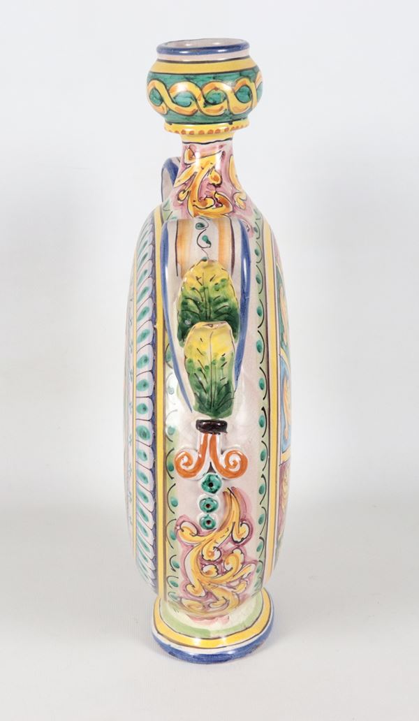 Fiasca in maiolica smaltata Caltagirone, con decorazioni policrome a motivi arabi-siciliani
