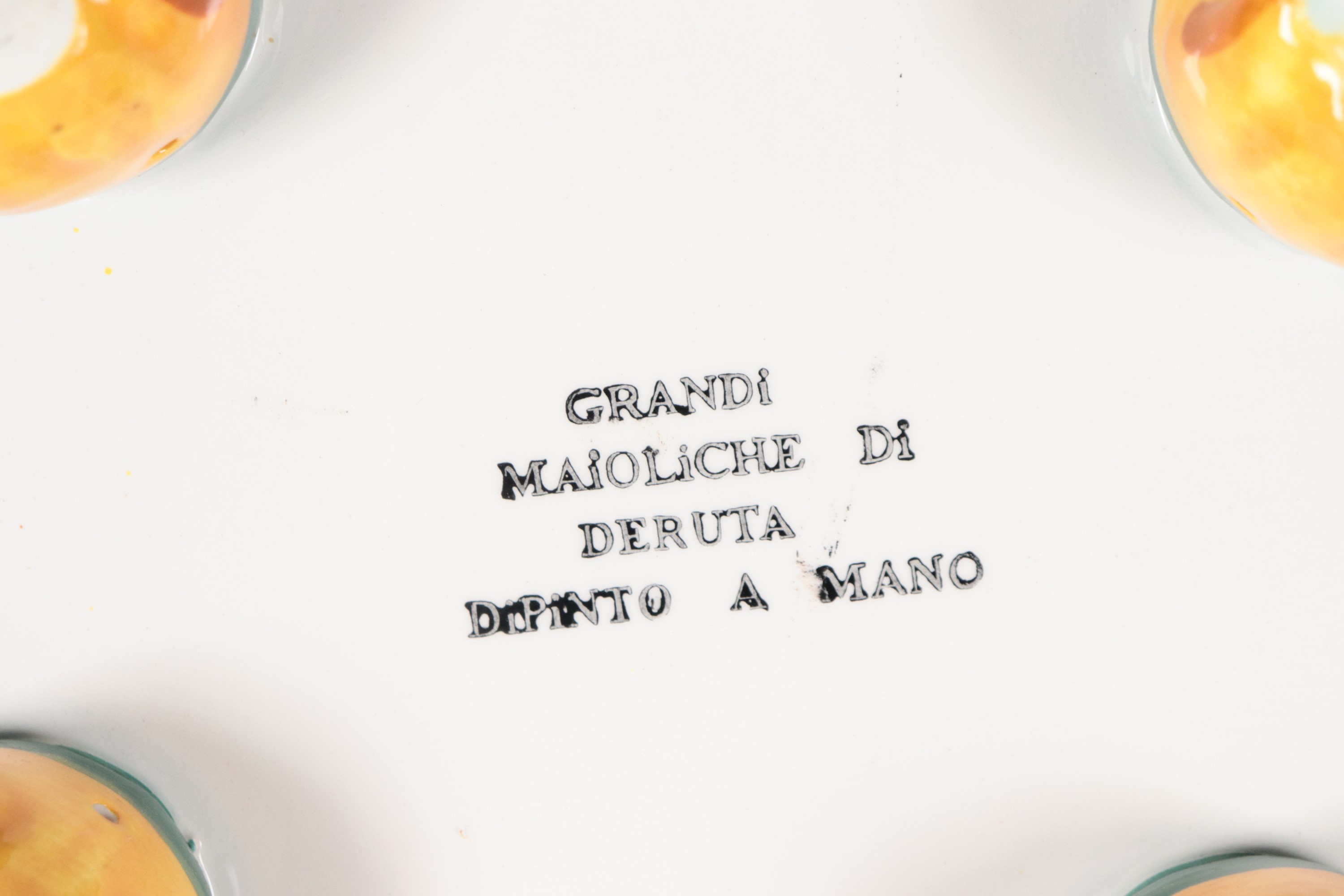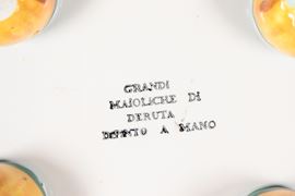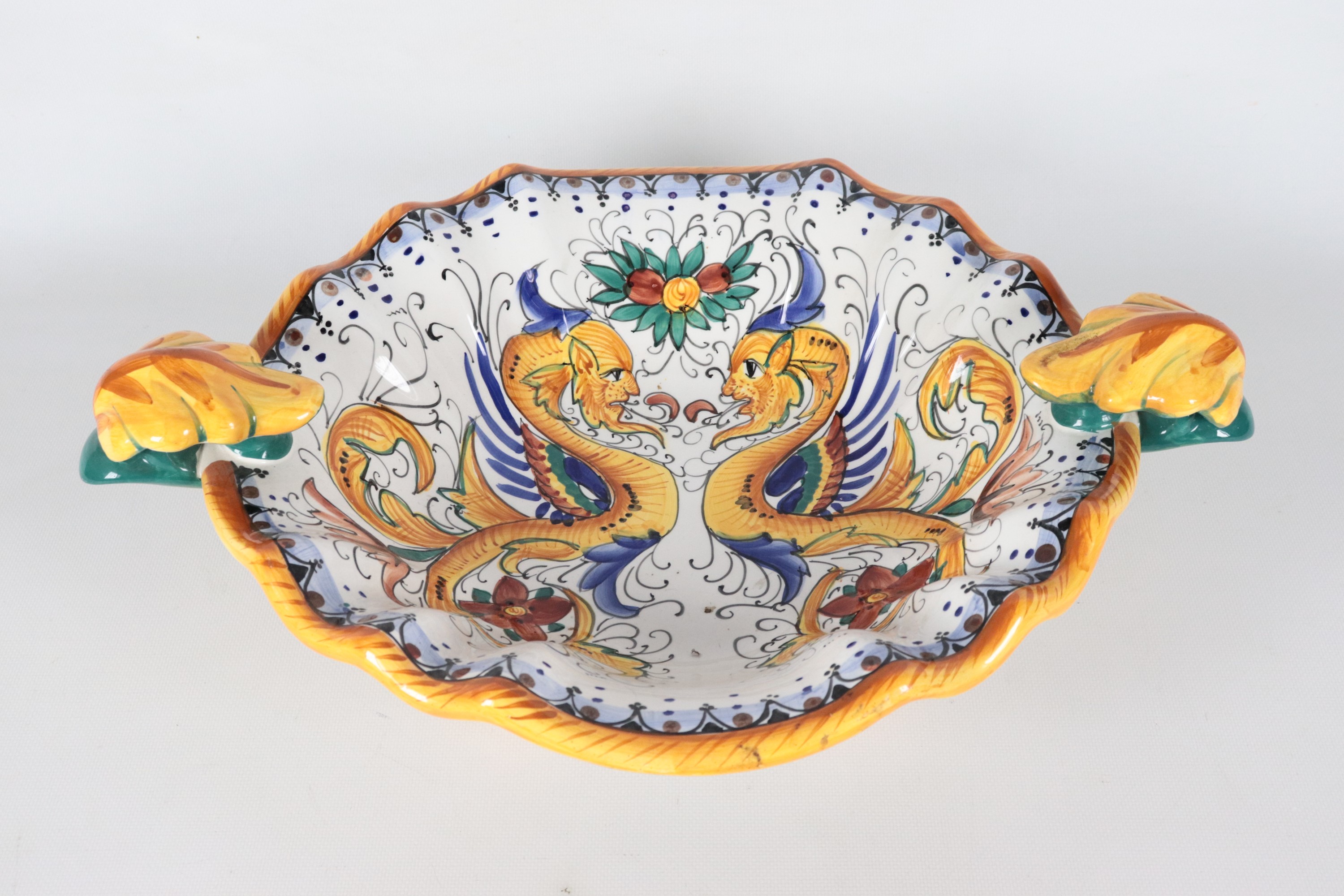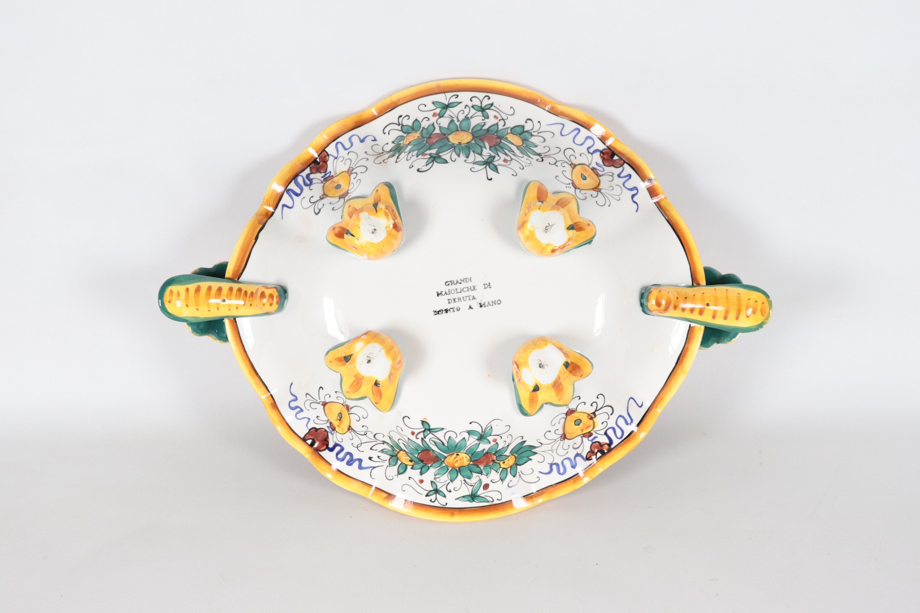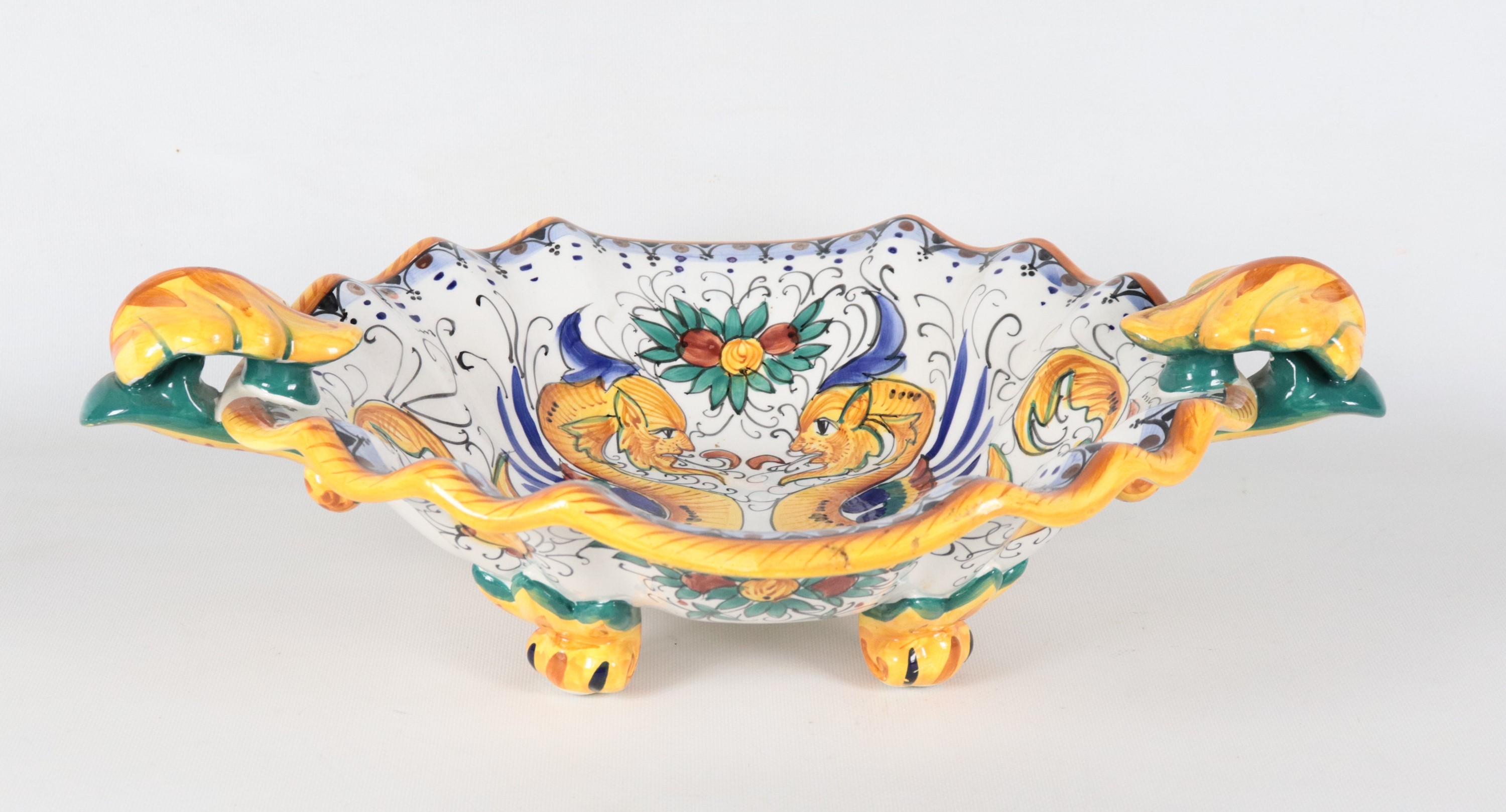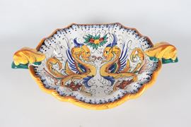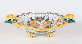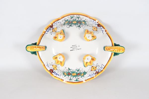 Fruttiera ovale in maiolica smaltata Deruta, con decorazioni policrome a motivi seicenteschi