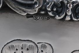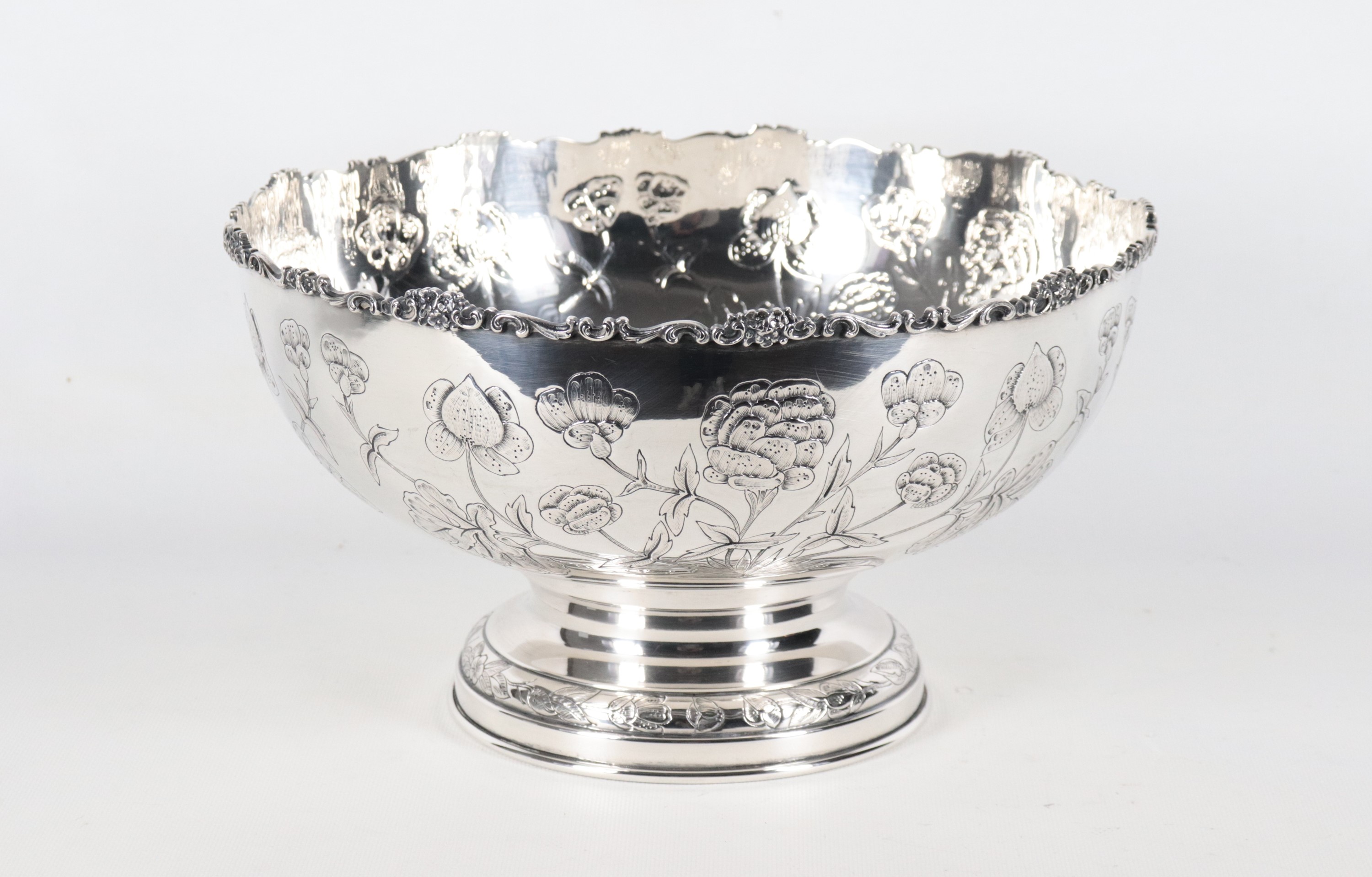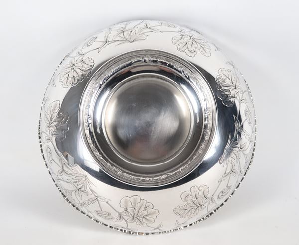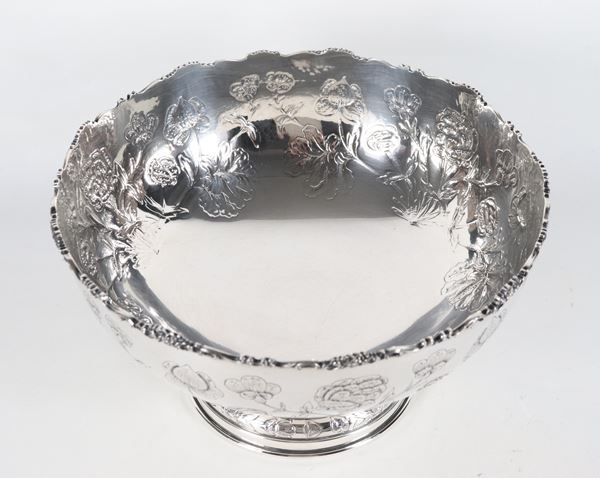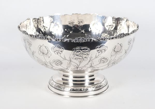 Grande coppa in argento cesellato e sbalzato a motivi di fiori, gr. 1200