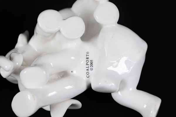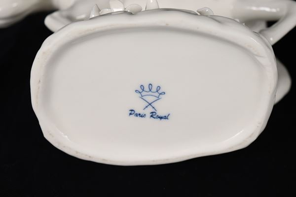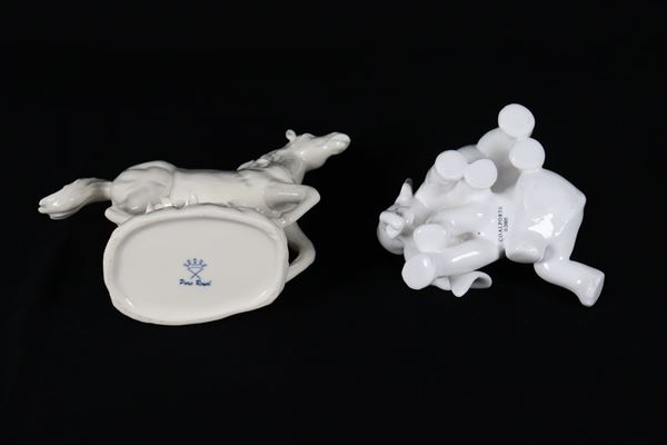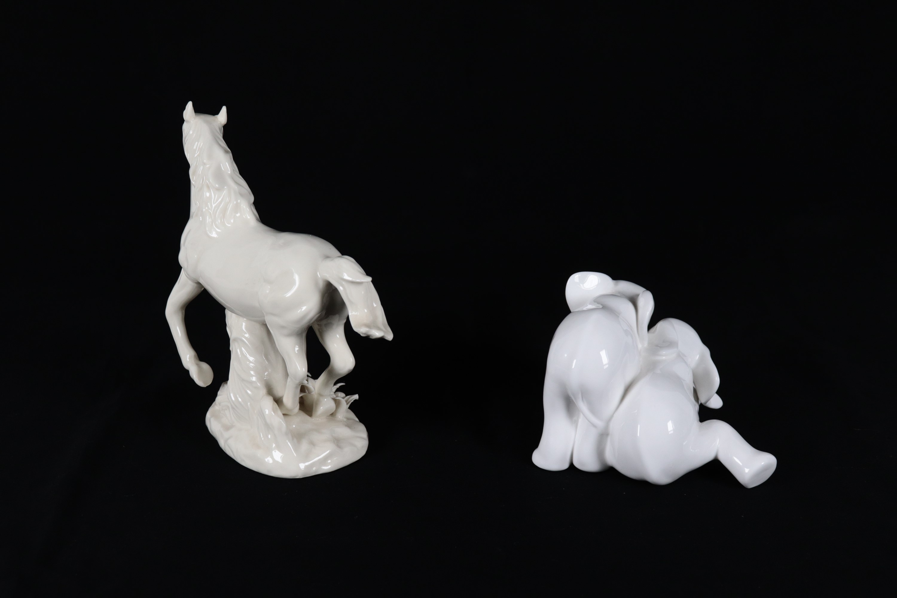Lotto di due statuine in porcellana bianca smaltata, cavallo e due elefantini