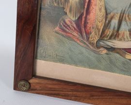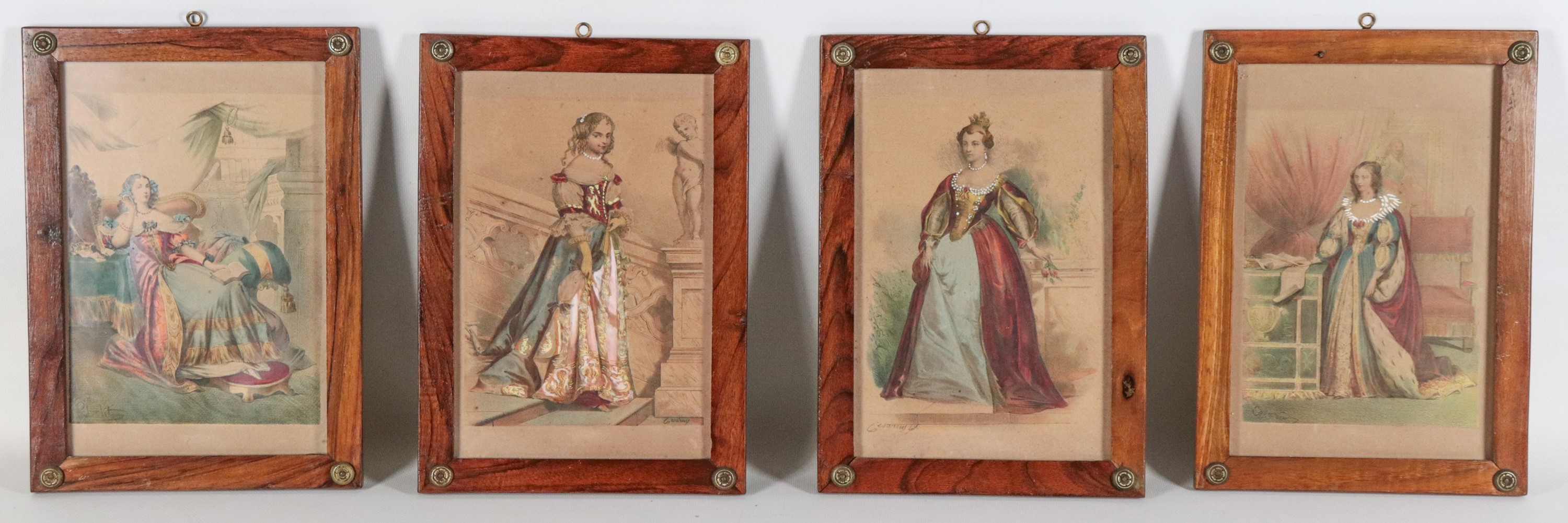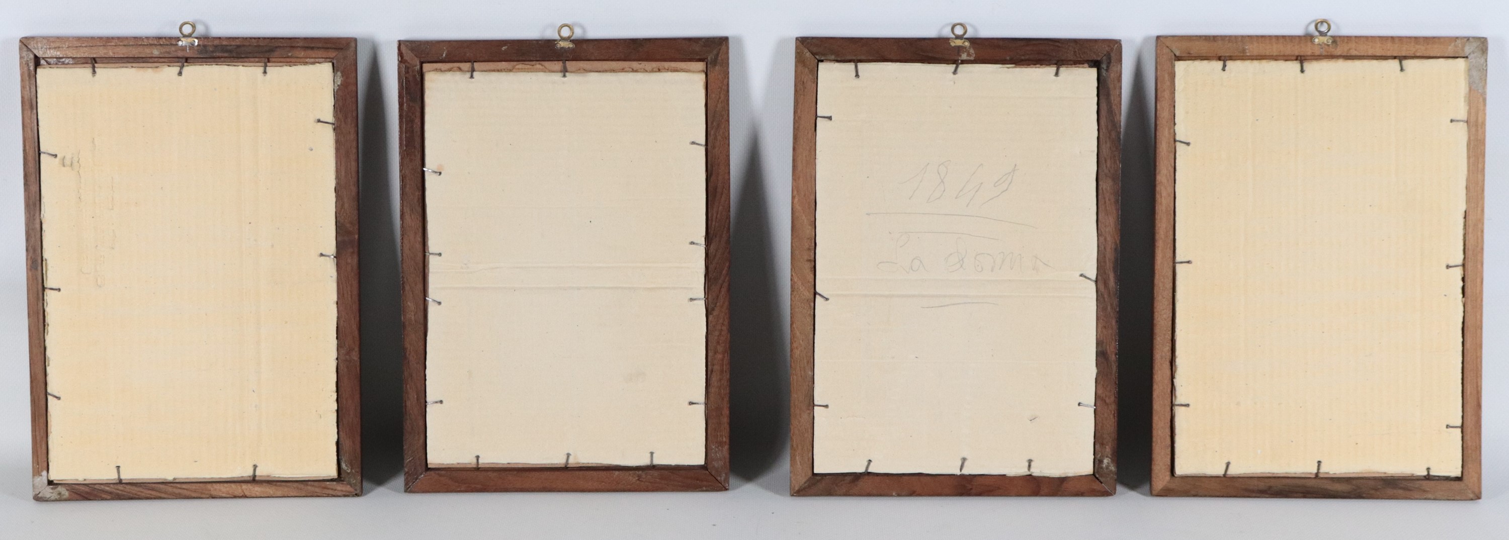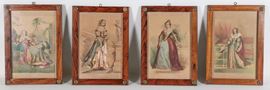 lotto di quattro antichi piccoli disegni acquarellati su carta cornici in legno di noce. Firmati, cm 27 x 18 ciascuno.