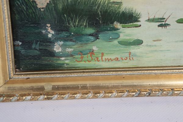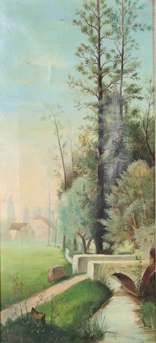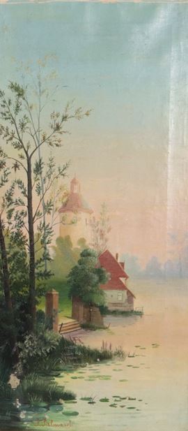 Firmati. "Vedute di lago con bosco e case"