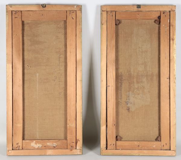 coppia di dipinti ad olio su telacornici in legno dorato, cm 60 x 27 ciascuno.