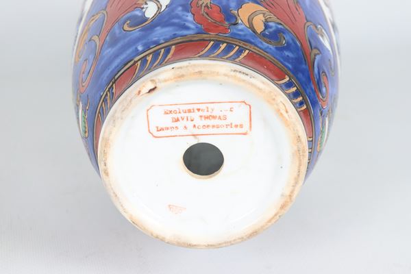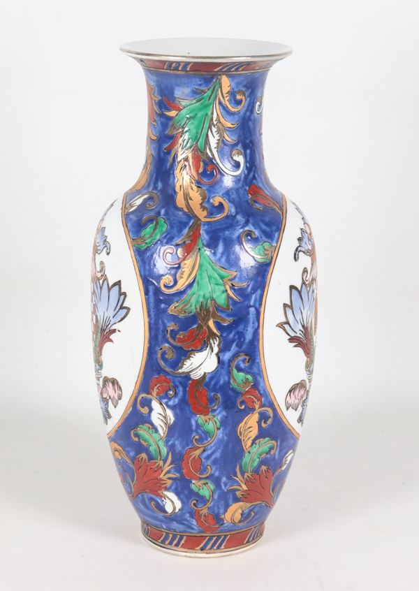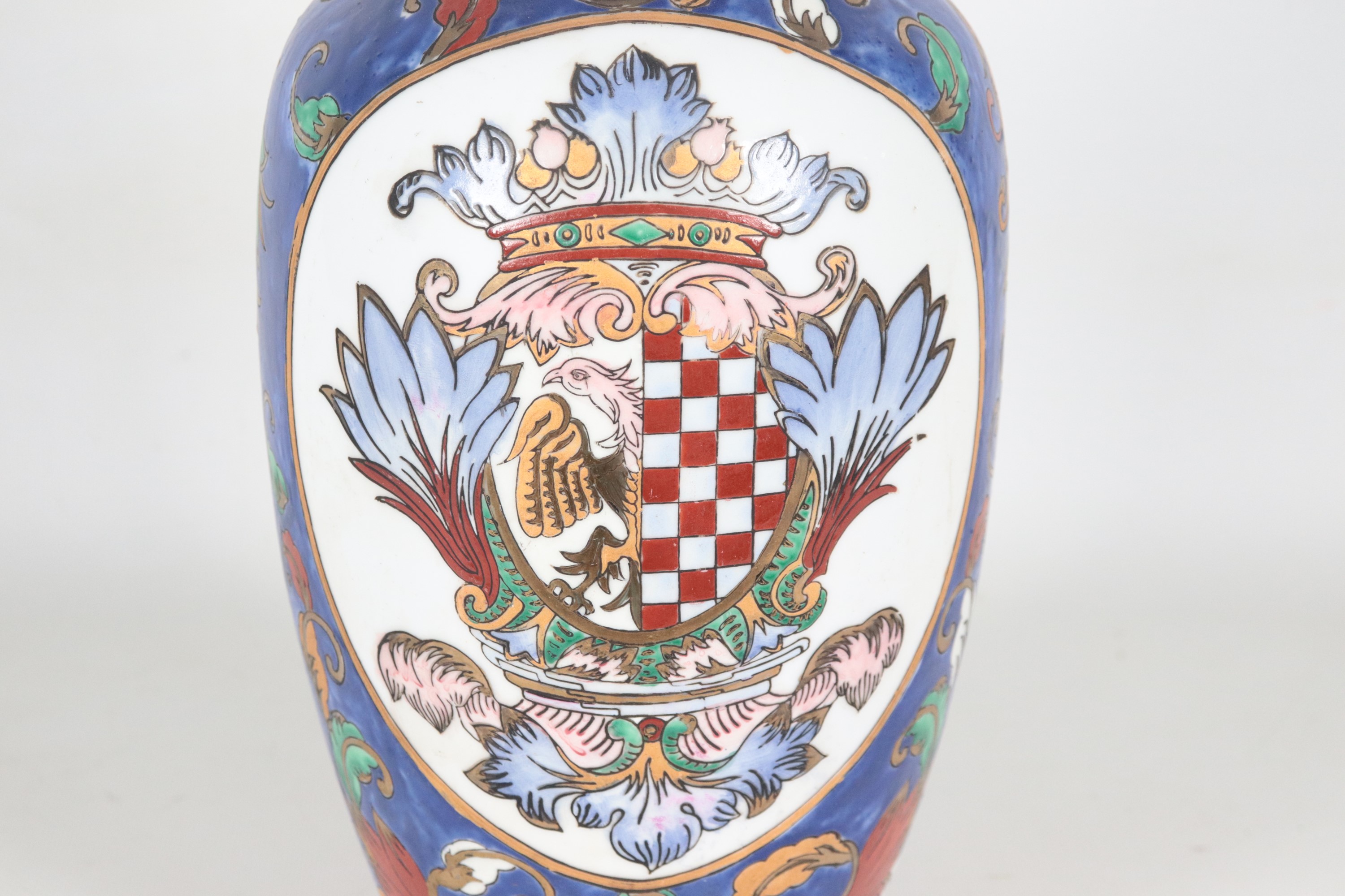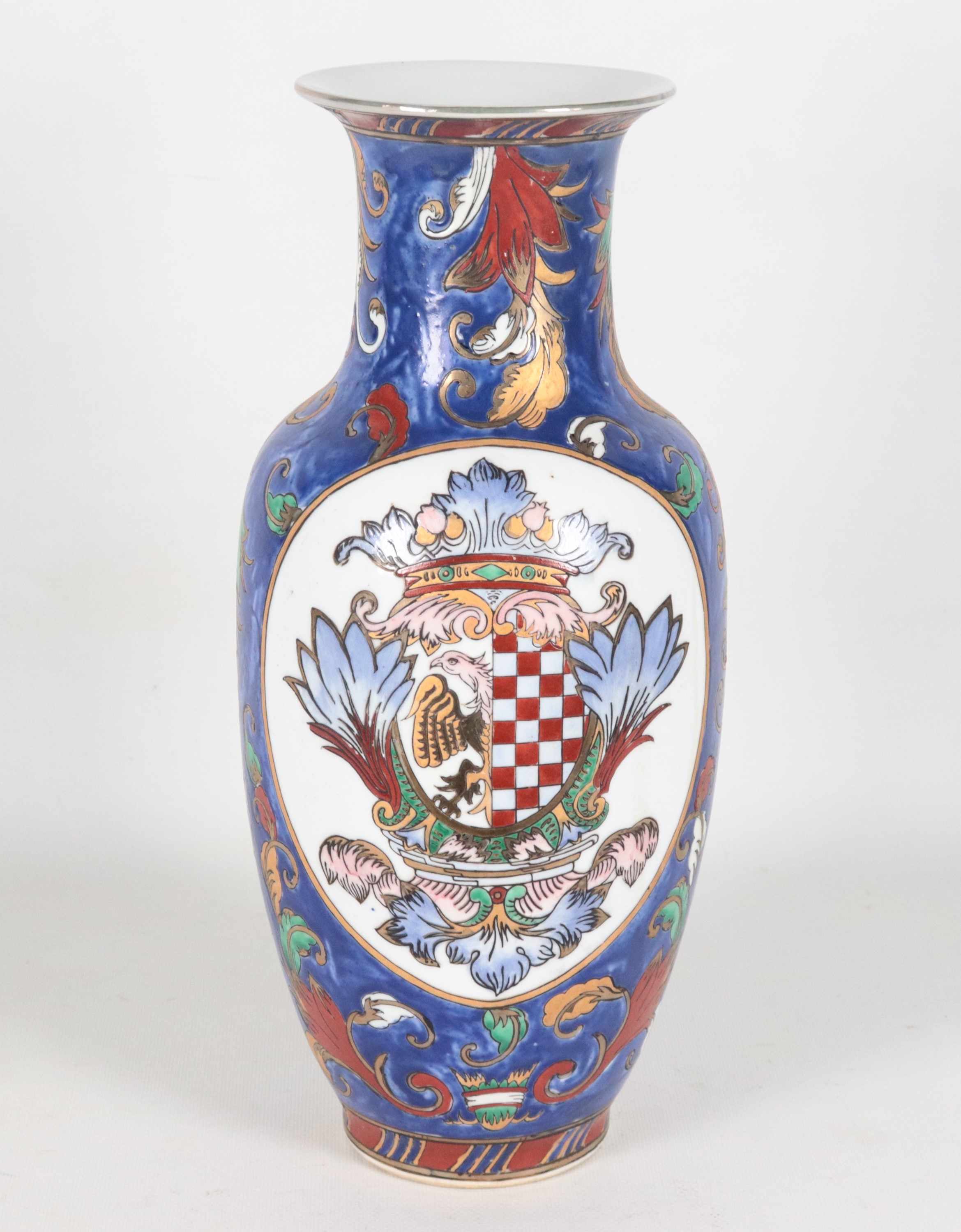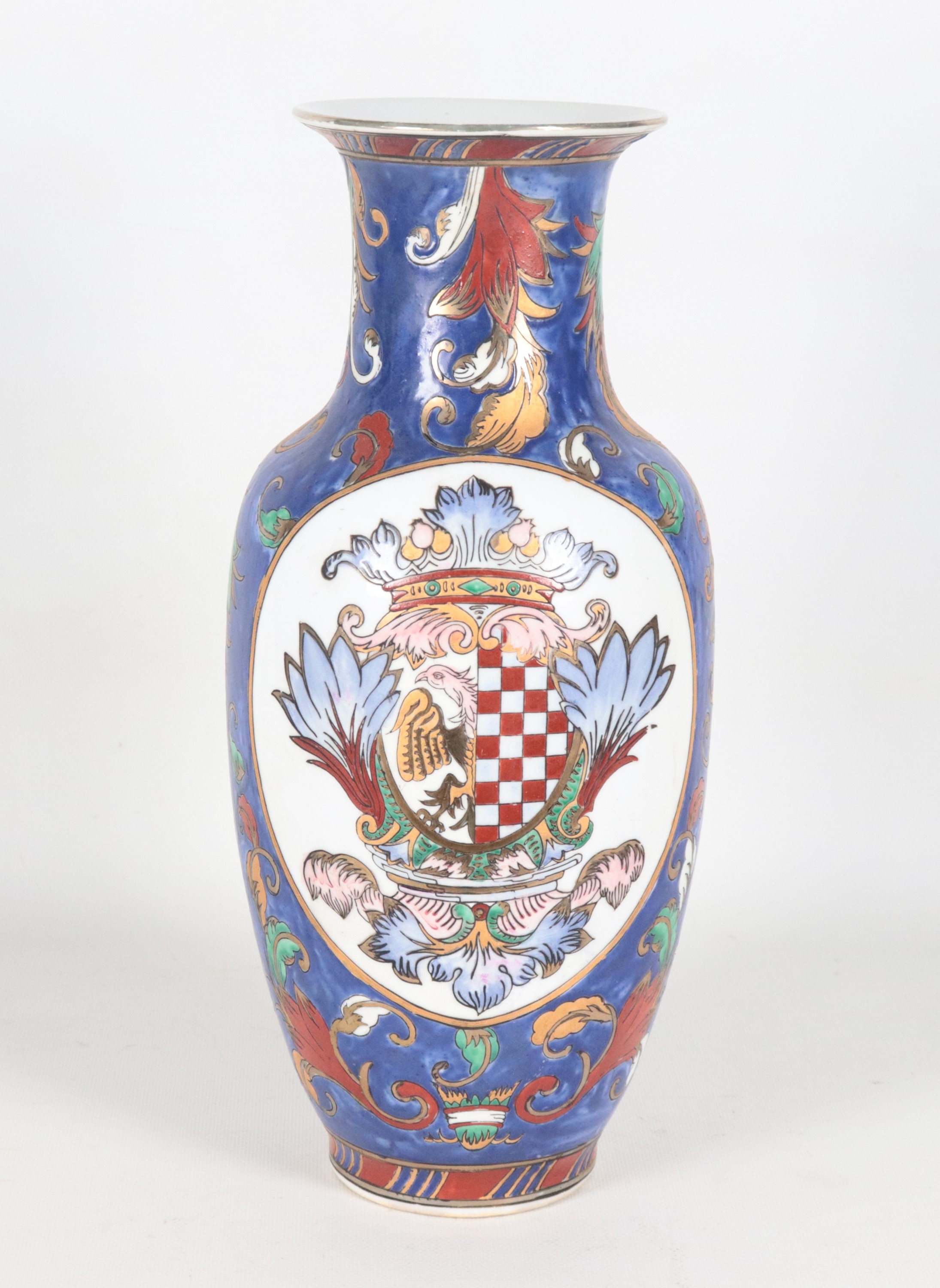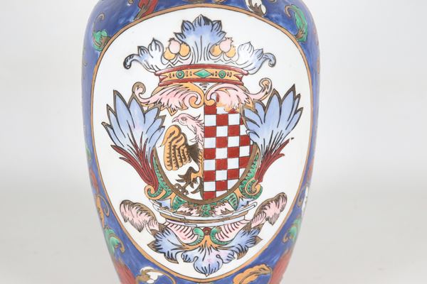 Vaso in porcellana inglese, con decorazioni policrome a volute e stemmi gentilizi