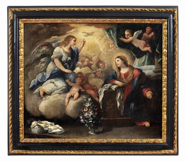 The painting is a clear example of classicist Neapolitan painting and the Rococo movement with results of narrative enthusiasm and agile formal richness, ancient ebonized and gilded wood frame. The painting has an ancient relining, 63.5 x 75 cm.