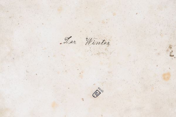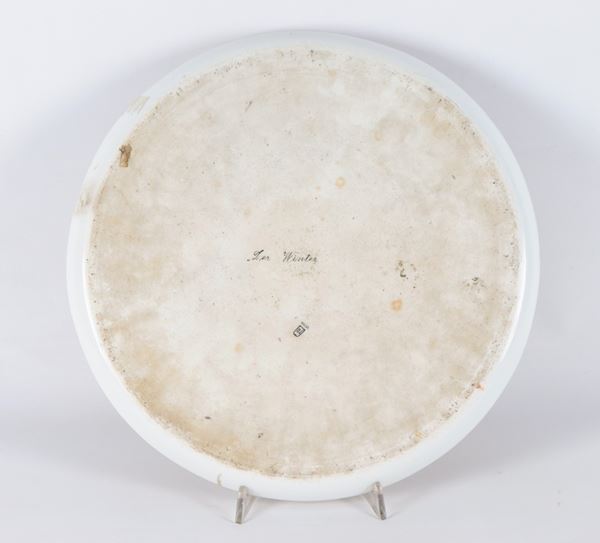 "Allegoria dell'inverno", antico grande piatto in porcellana Royal Vienna, interamente dipinto a motivi di intrecci floreali e oro zecchino