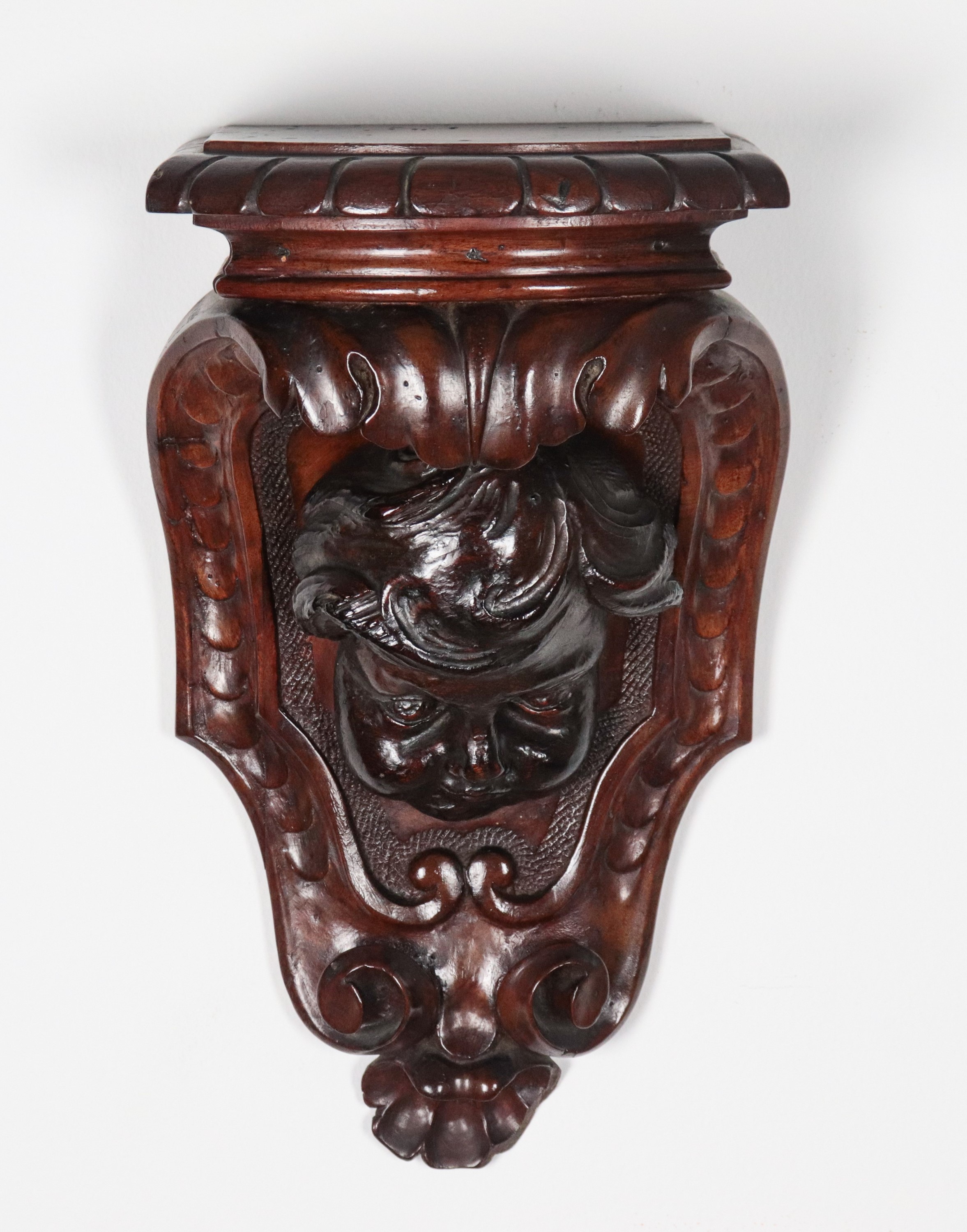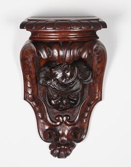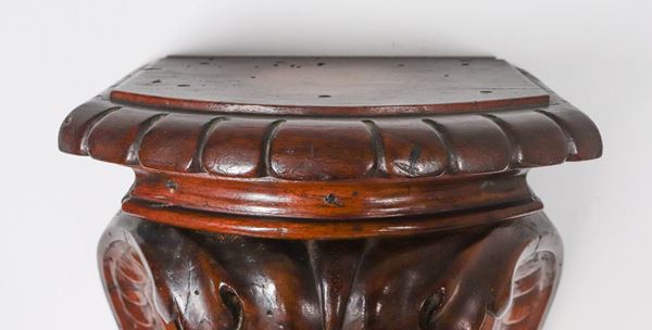Antica mensola da muro in noce, intagliata a rilievo con mascherone