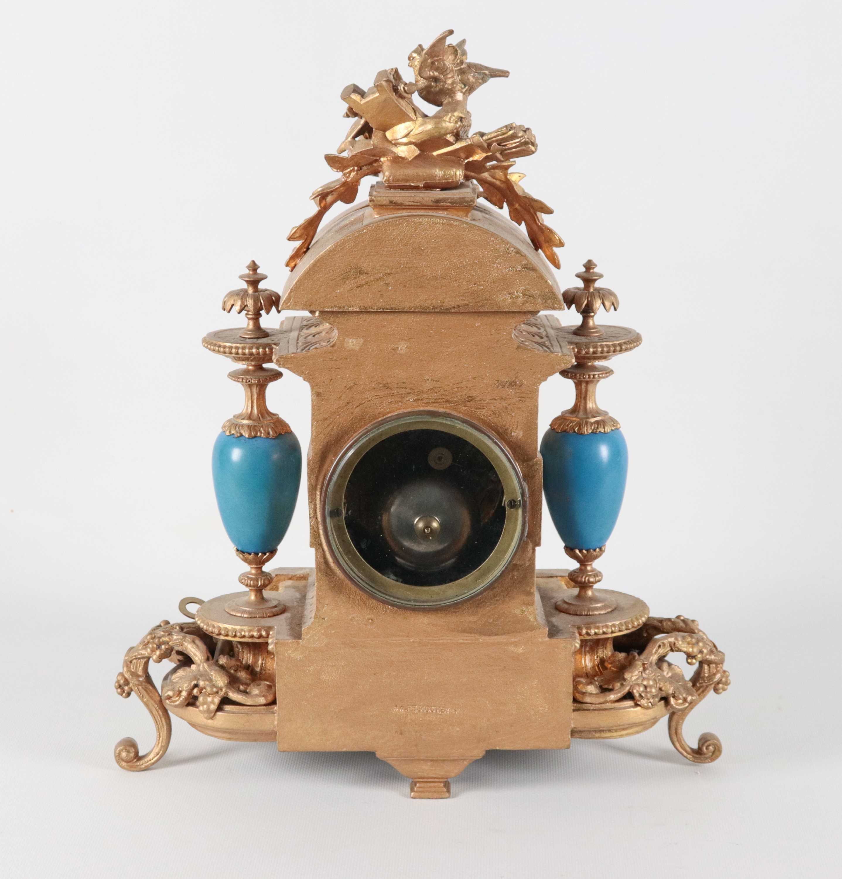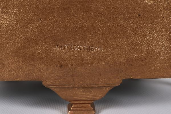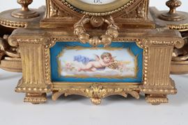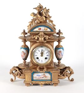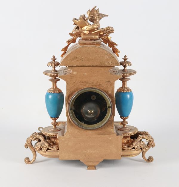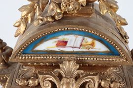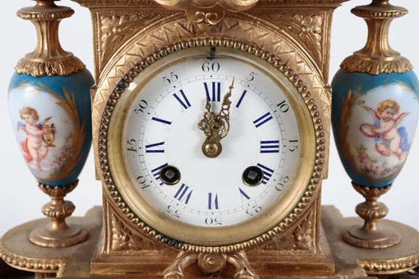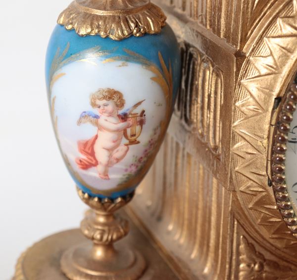 Antica pendola da tavolo francese in bronzo dorato e sbalzato a motivi Luigi XVI, con placche e vasetti in porcellana Sèvres dipinta a motivi [..]