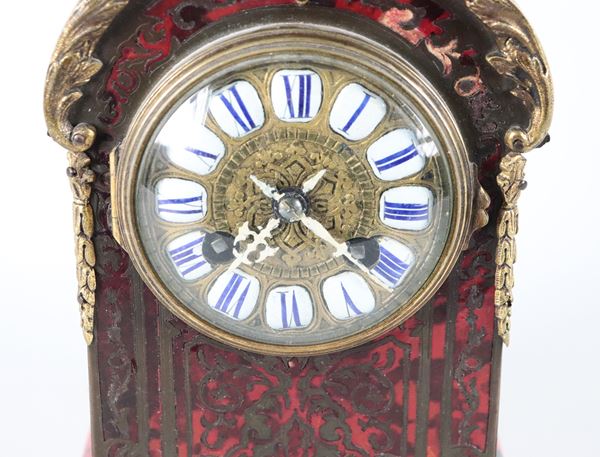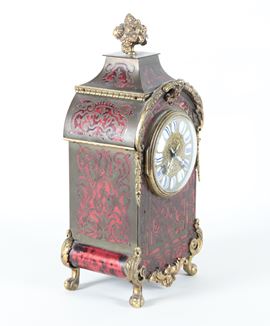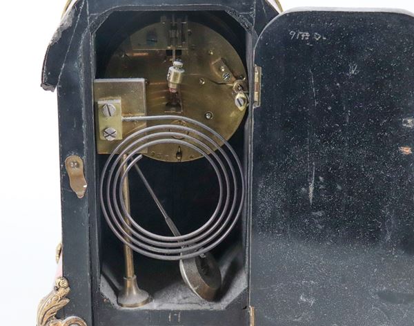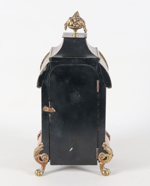 Antica piccola pendola da tavolo francese di linea Luigi XV, con intarsi in metallo dorato alla maniera Boulle