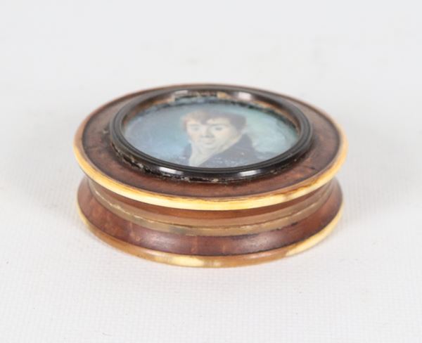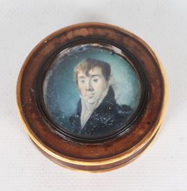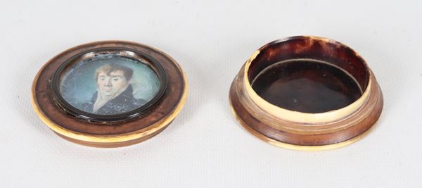 Antica tabacchiera tonda, sul coperchio miniatura dipinta raff.te "Nobiluomo"