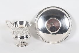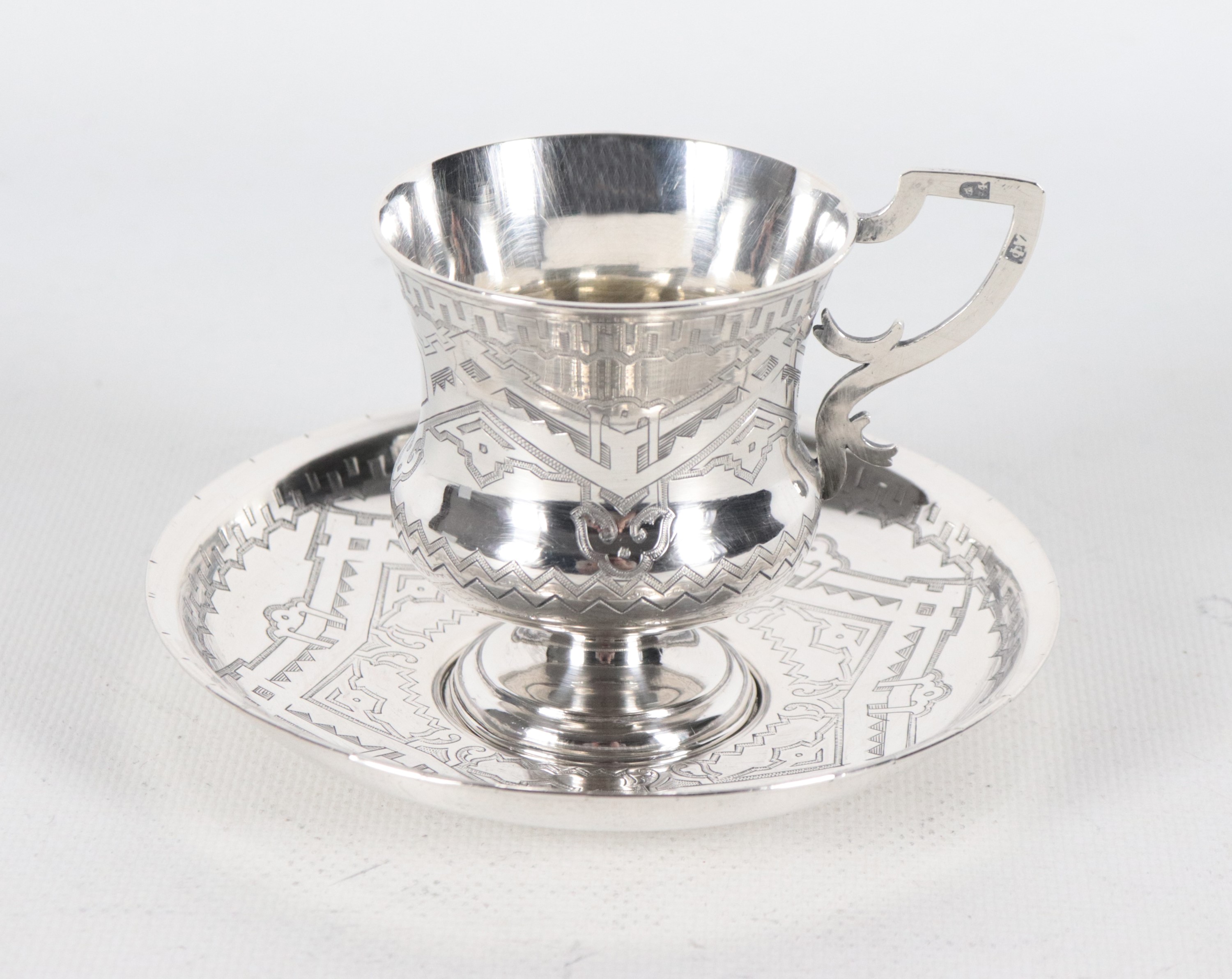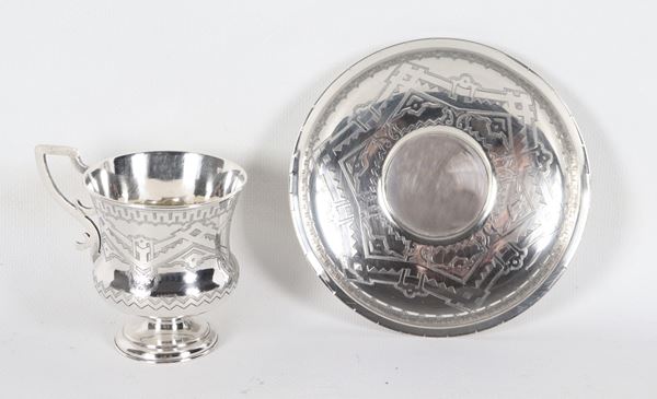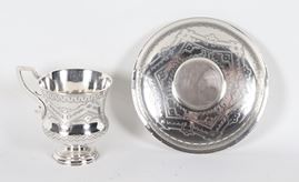 Antica tazzina con piattino, in argento cesellato e sbalzato a motivi di intrecci geometrici, gr. 145