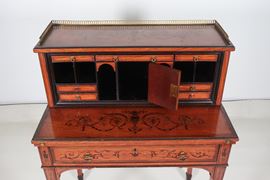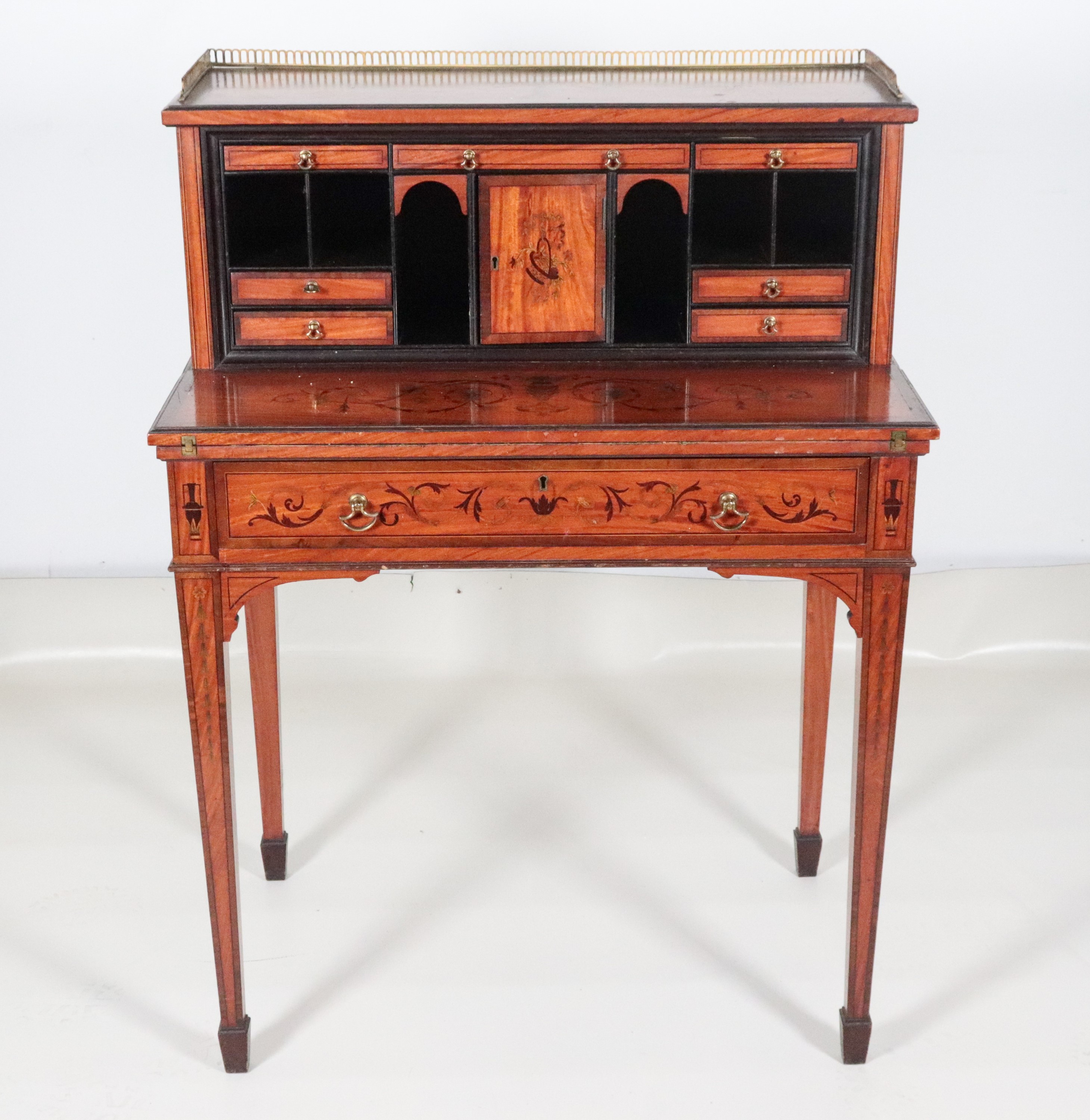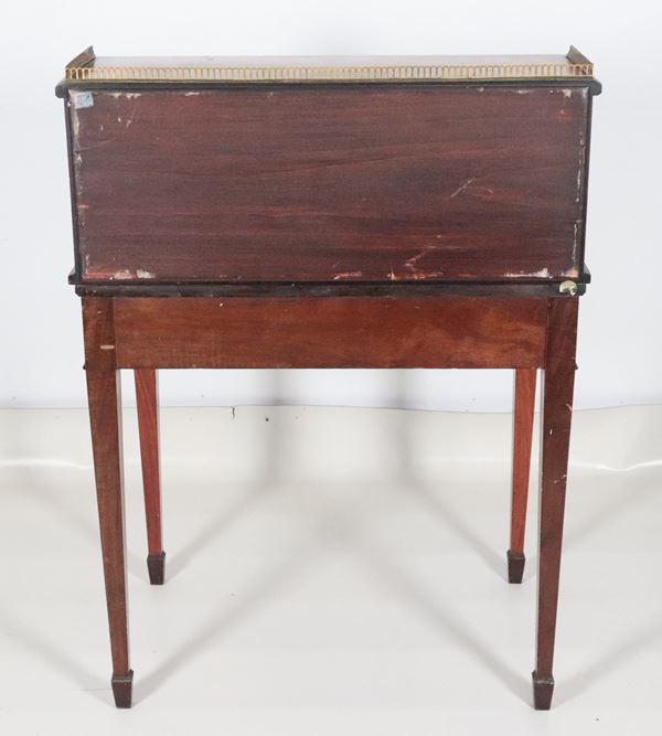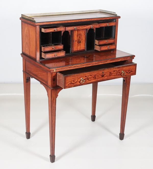 Antico bonheur du jour Sheraton in legno di satinwood, con decorazioni dipinte a motivi di ghirlande, intrecci floreali e anfore