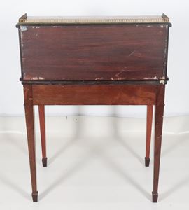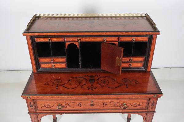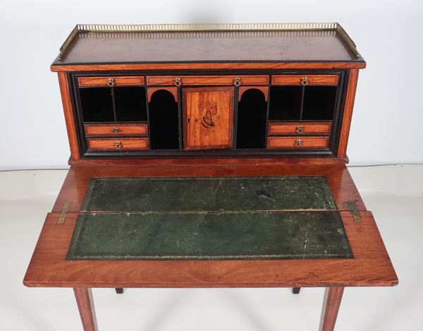 la parte superiore con alzata a tiretti, sportellino centrale e scomparti, la parte inferiore con piano ribaltabile formante scrittoio, tiretto sottostante e gambe a piramide rovesciata, cm 76 x 47 x 106 h.