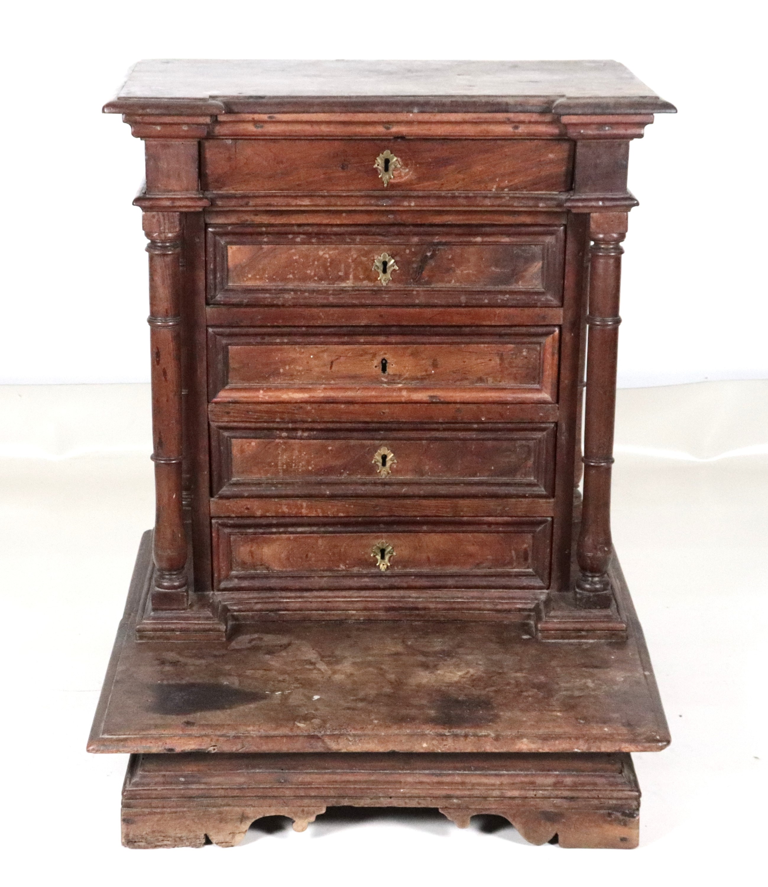 cinque tiretti e gambe a ciabatta. Da restaurare, cm 71 x 67 x 86 h.