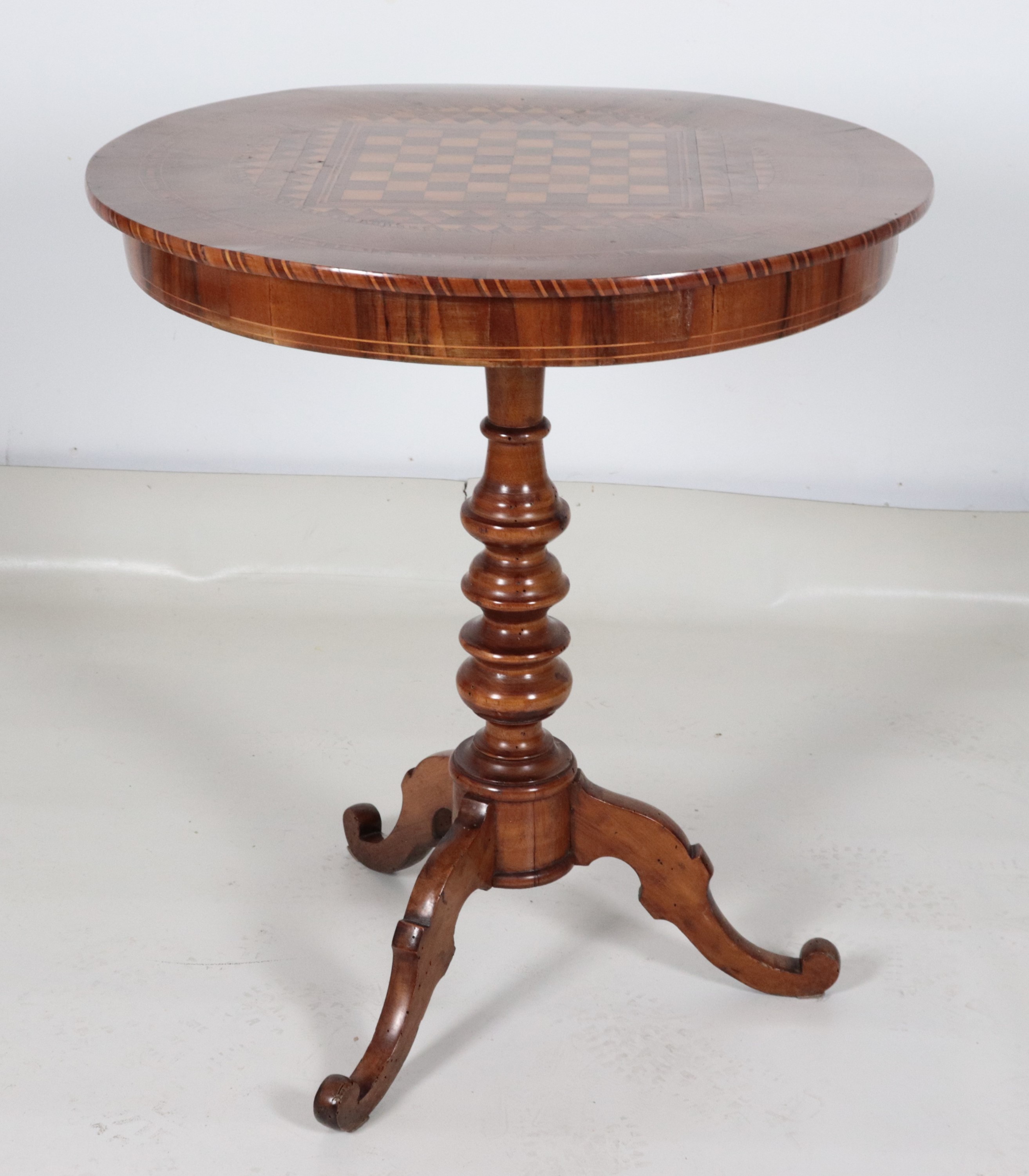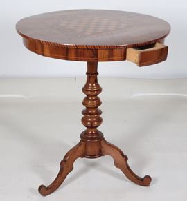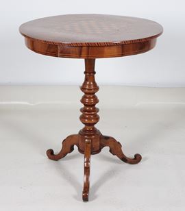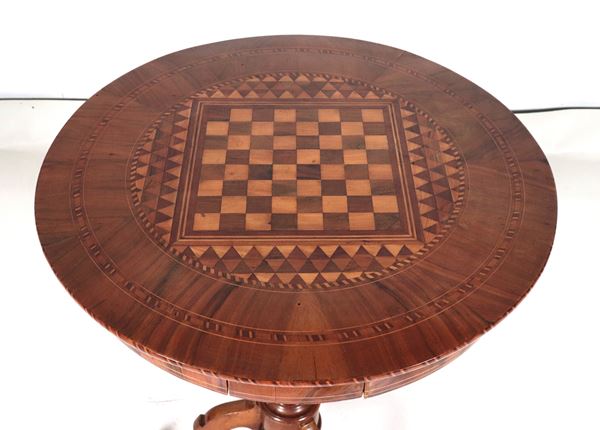Antico tavolinetto Rolo da centro in noce, con piano intarsiato a motivi geometrici e scacchiera al centro