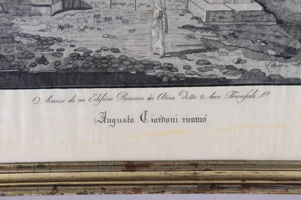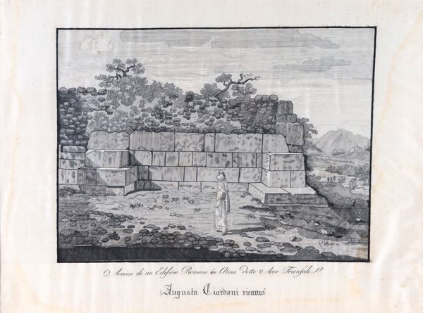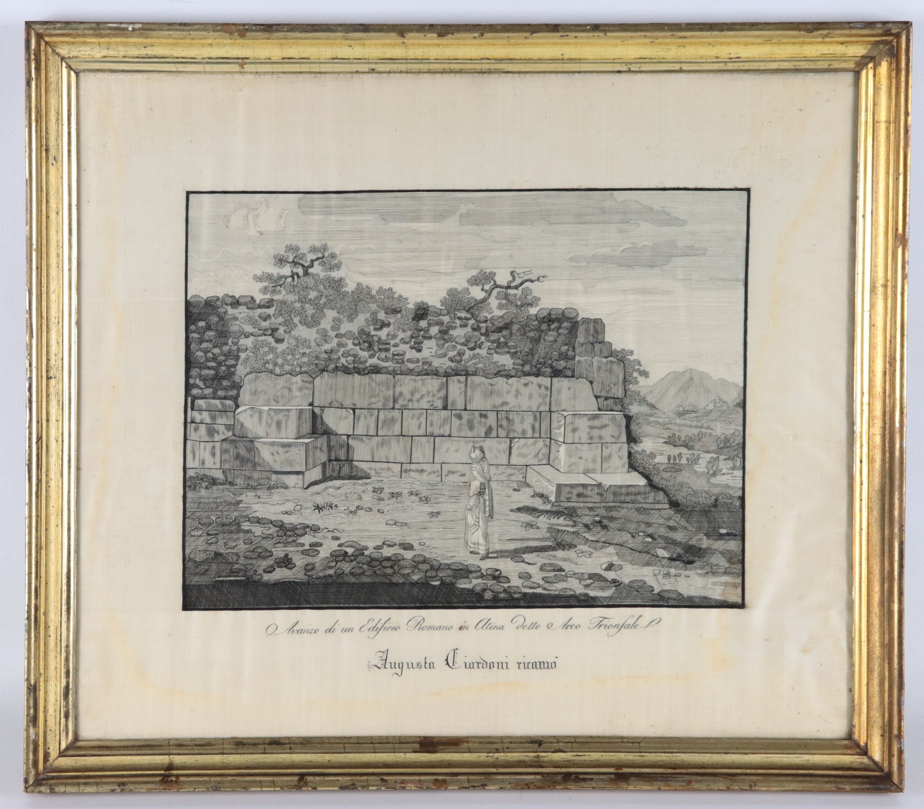 Antico tessuto ricamato raff.te "Rudere romano detto Arco Trionfale in Atina"