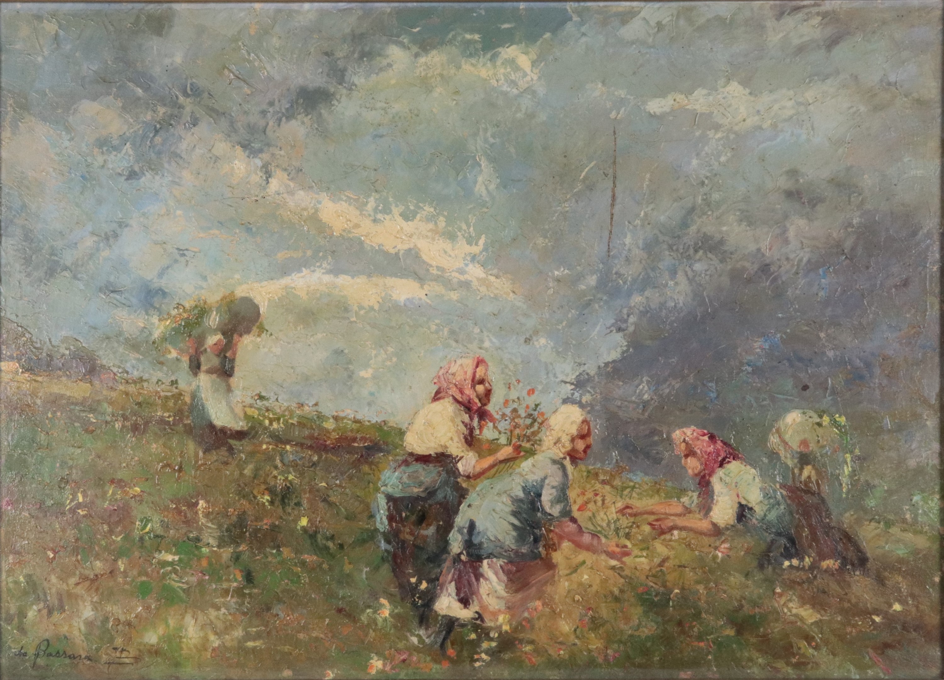 Firmato. "Contadine che raccolgono fiori in montagna"