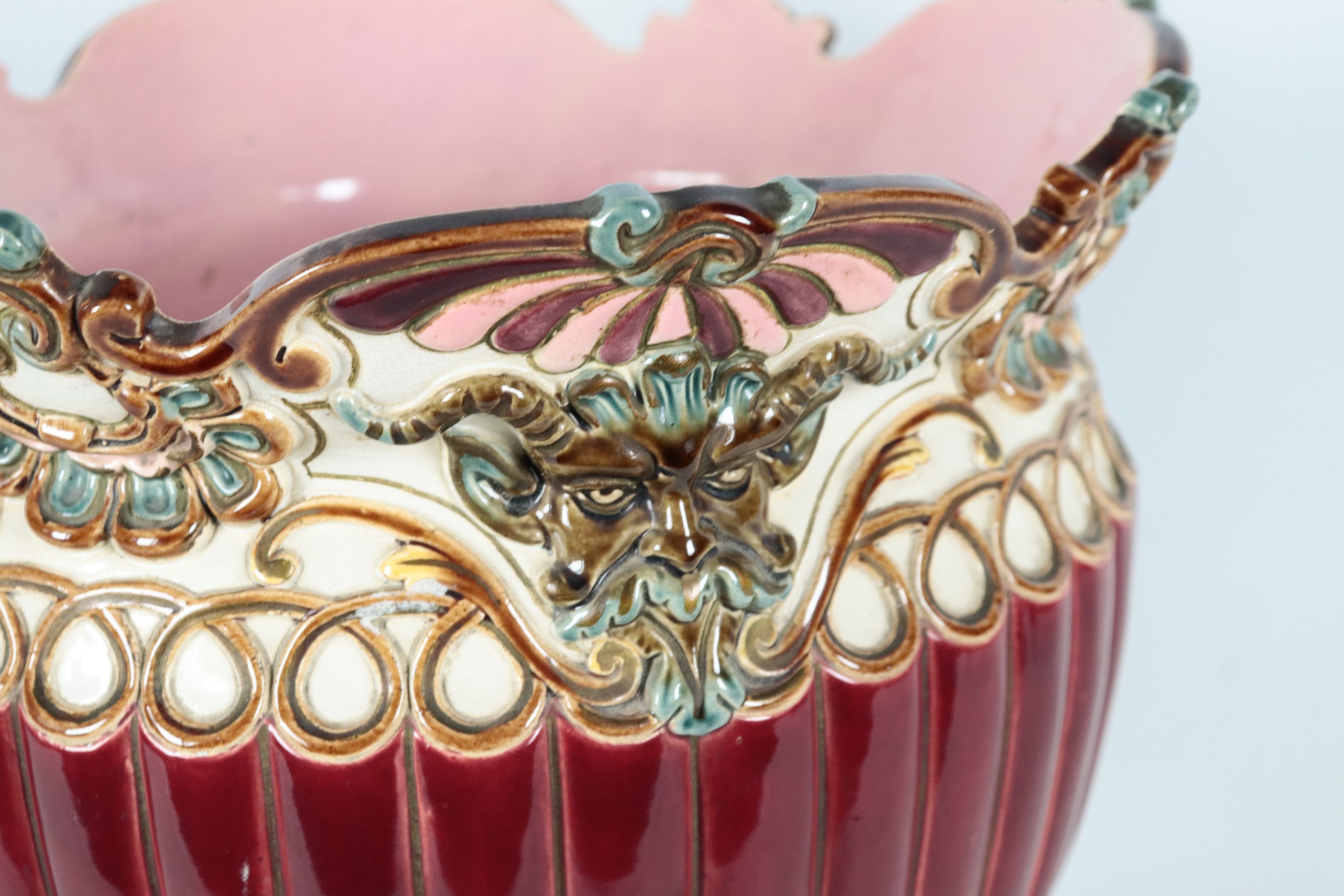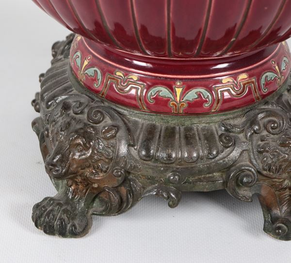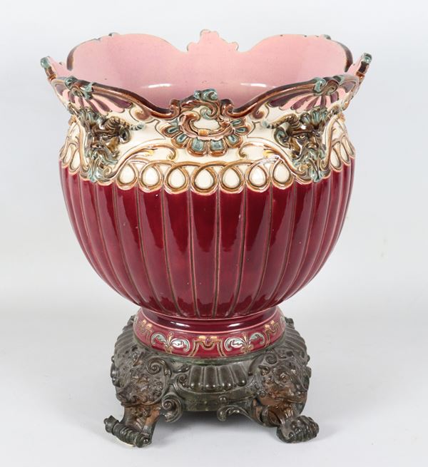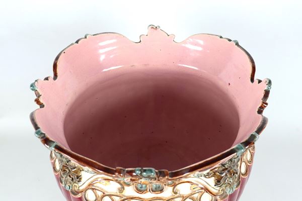 Cachepot Liberty in ceramica porcellanata e smaltata color sangue di bue, con decorazioni a rilievo di volute floreali, intrecci e mascheroni. [..]
