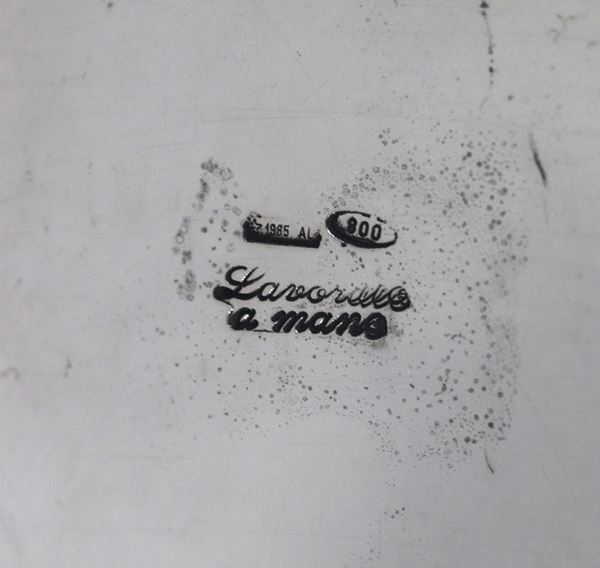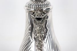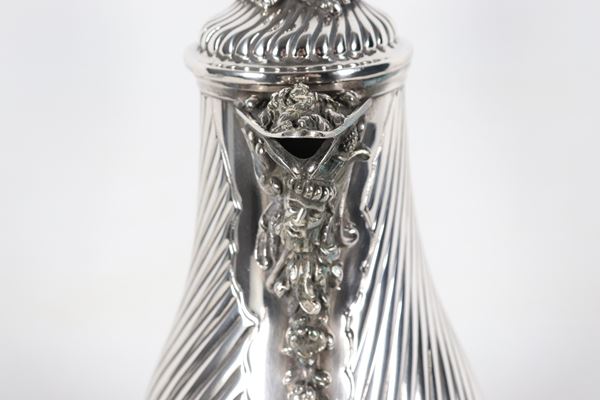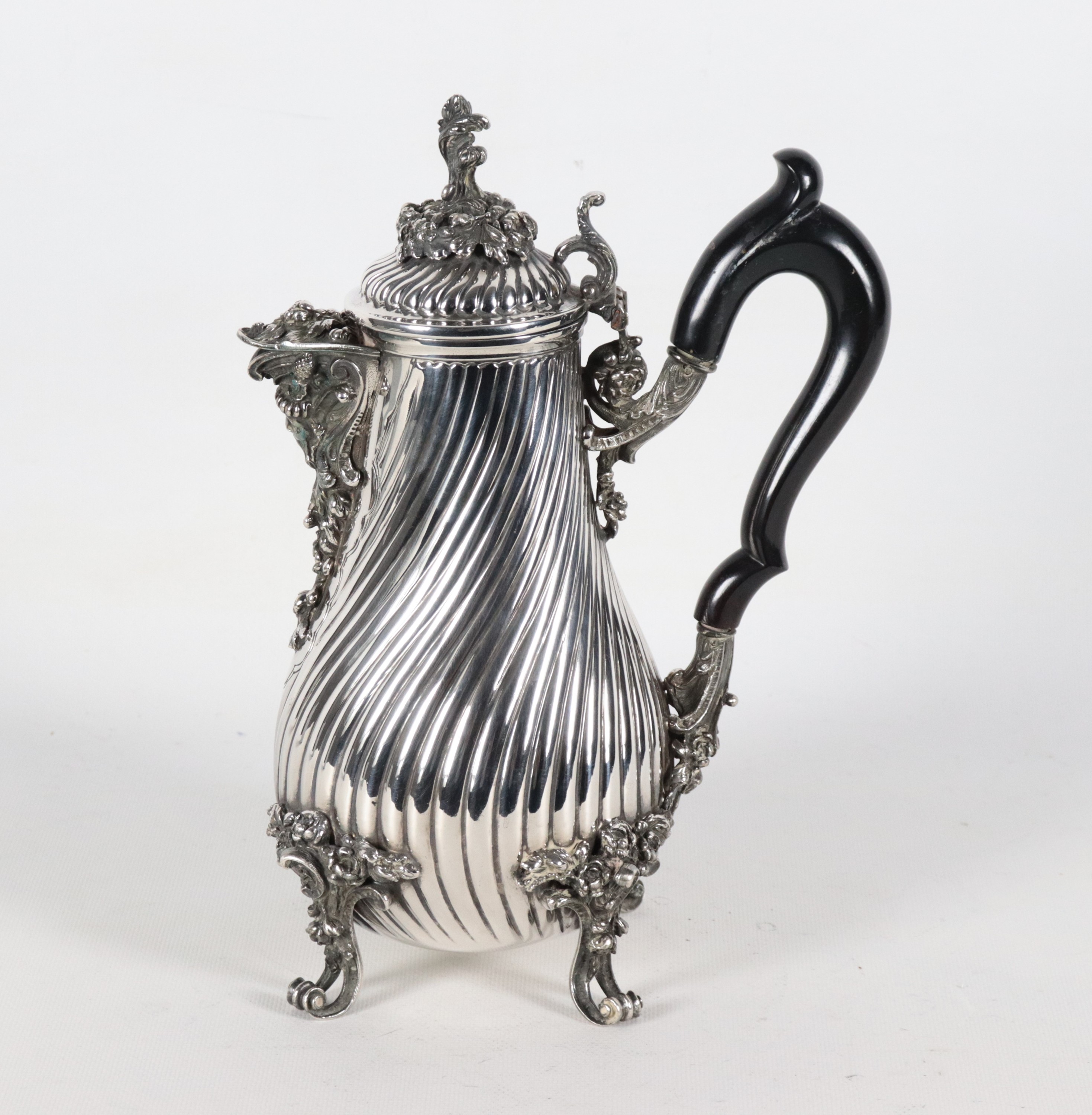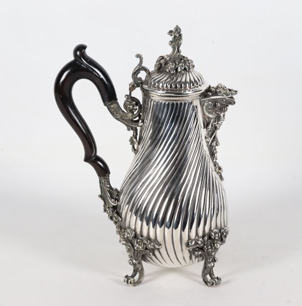 Caffettiera in argento cesellato e sbalzato a torchon, con becco a forma di mascherone e piedini ricurvi, manico in legno ebanizzato, gr. 123 [..]
