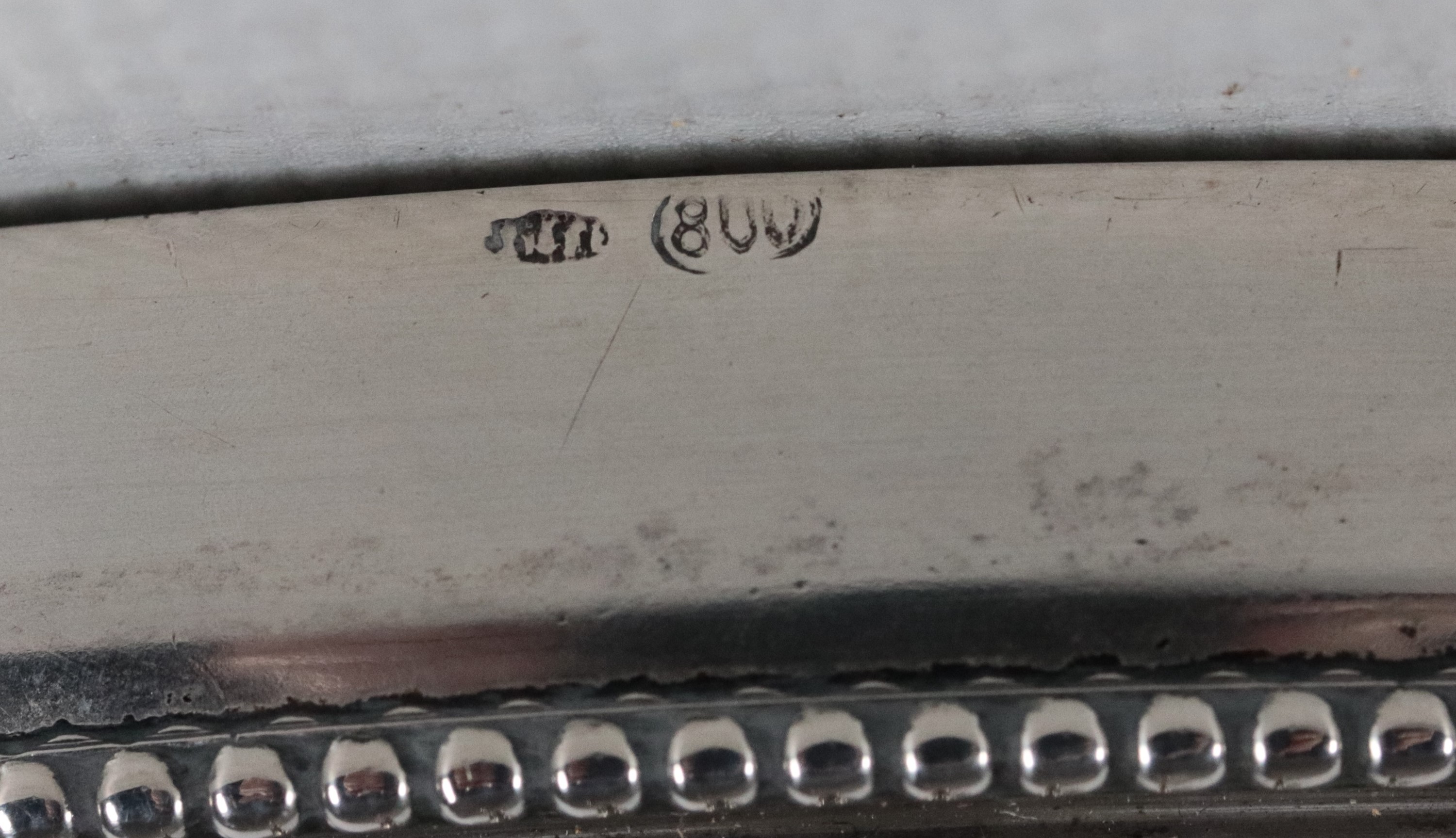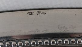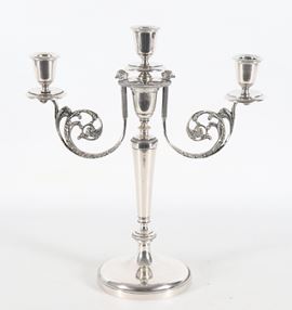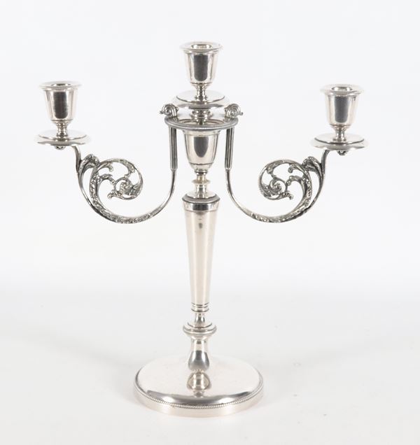 Candelabro in argento cesellato e sbalzato a motivi Luigi XVI, tre fiamme, gr. 820
