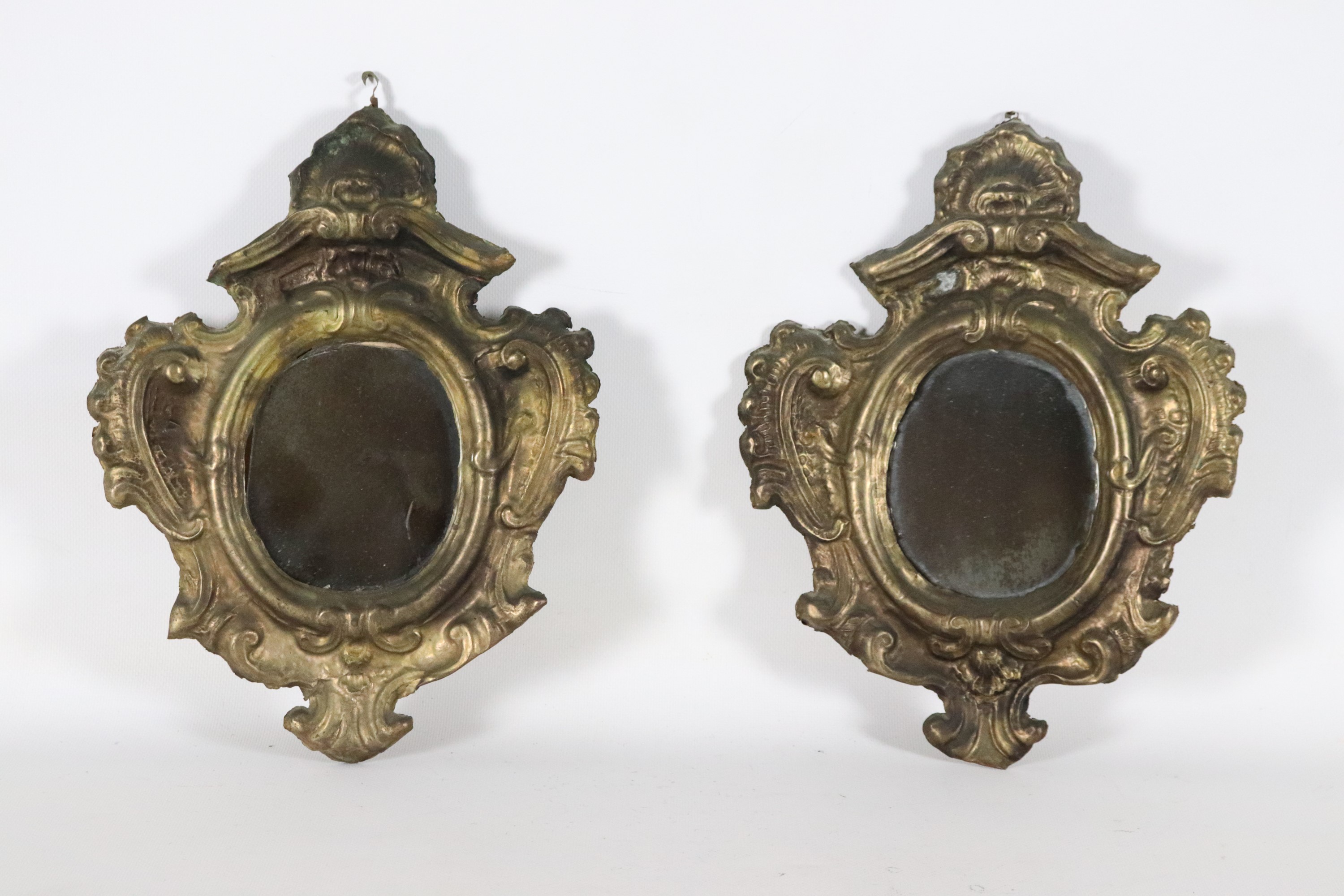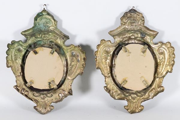 Coppia di antiche cartegloria romane in rame dorato e sbalzato a motivi Luigi XV, specchi al mercurio