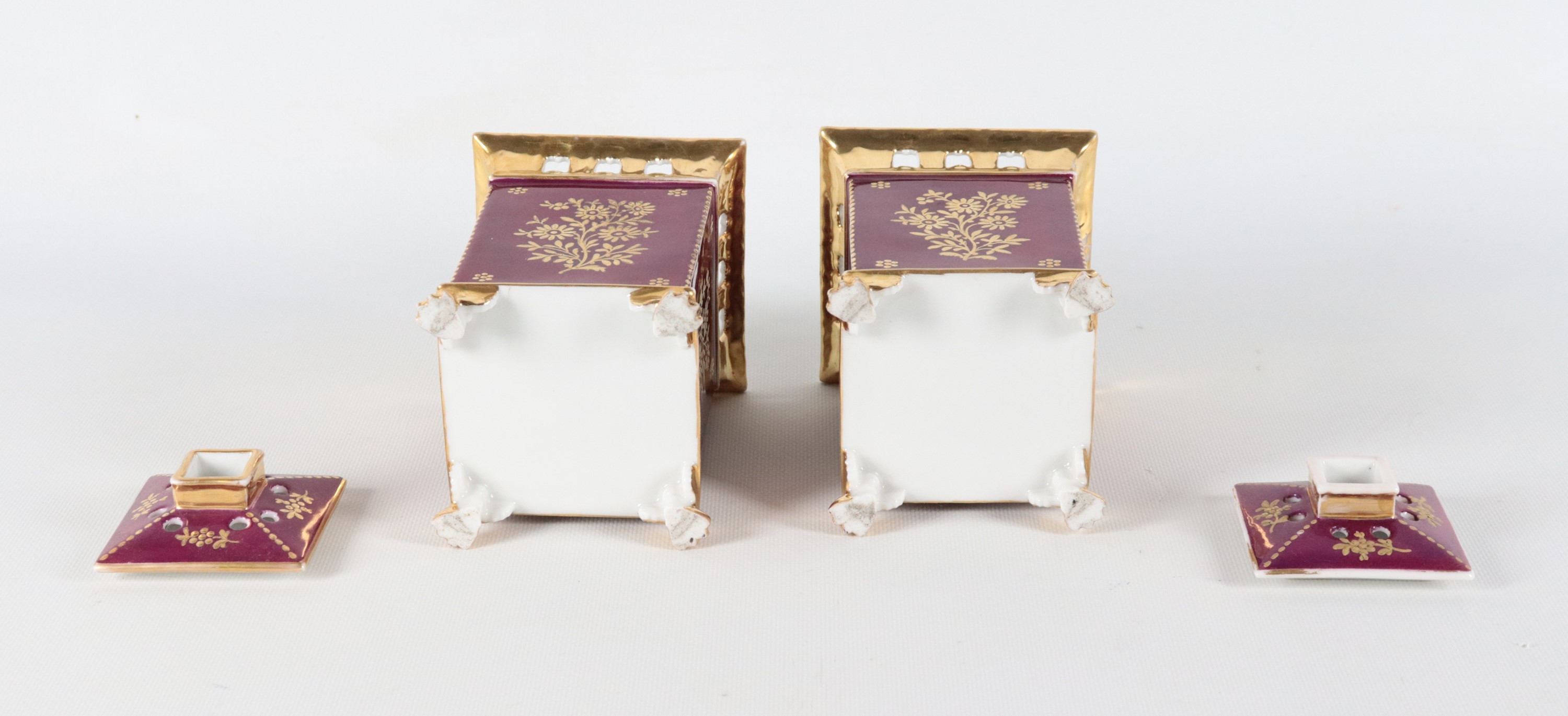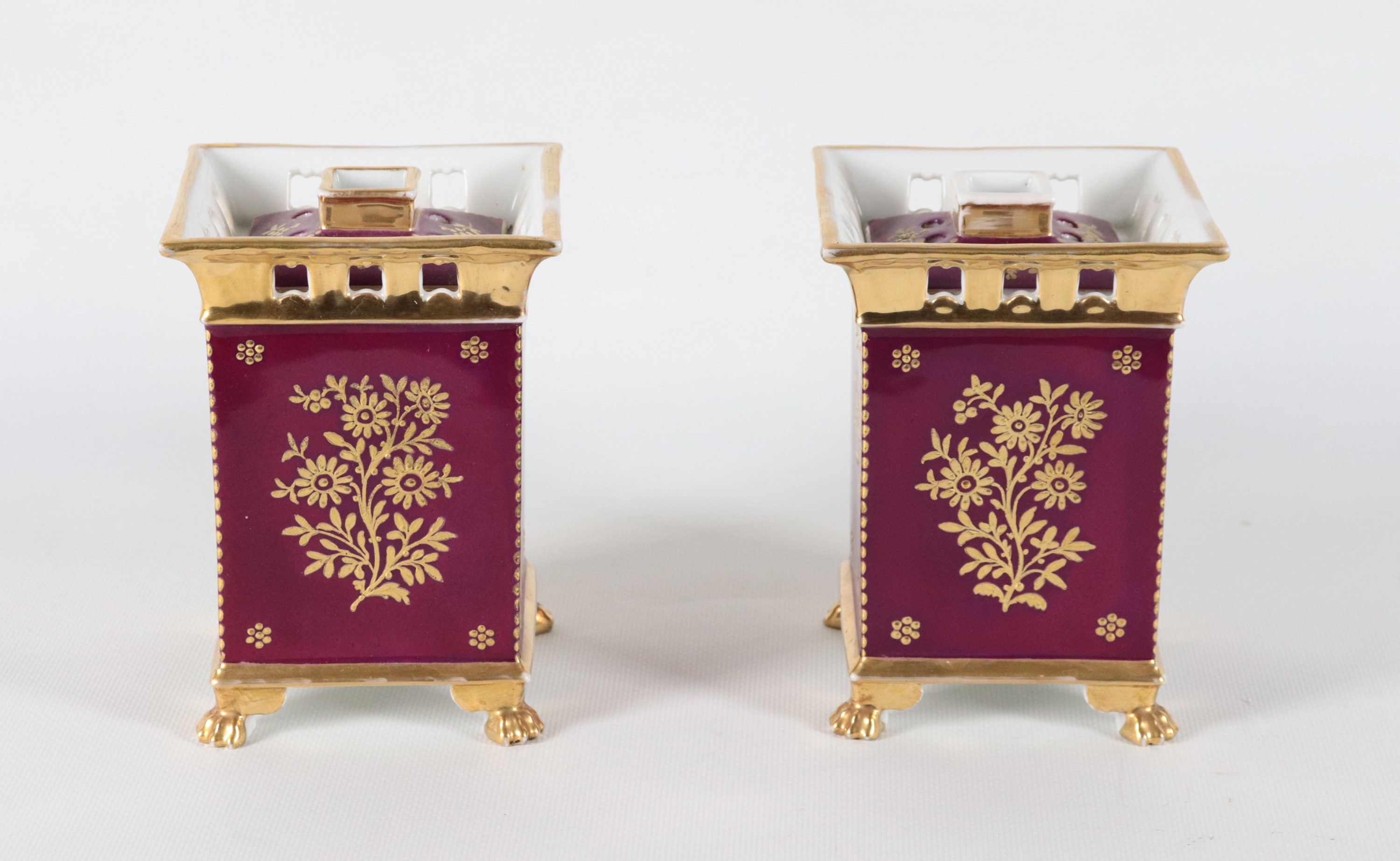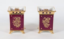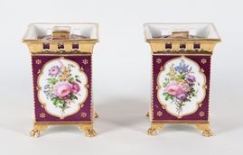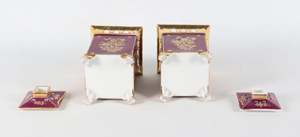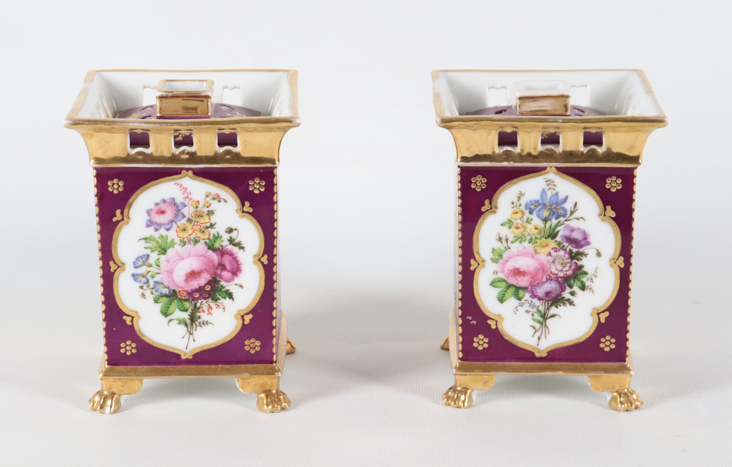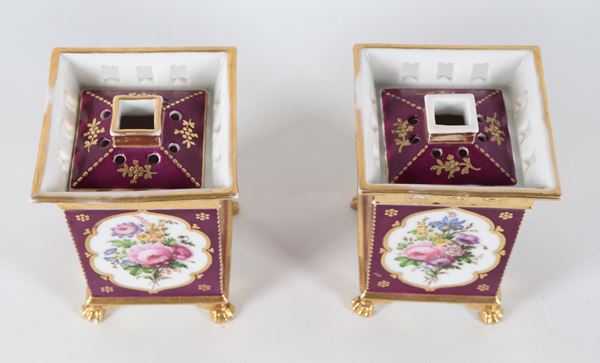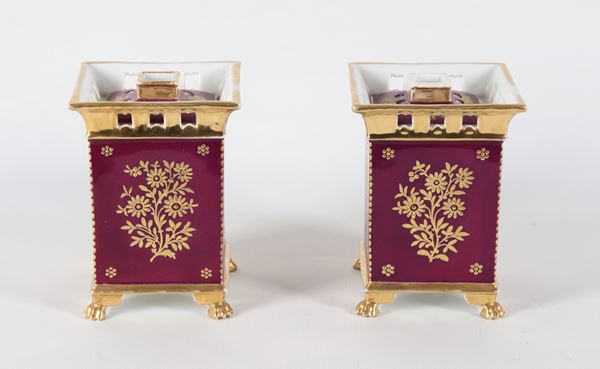 Coppia di antichi portafiori francesi in porcellana Vecchia Parigi, con medaglioni dipinti a motivi floreali su fondo rosso bordeaux e oro ze [..]
