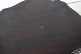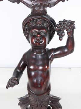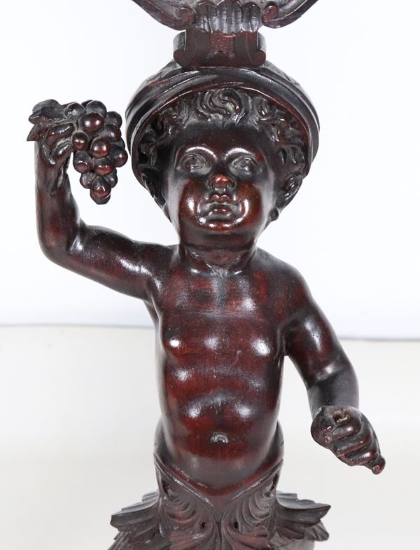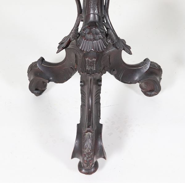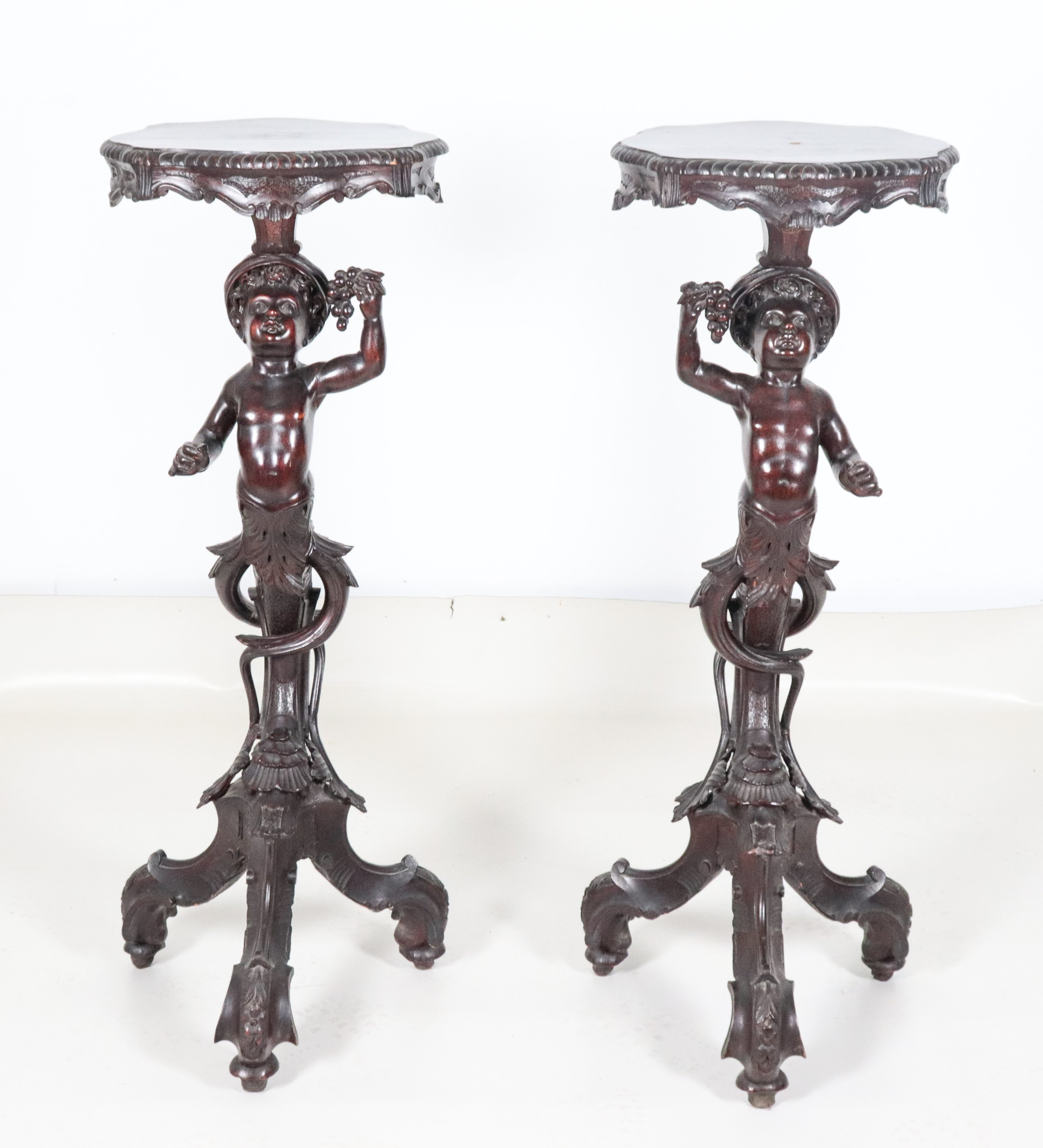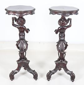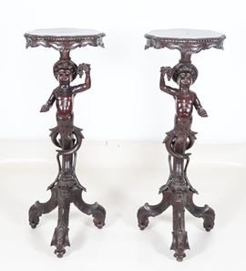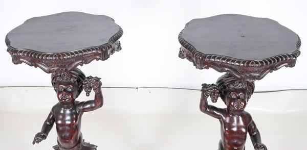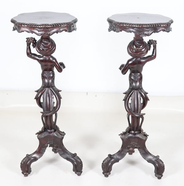 Coppia di antichi trespoli veneziani in noce, con sculture di "Moretti" e tre gambe centinate