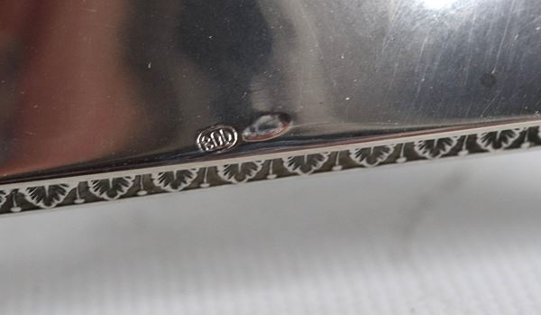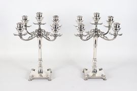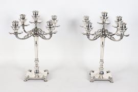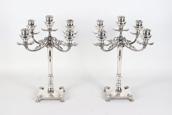 Coppia di candelabri in argento cesellato e sbalzato a motivi Impero, cinque fiamme ciascuno, gr. 1820