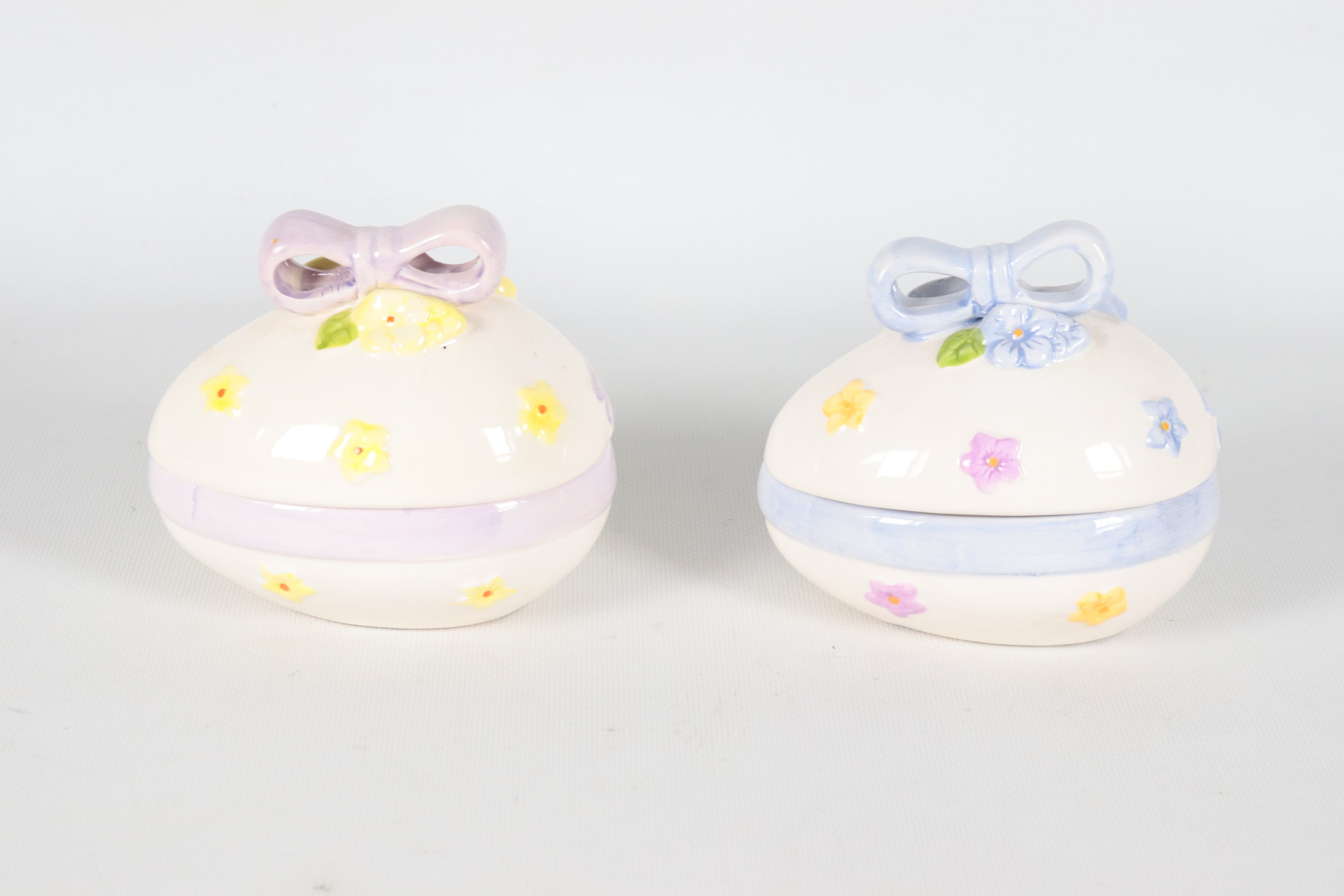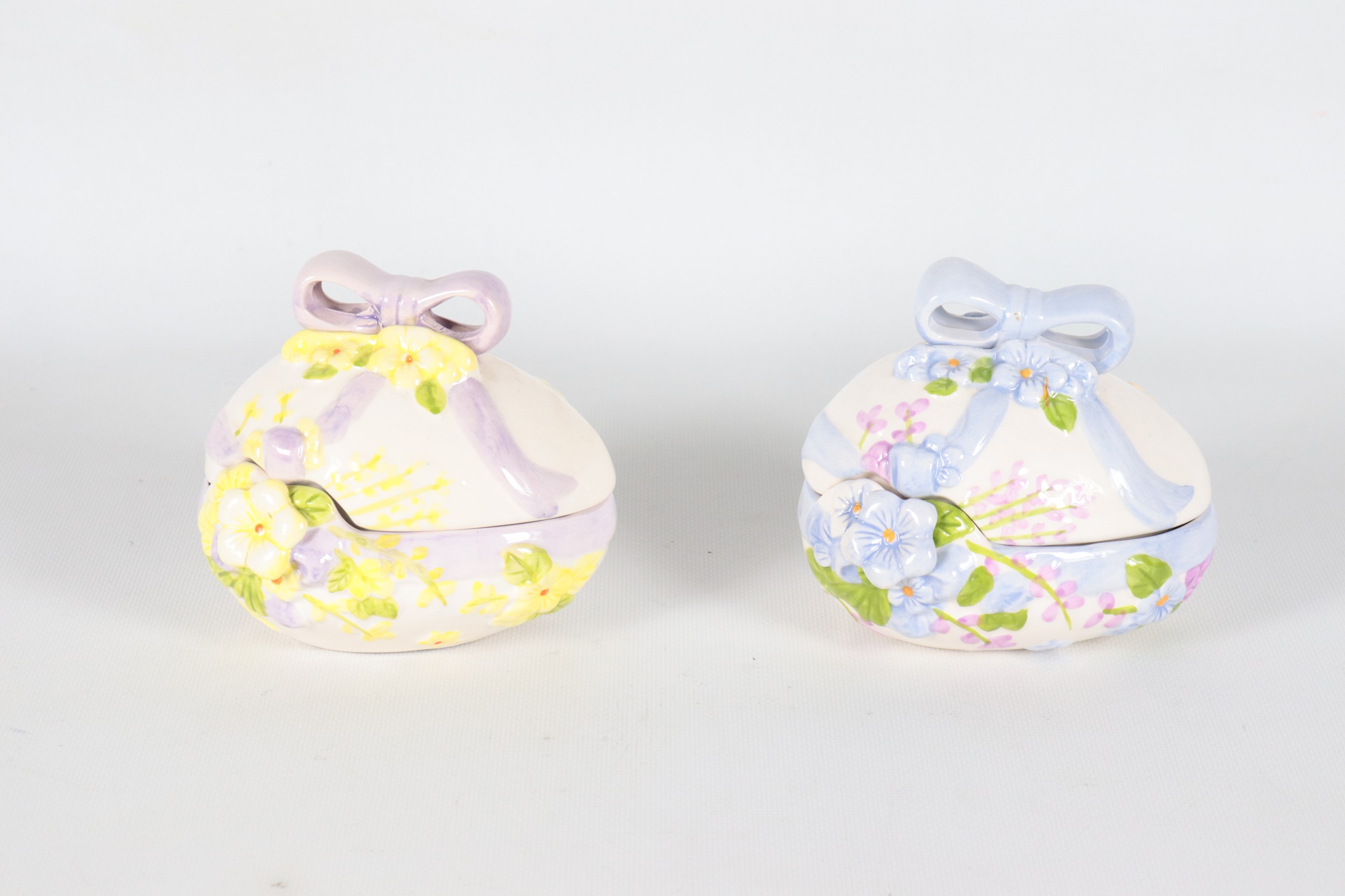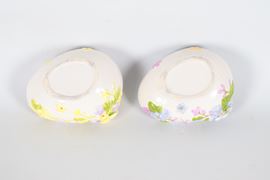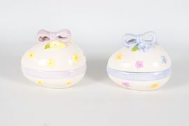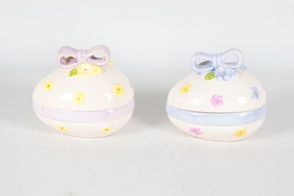 Coppia di piccole scatole in ceramica policroma a forma di uovo