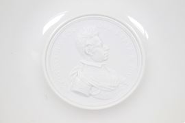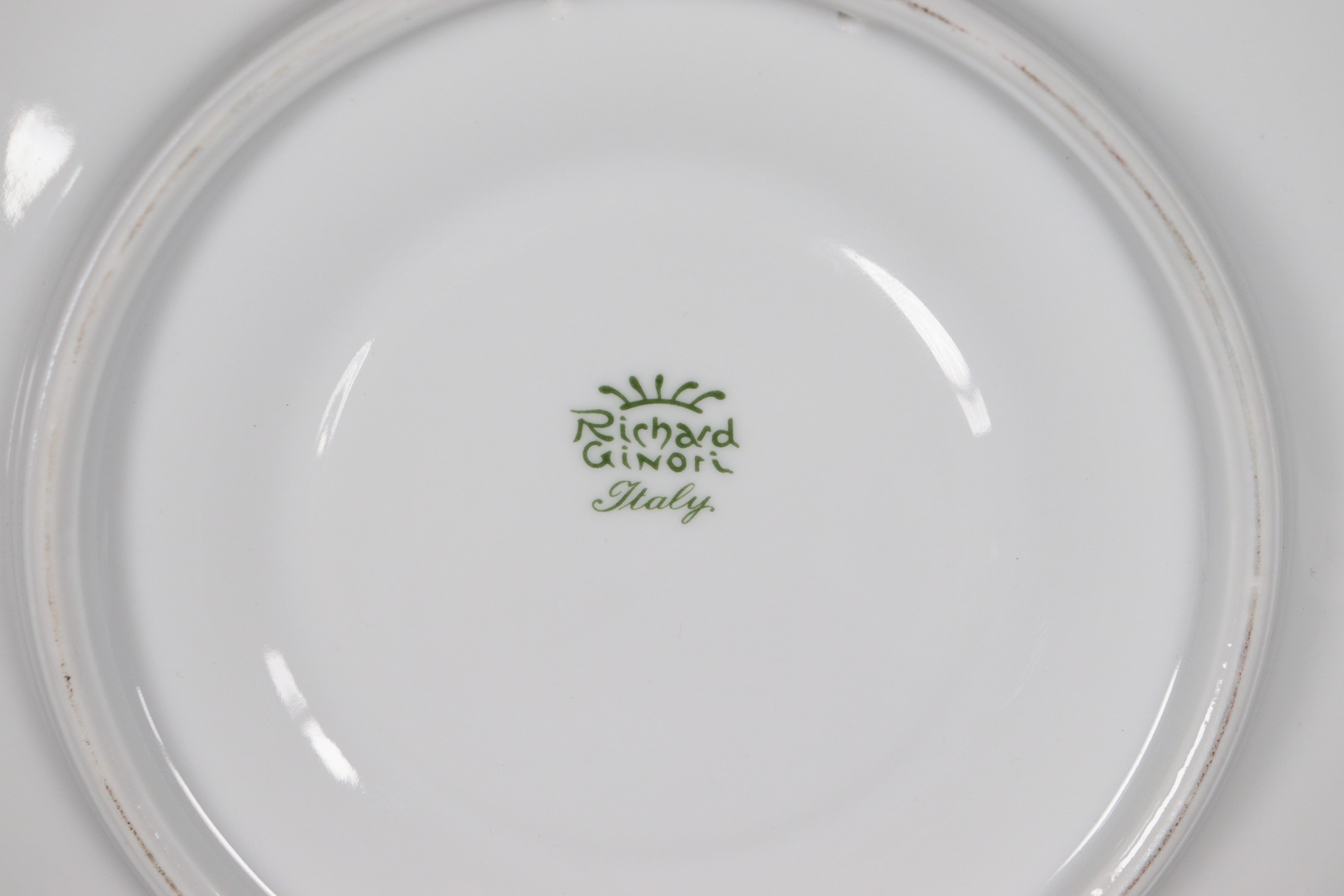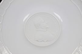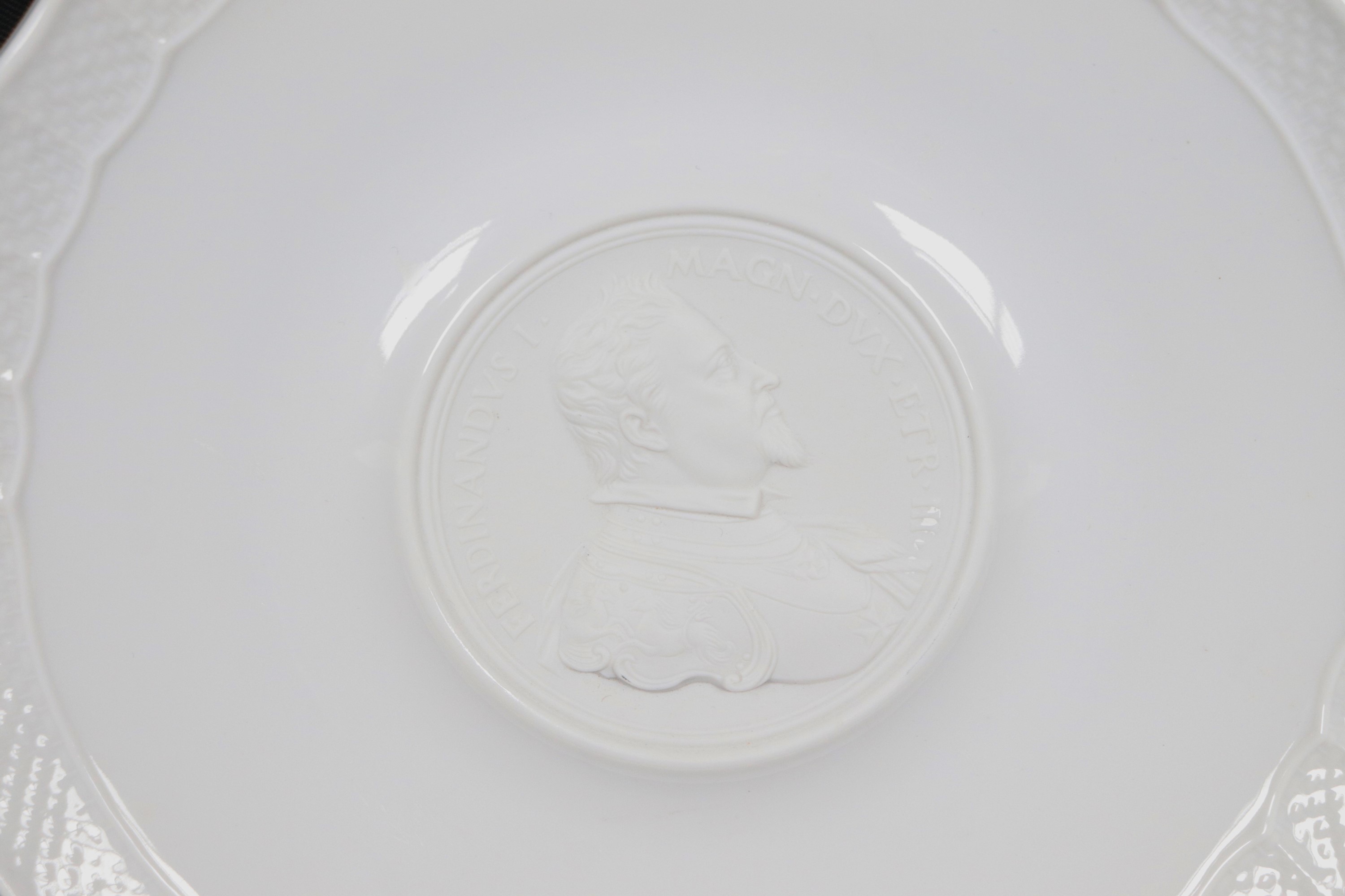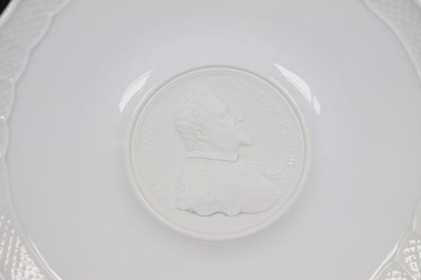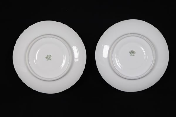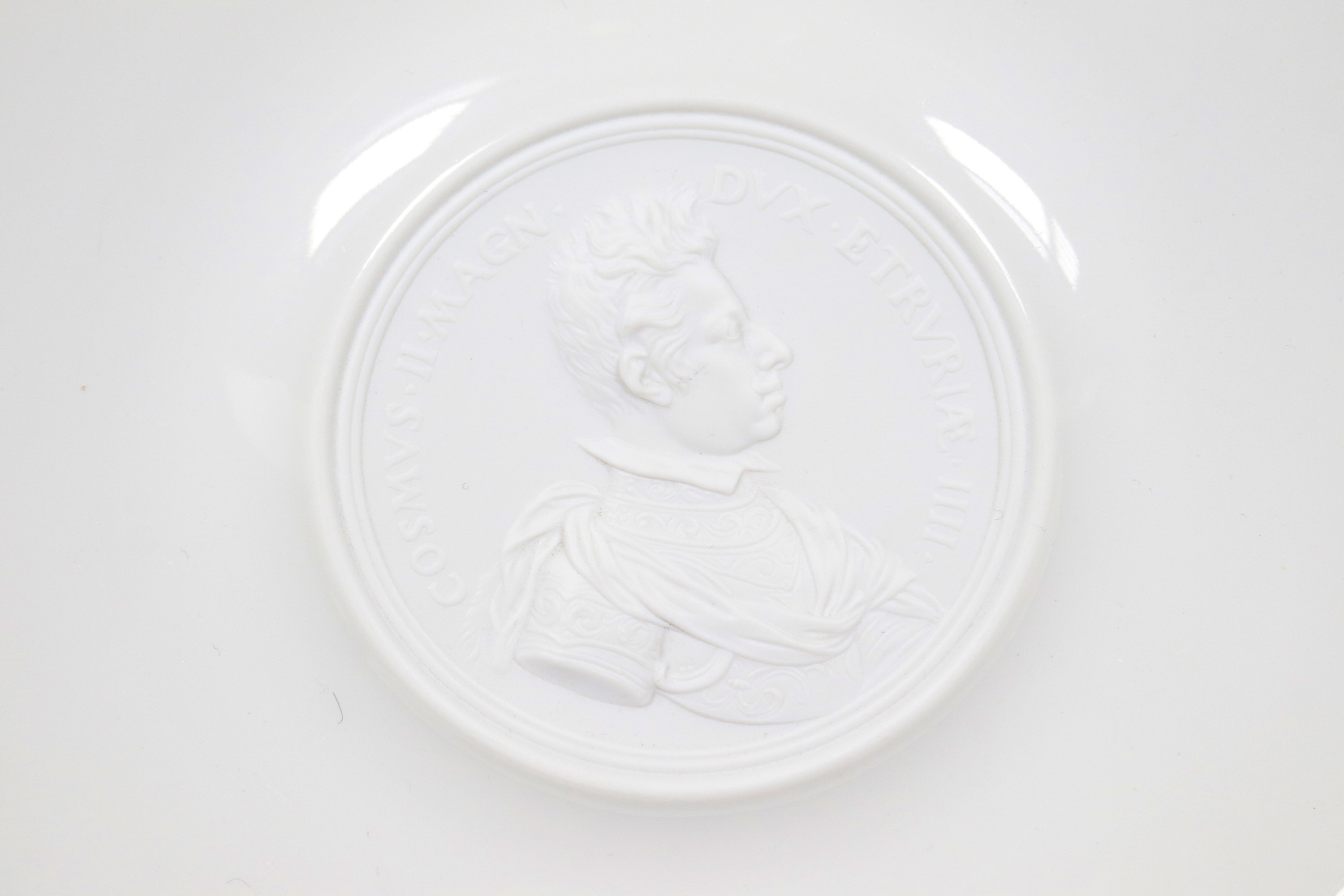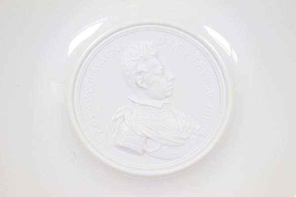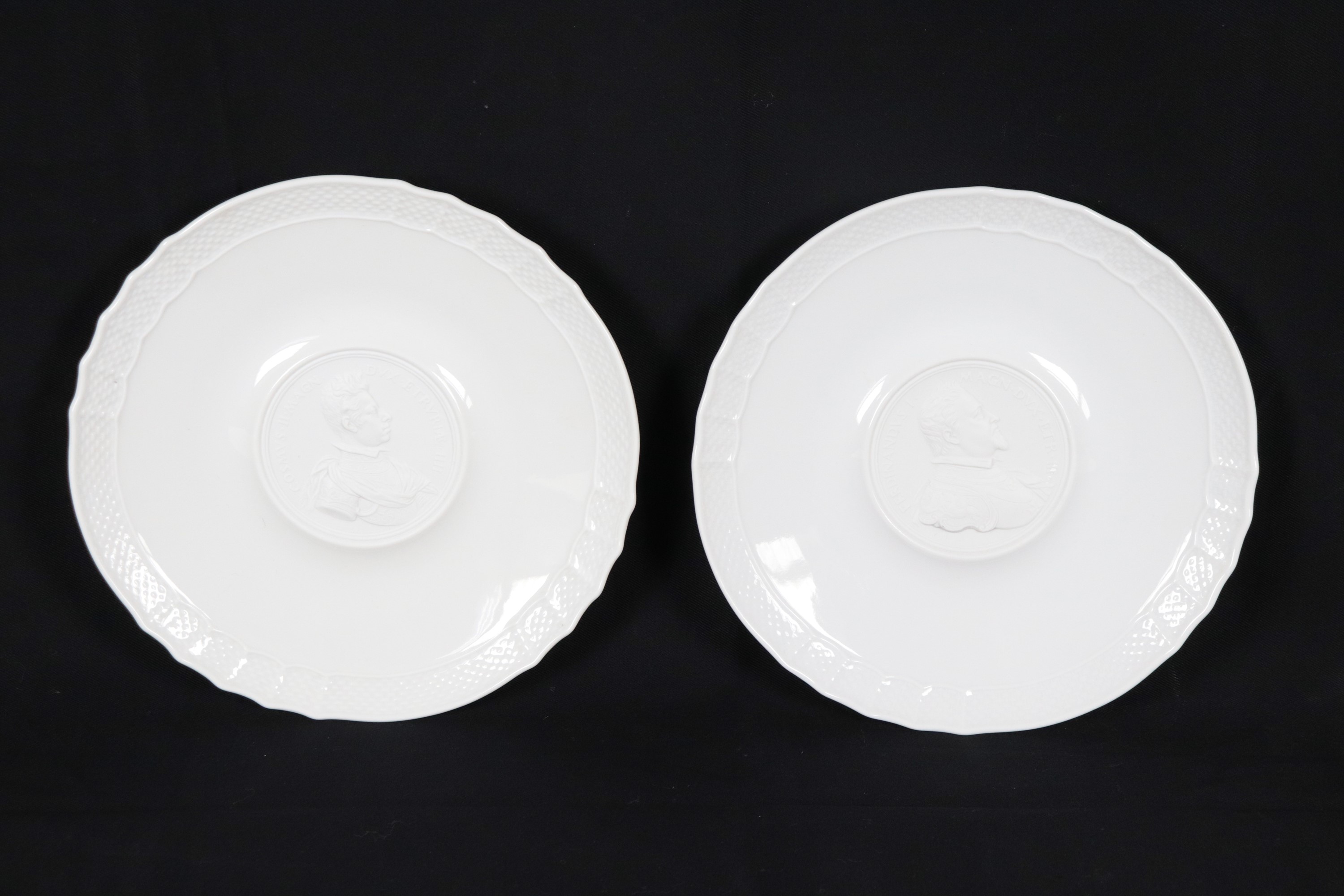 Coppia di piccoli piatti da muro in porcellana bianca Richard Ginori, al centro medaglioni a rilievo con profili di personaggi