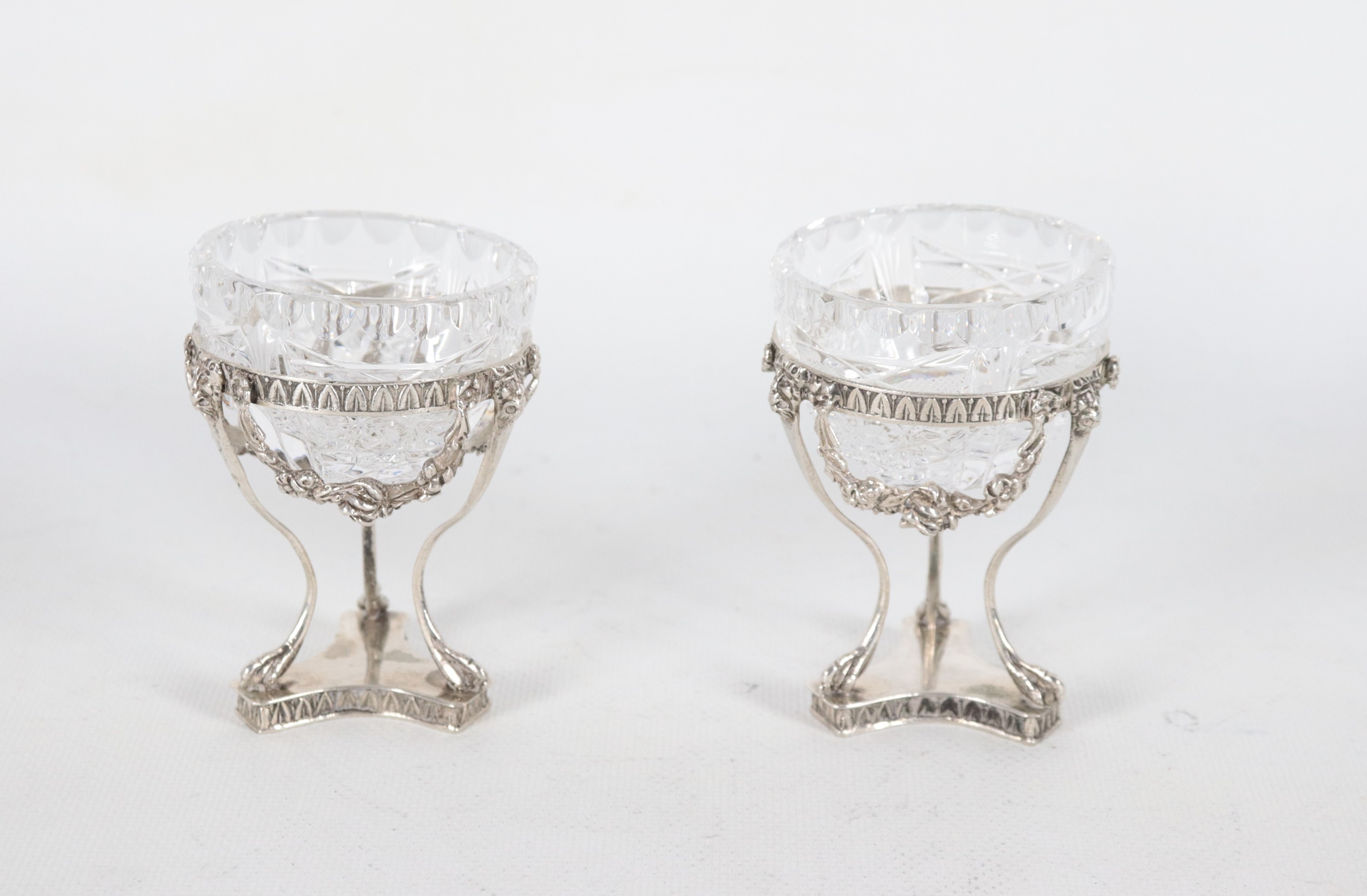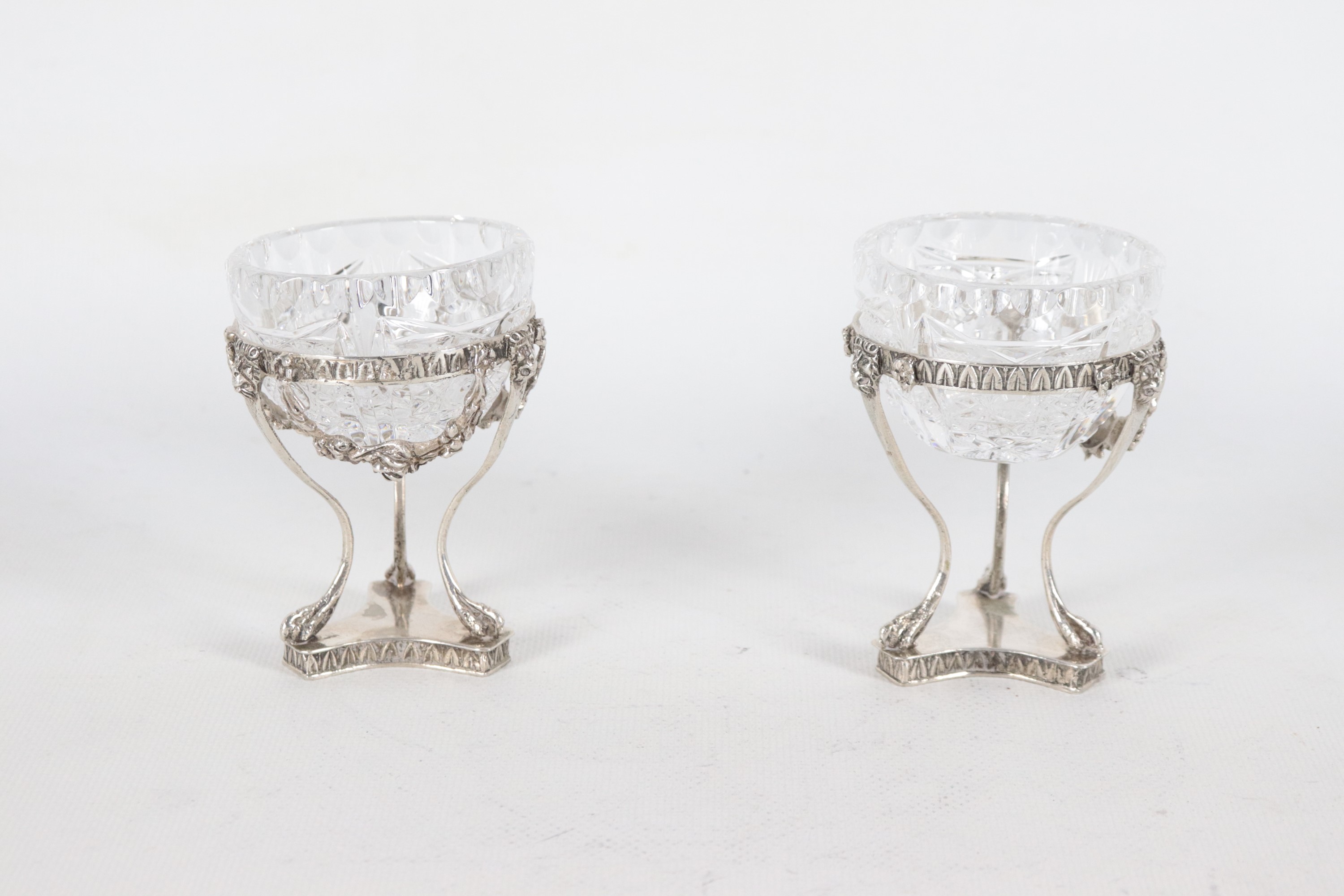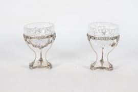 Coppia di salierine in argento con vaschette in cristallo, cesellate e sbalzate a motivi Impero, peso netto dell'argento gr. 120