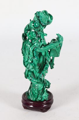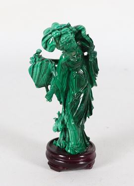 "Cortigiana con ventaglio", statuina cinese in malachite con basetta in teak