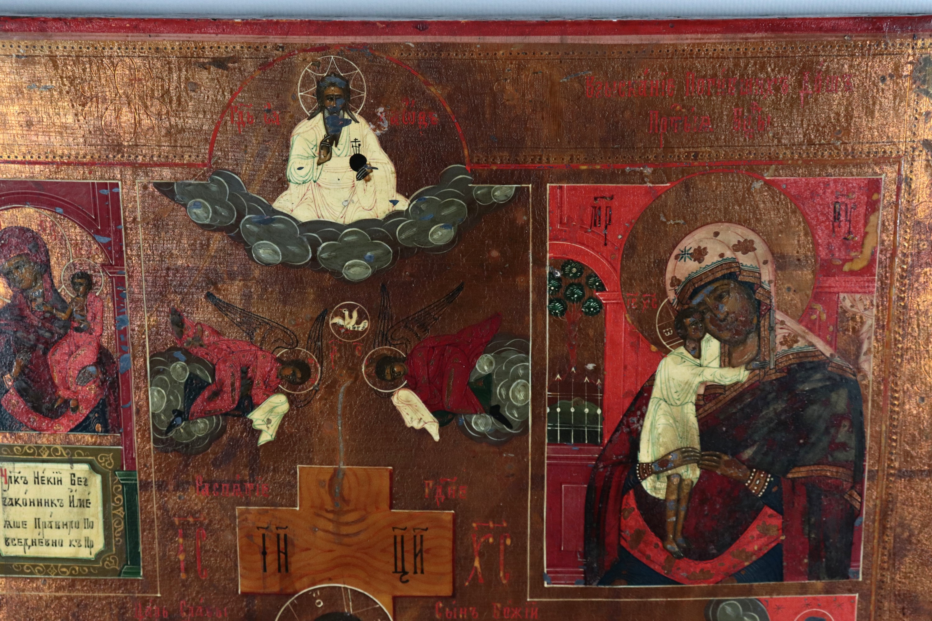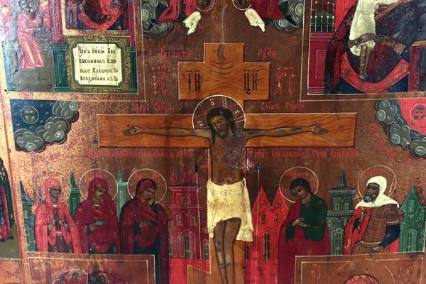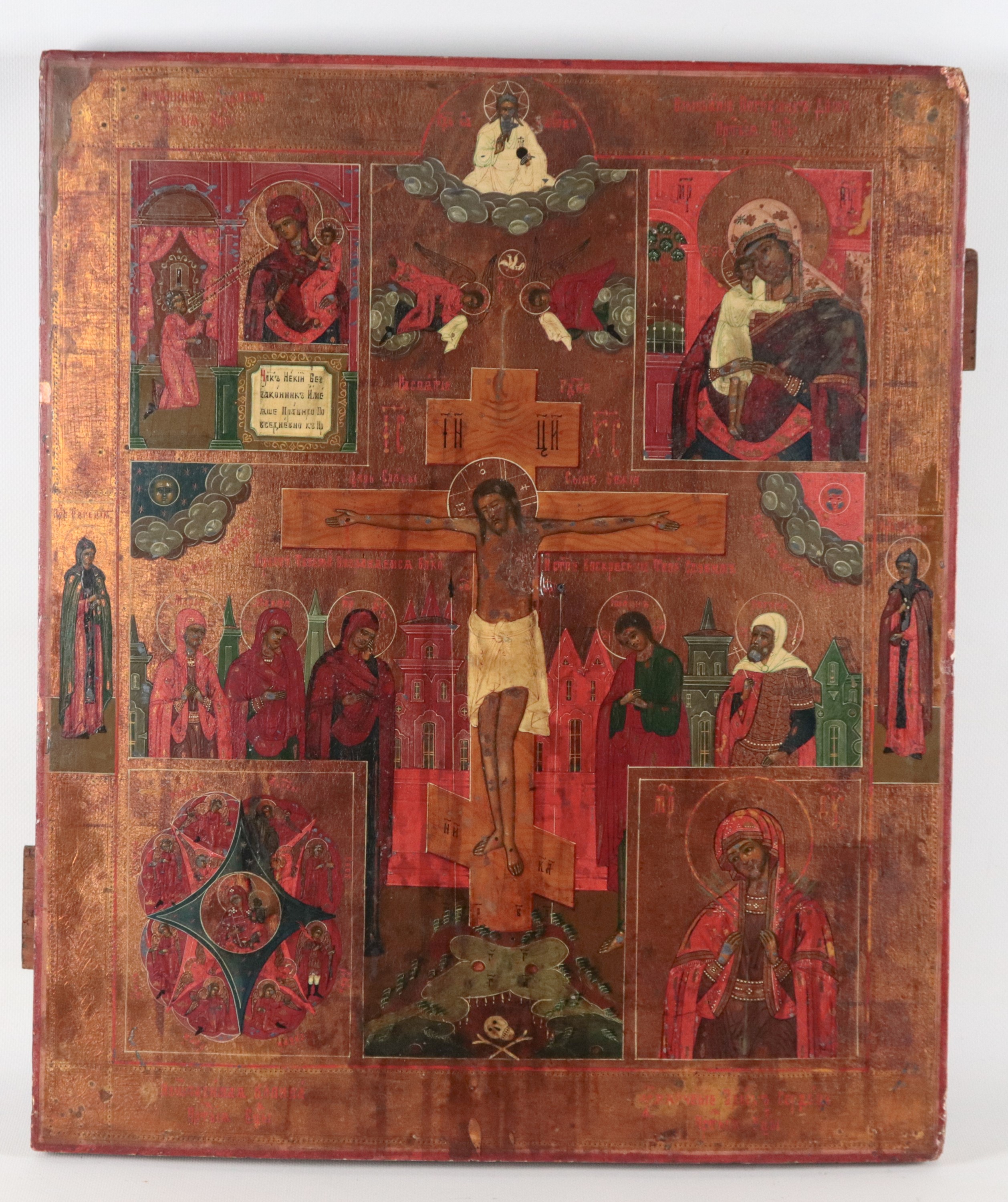 "Crocifissione, con ai quattro angoli Madre di Dio della grazia inaspettata, Madre di Dio riscatto delle anime perdute, Madre di Dio del Roveto [..]