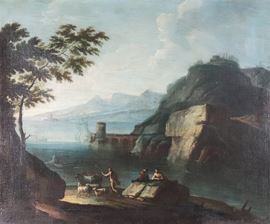 Bottega di. "Marina con veduta costiera, ruderi, pescatori e pastore con armenti"