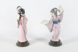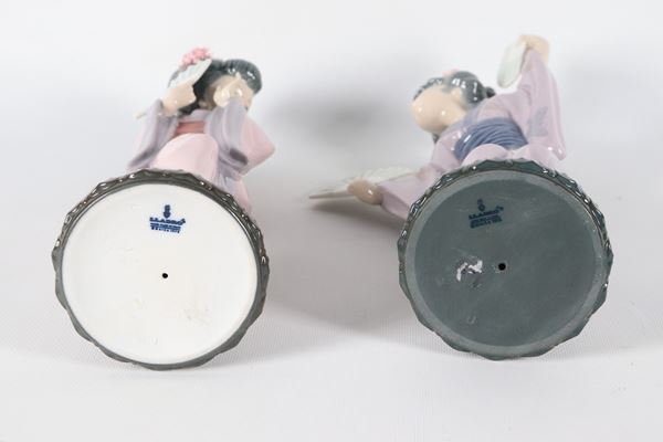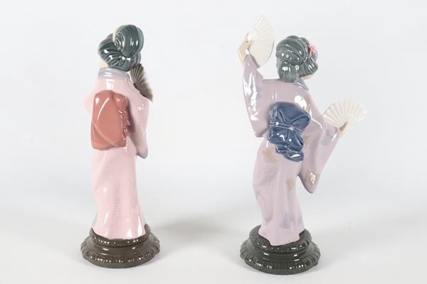 "Geishe", coppia di statuine in porcellana spagnola smaltata e policroma