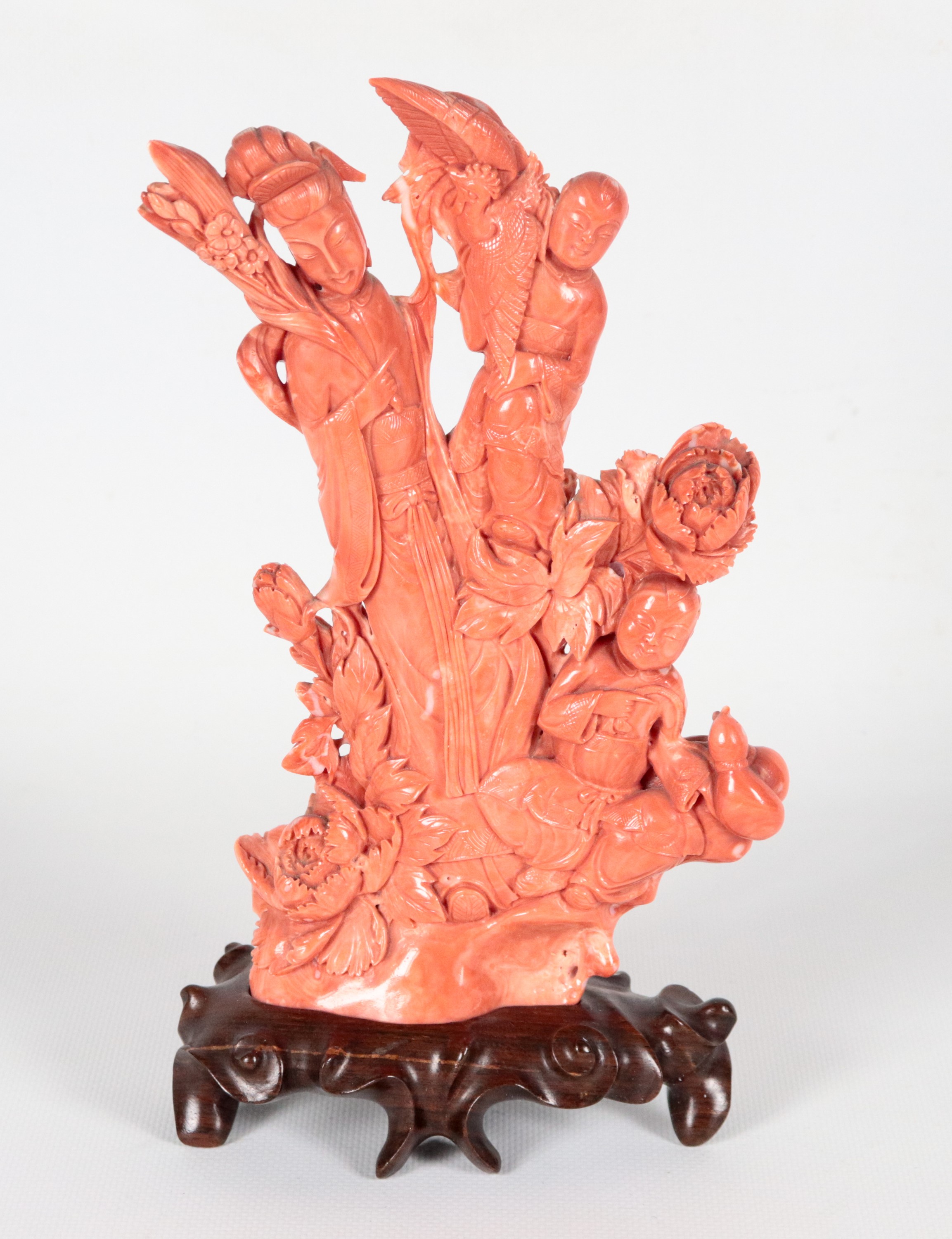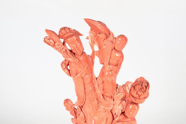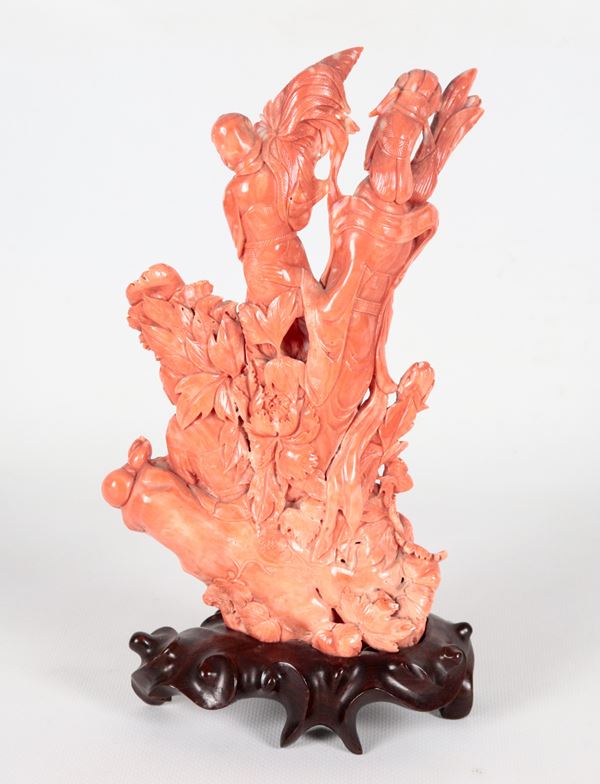 Gruppo in corallo "Figura femminile con fanciulli e fiori" con base in teak