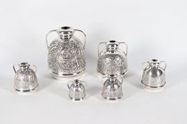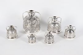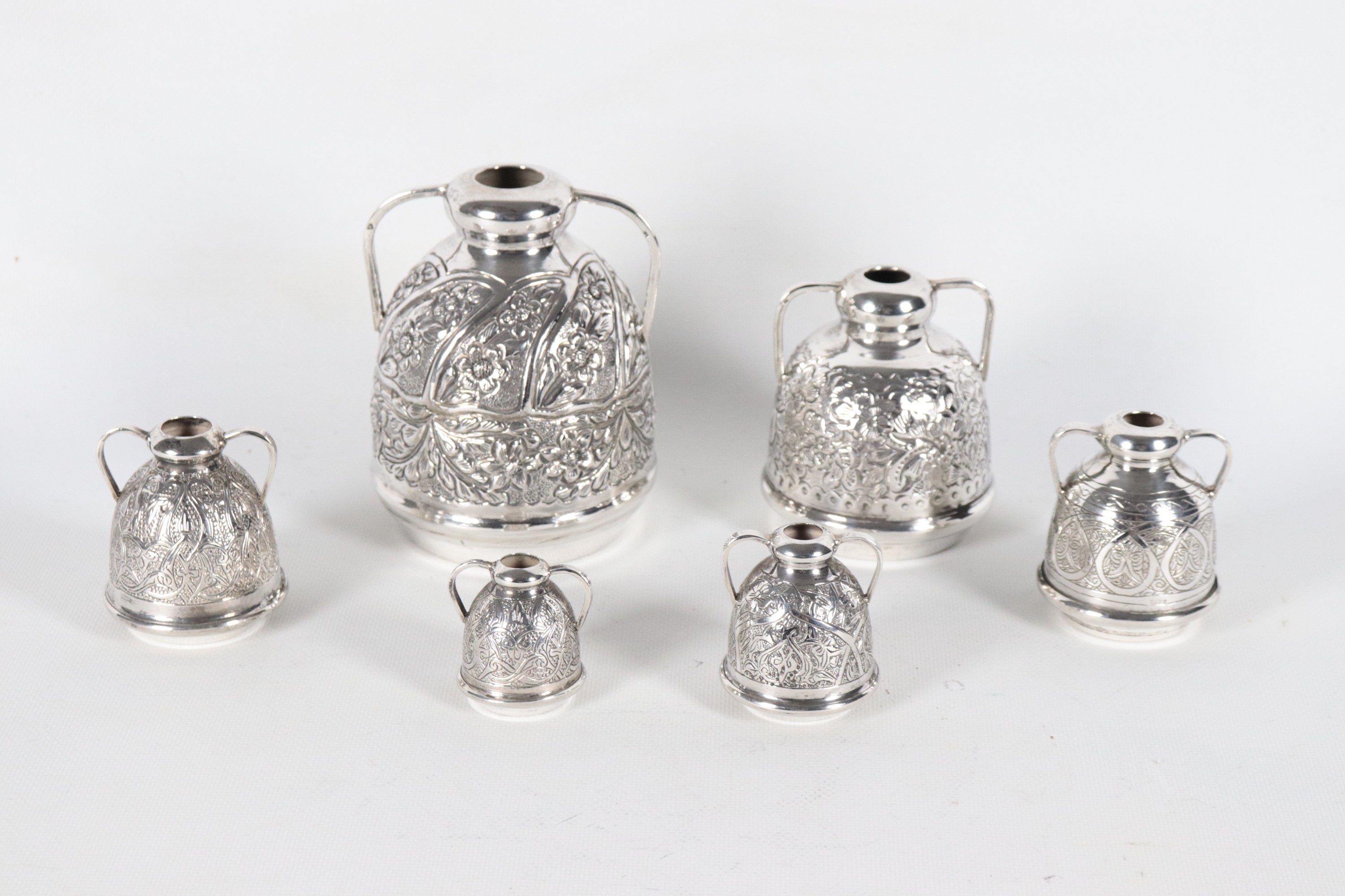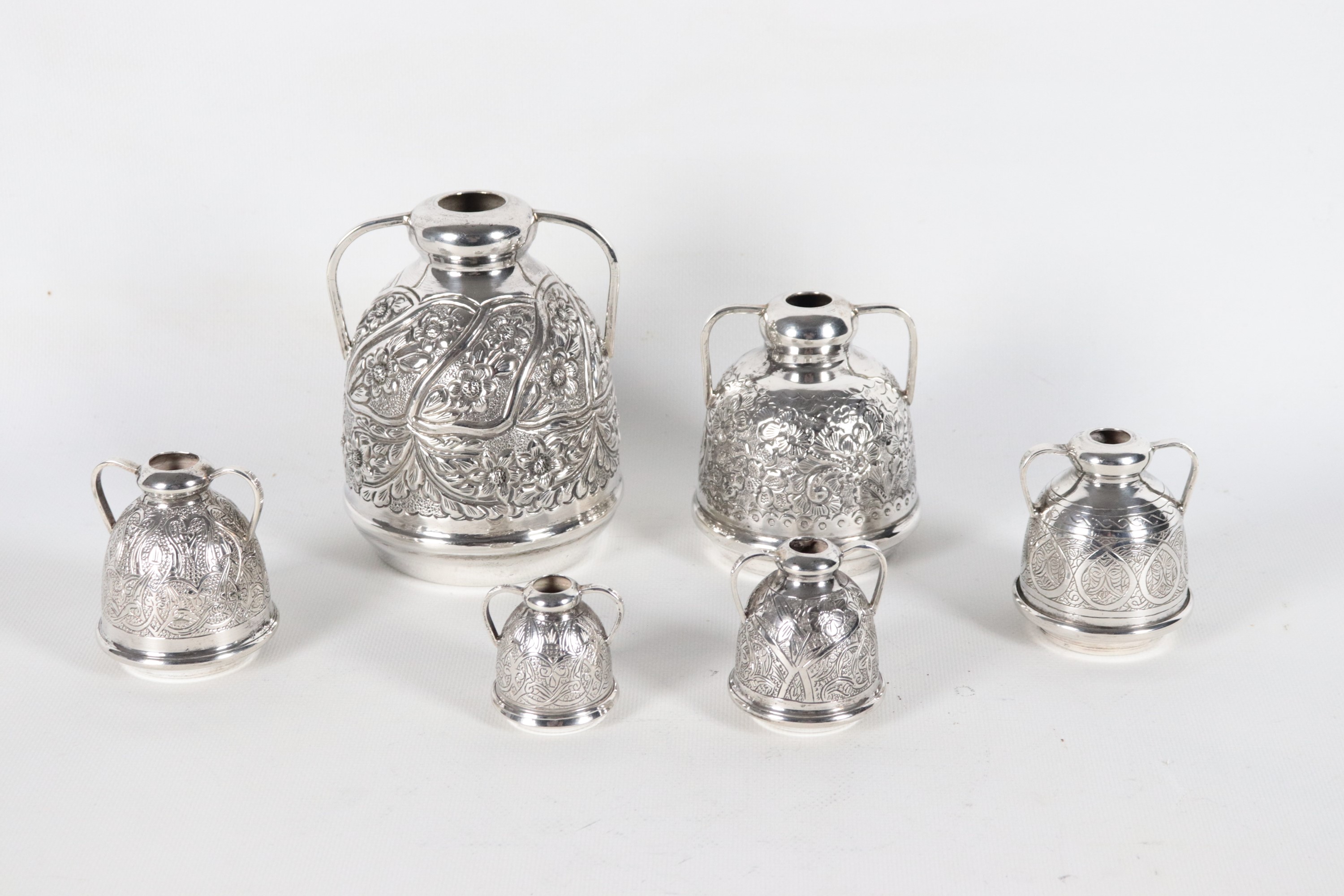 Lotto di sei vasetti a gradazione in argento egiziano cesellato e sbalzato a volute floreali, gr. 755
