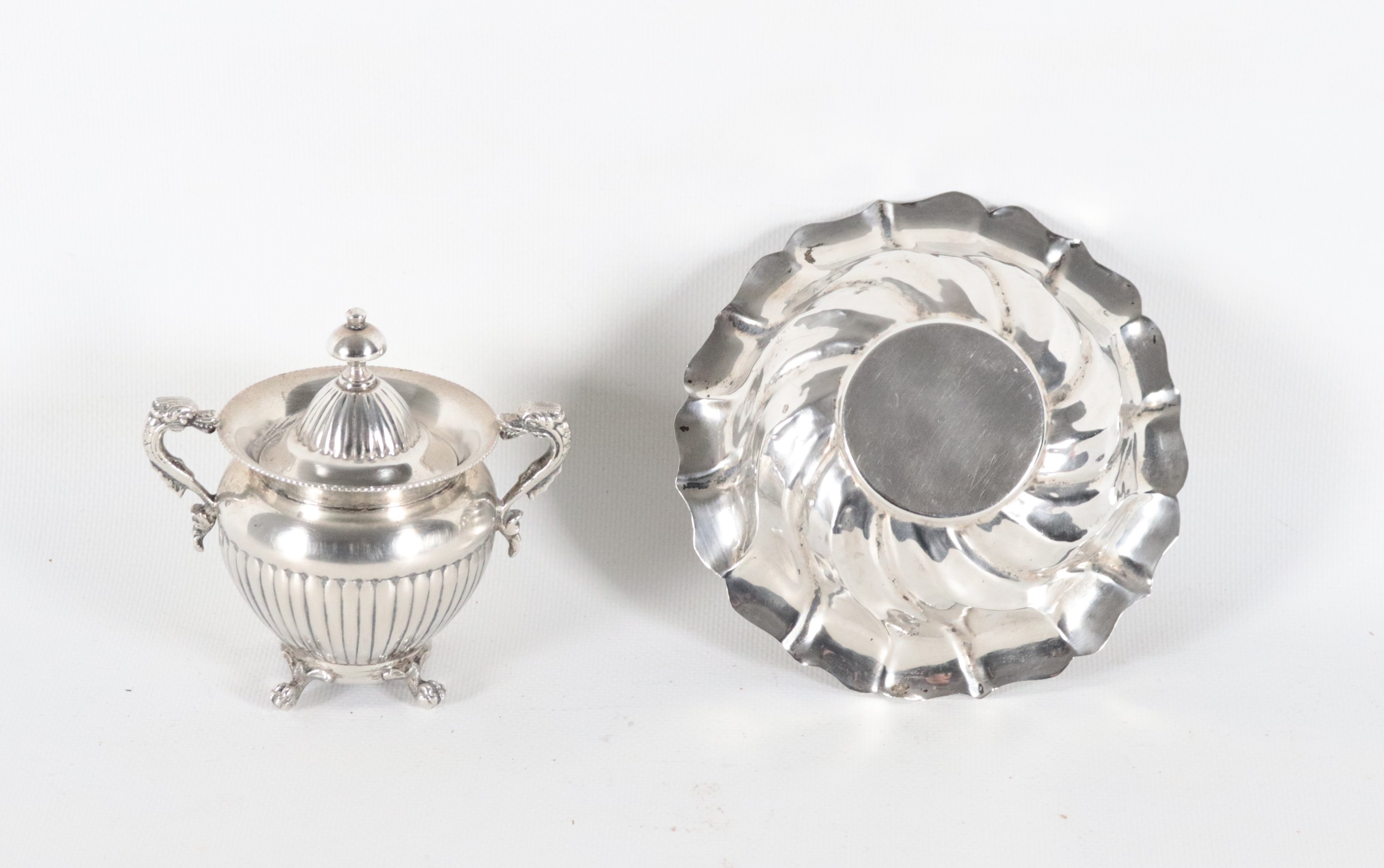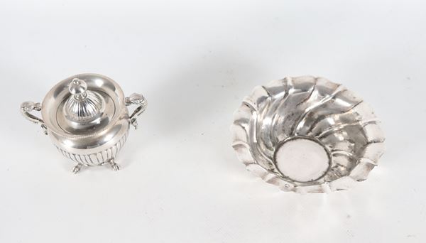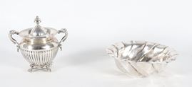 Lotto in argento cesellato e sbalzato di una ciotolina tonda e una piccola zuccheriera (2 pz.), gr. 265