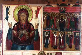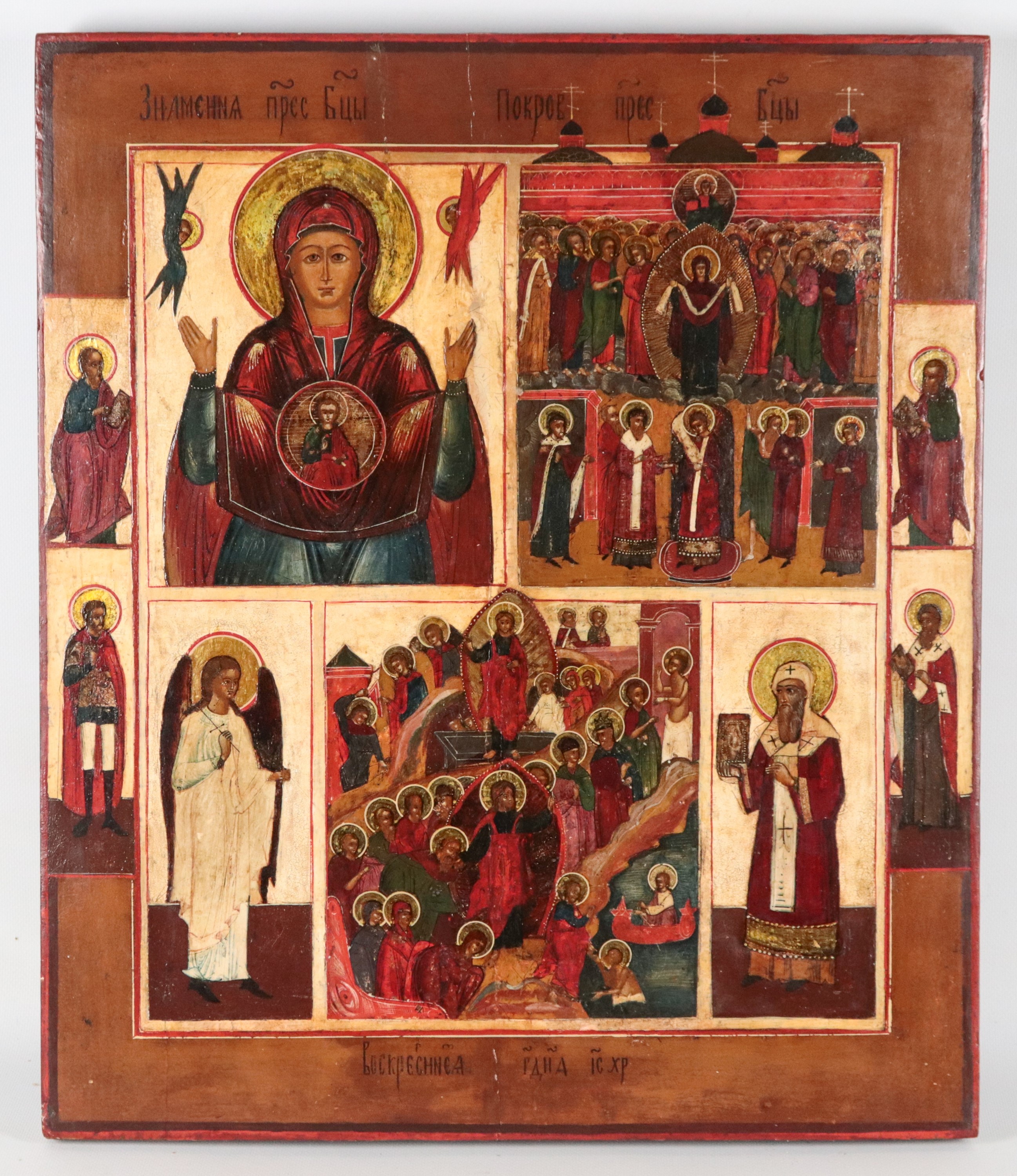 "Madre di Dio del segno, Protezione della Vergine e Discesa agli Inferi e Resurrezione con Angelo Custode, il Profeta Elia e Santi", antica [..]