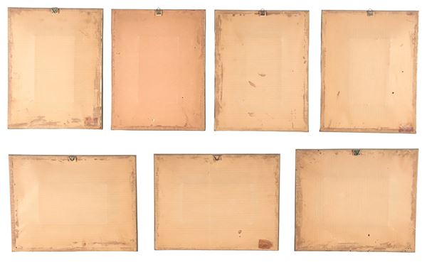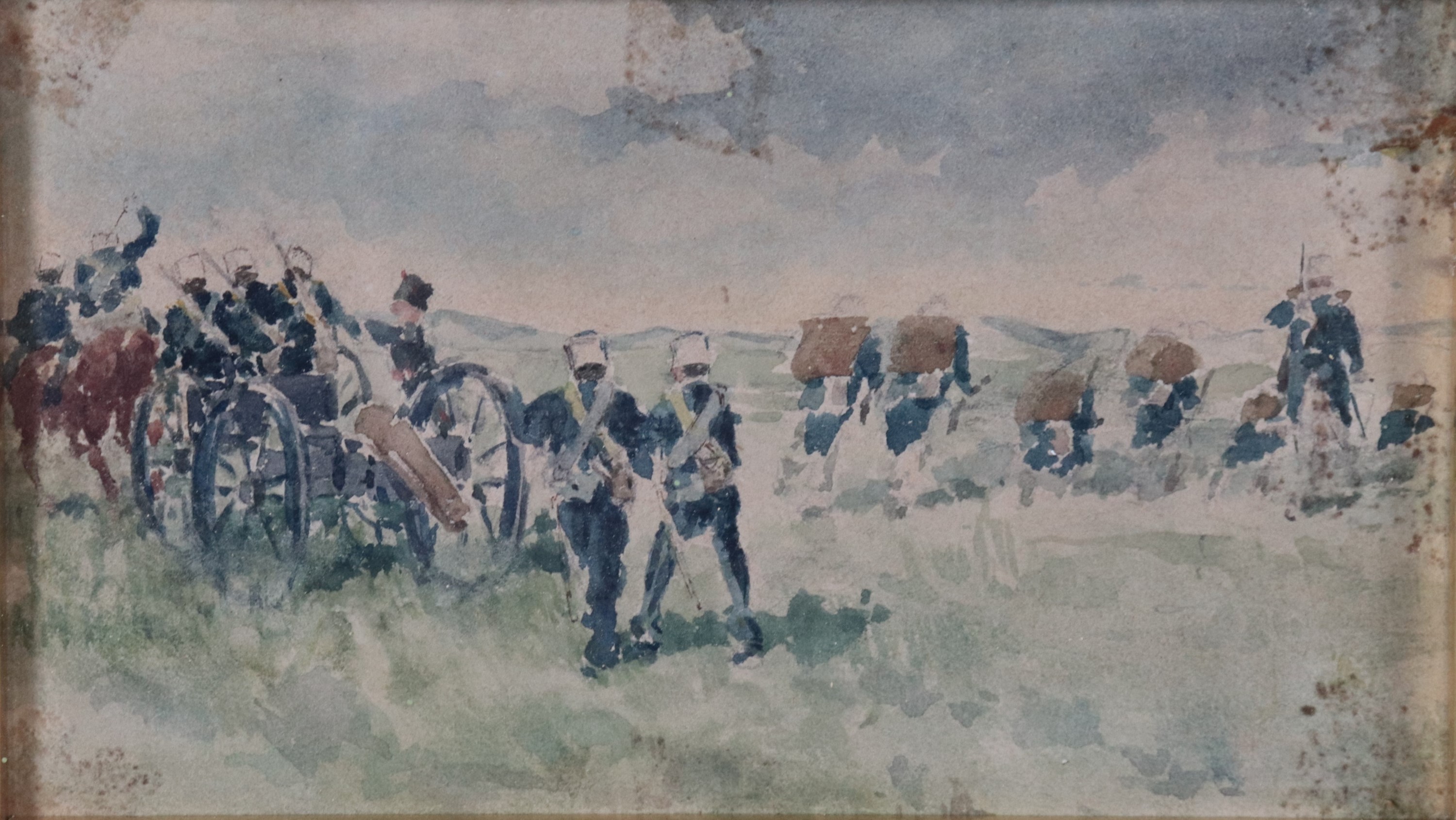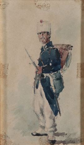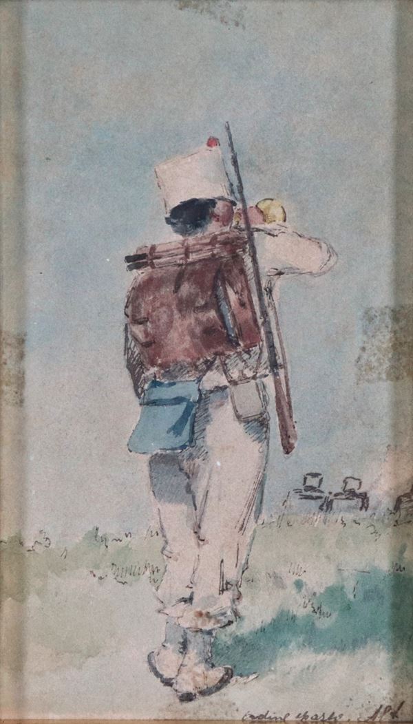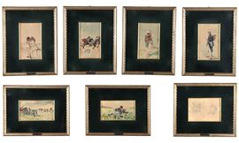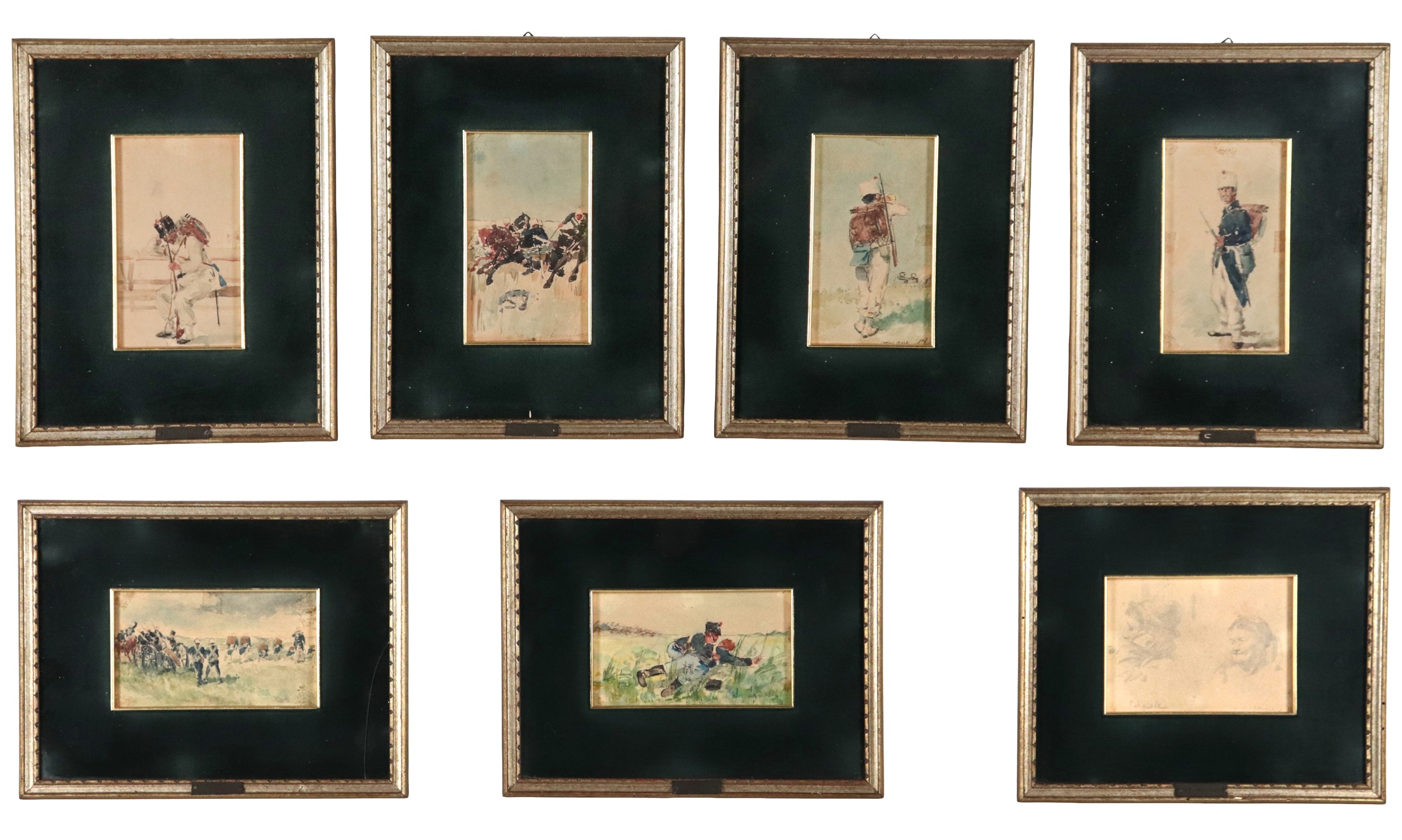 Lotto di sei piccoli acquarelli raff.ti "Soldati" e un piccolo disegno a matita raff.te "Vecchietti"