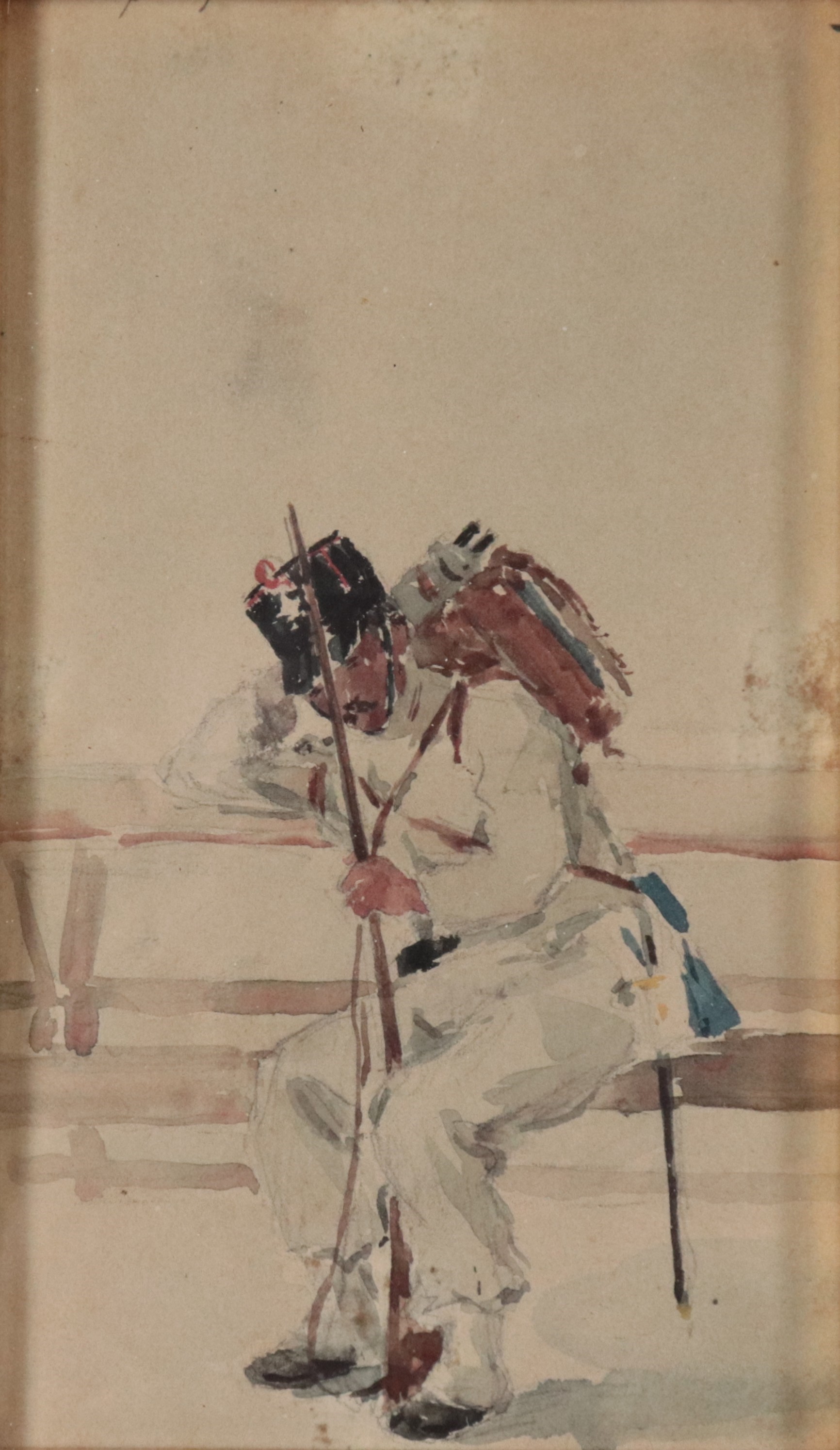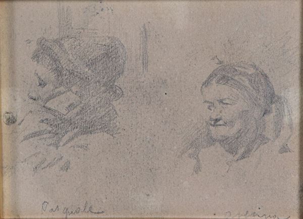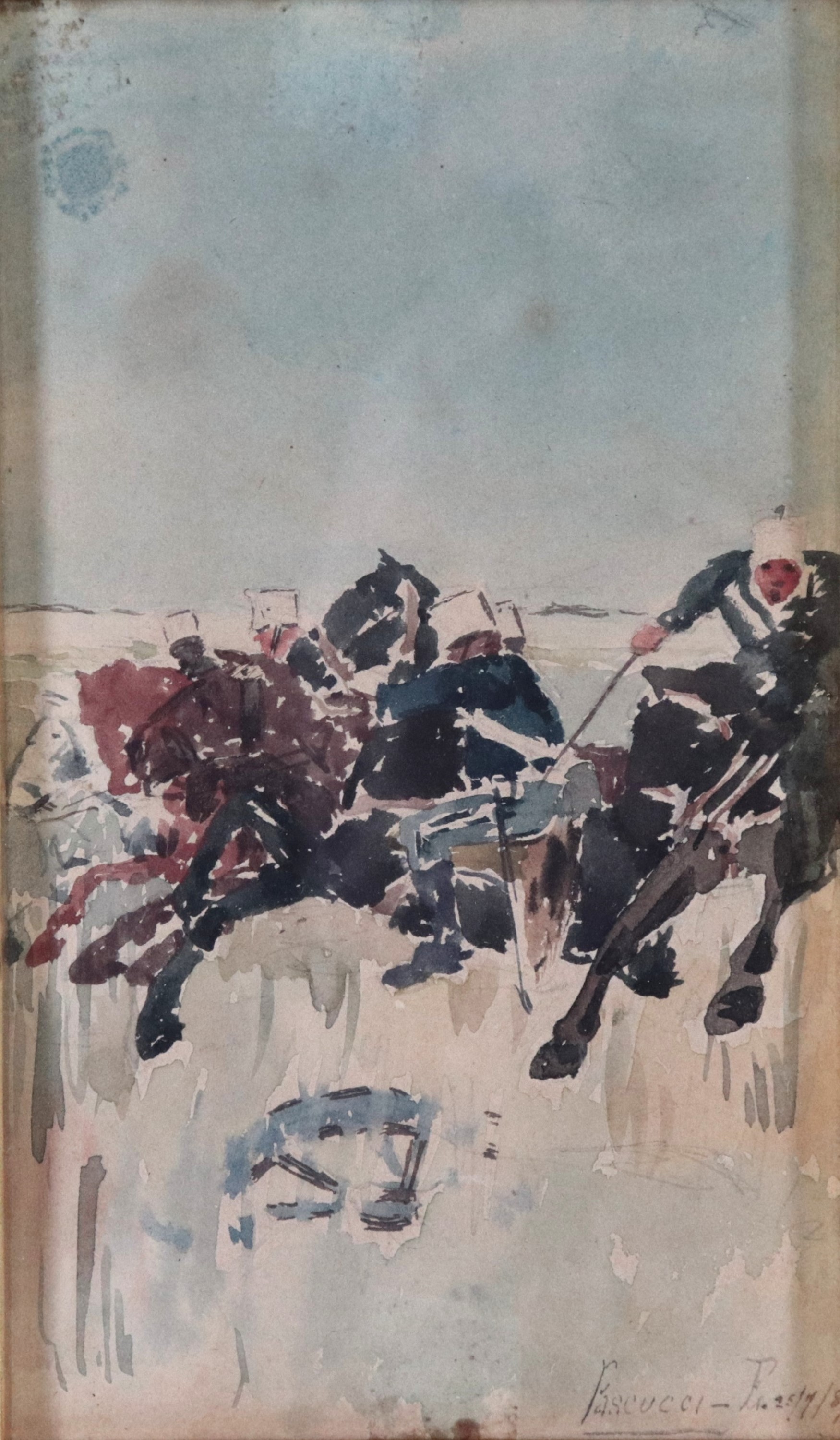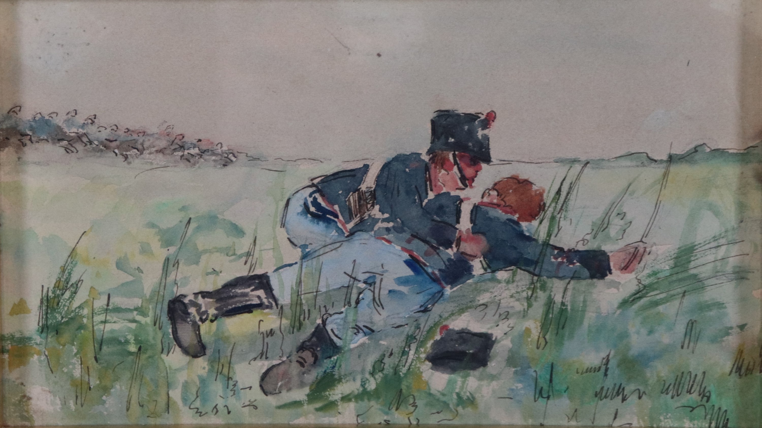 Lotto di sei piccoli acquarelli raff.ti "Soldati" e un piccolo disegno a matita raff.te "Vecchietti"
