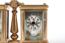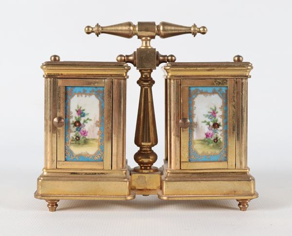Pendola da carrozza doppia con orologio e barometro, in ottone dorato con placchette in porcellana di Sèvres