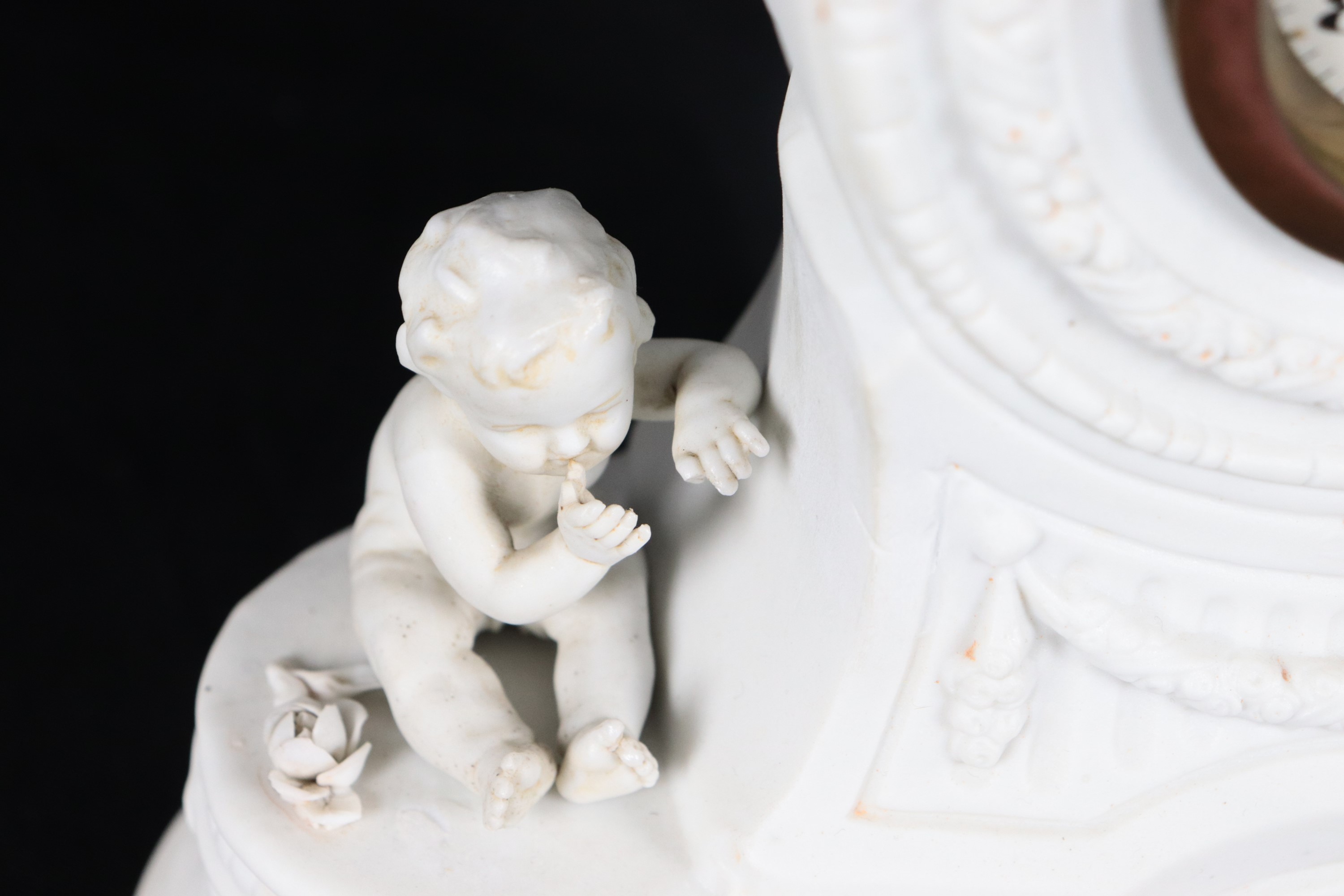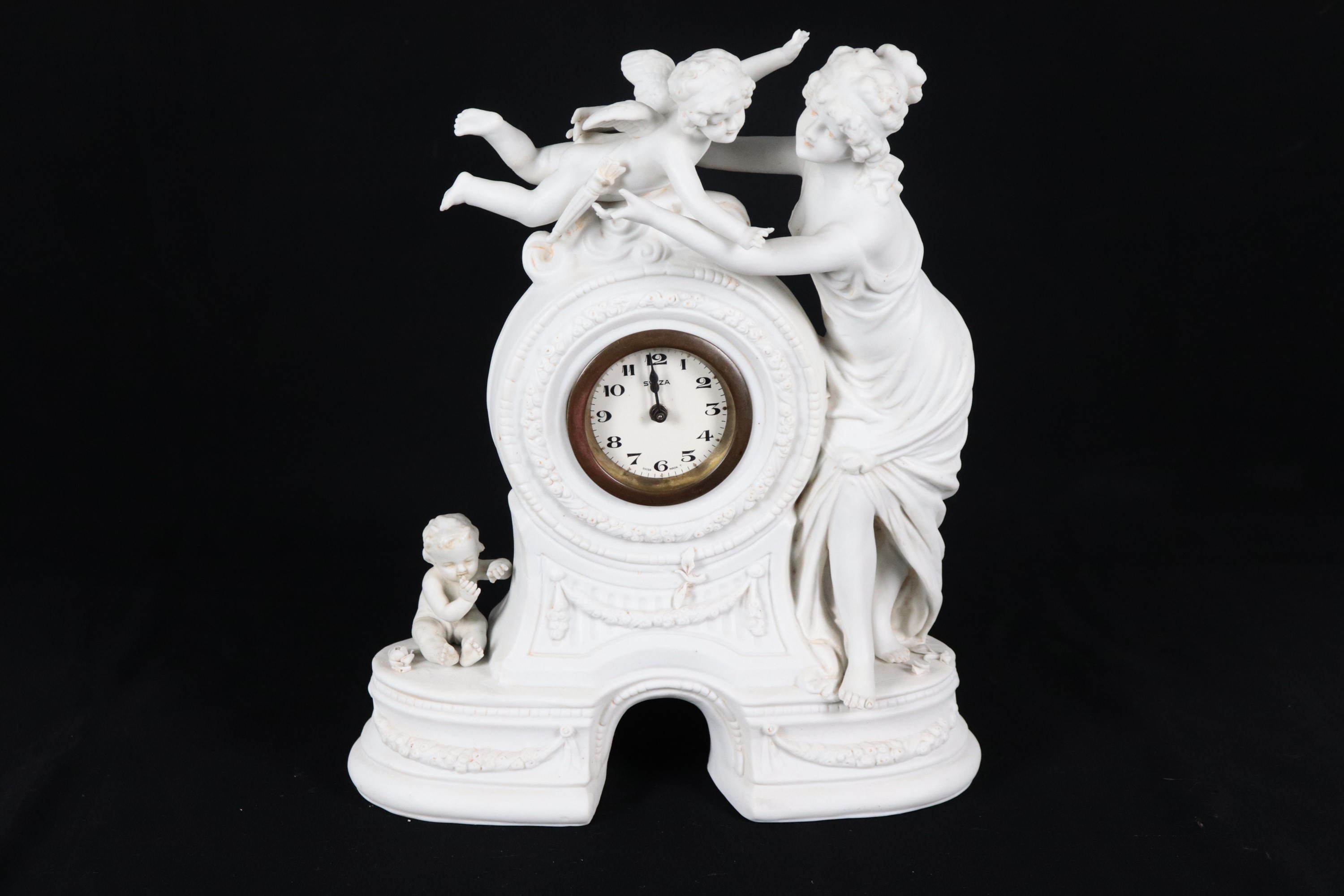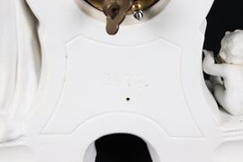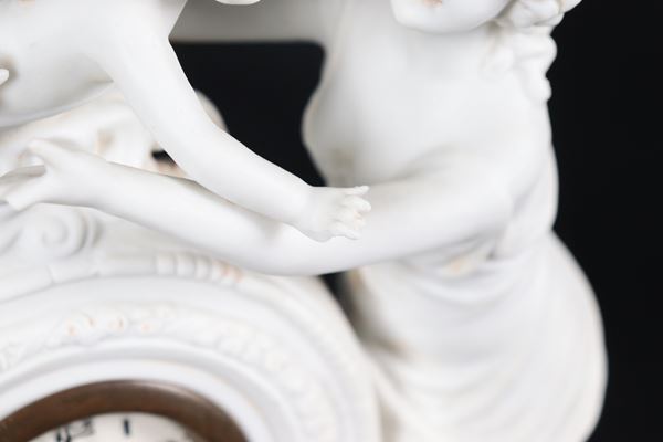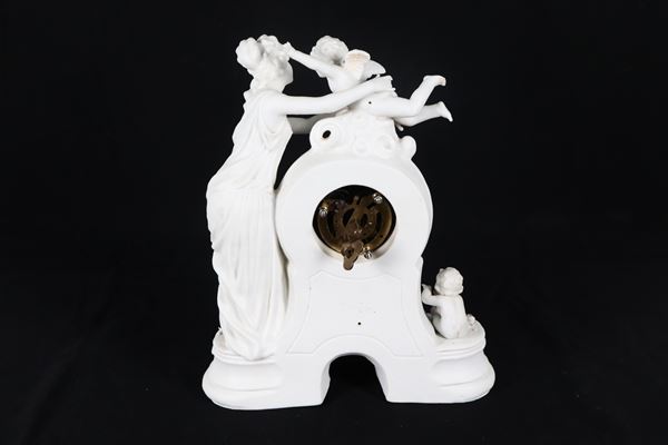 Pendola da tavolo in biscuit bianco, con Diana cacciatrice e cupidi