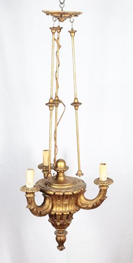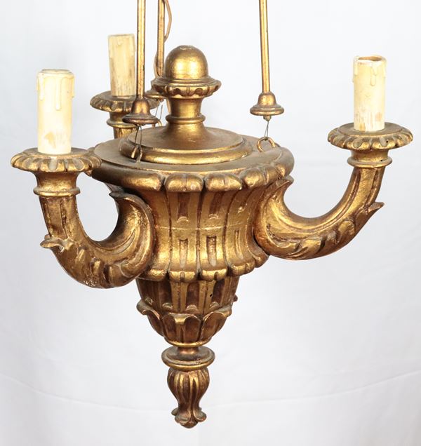 Piccola lanterna da soffitto in legno dorato e intagliato, tre luci