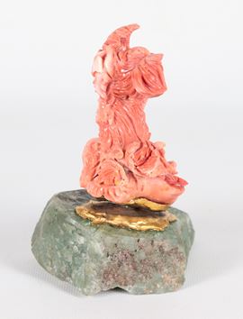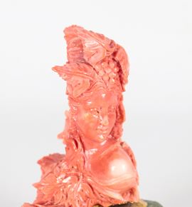 Piccola scultura in corallo "Busto femminile con grappoli d'uva" con base in pietra dura