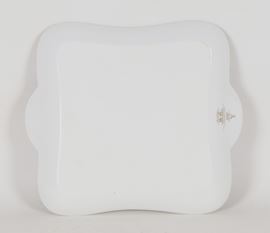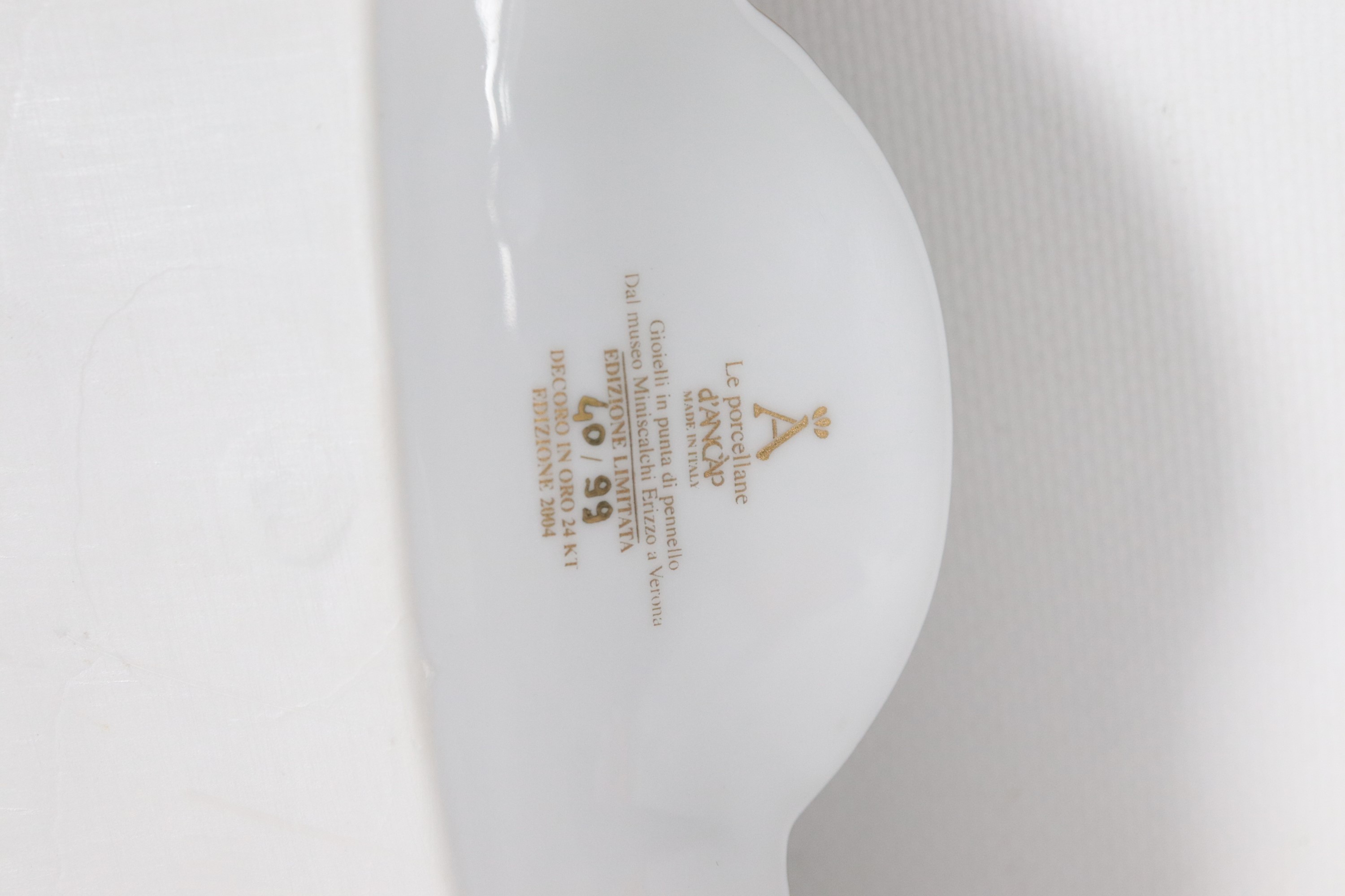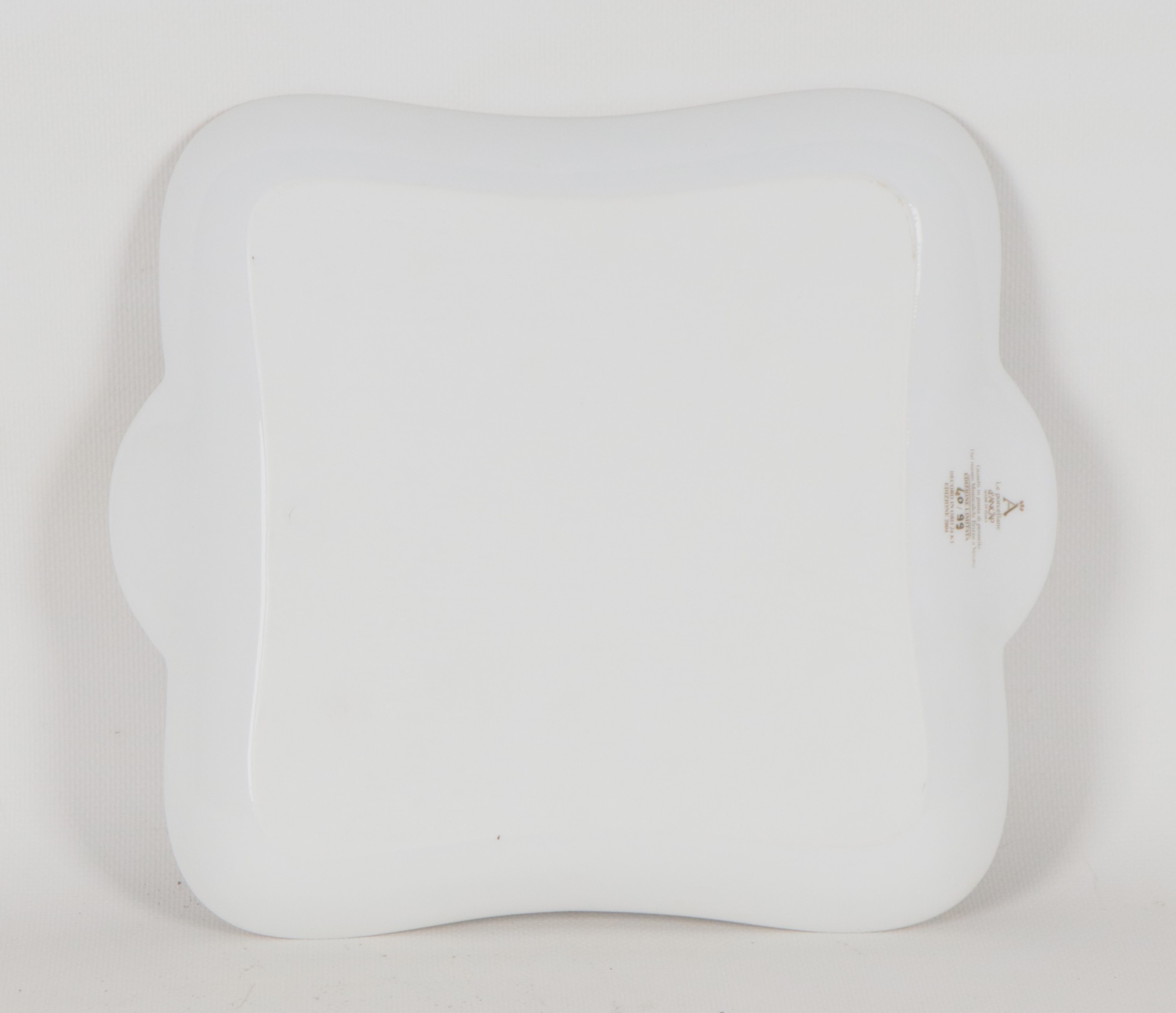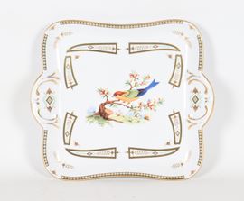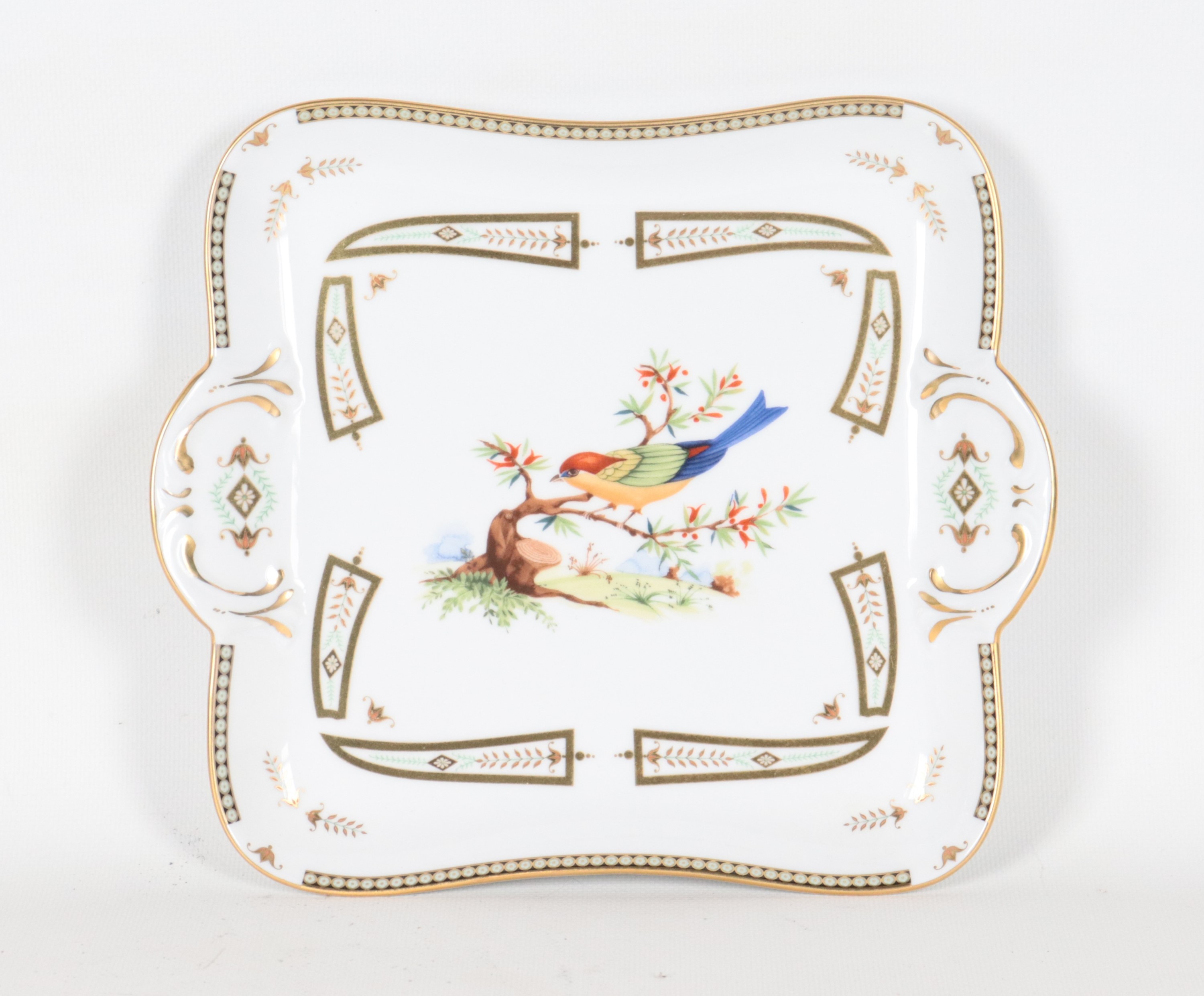 Piccolo piatto da dolce in porcellana bianca smaltata, con al centro decorazione policroma di uccellino su rami